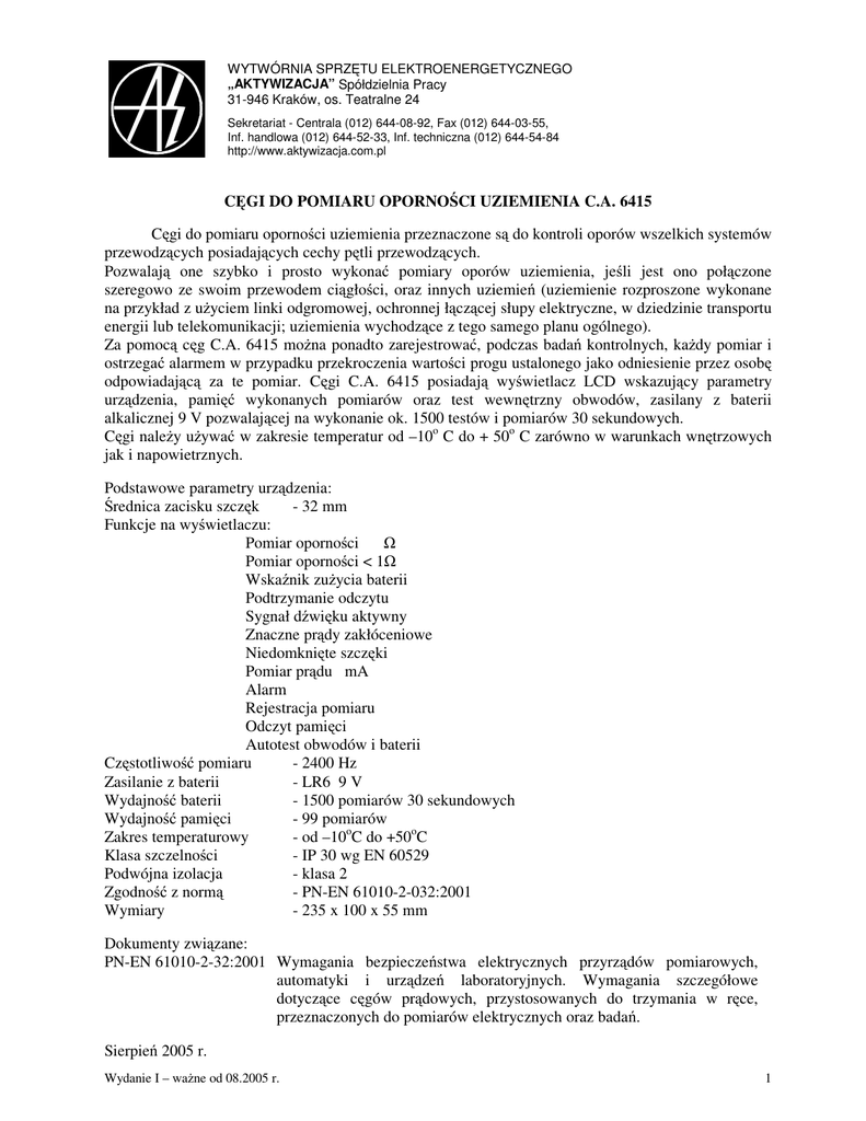 WYTWÓRNIA SPRZ TU ELEKTROENERGETYCZNEGO „AKTYWIZACJA” Spółdzielnia Pracy 31-946 Kraków, os. Teatralne 24 Sekretariat - Centrala (012) 644-08-92, Fax (012) 644-03-55, Inf. handlowa (012) 644-52-33, Inf. techniczna (012) 644-54-84 http://www.aktywizacja.com.pl C GI DO POMIARU OPORNO CI UZIEMIENIA C.A. 6415 C gi do pomiaru oporno ci uziemienia przeznaczone s do kontroli oporów wszelkich systemów przewodz cych posiadaj cych cechy p tli przewodz cych. Pozwalaj one szybko i prosto wykona pomiary oporów uziemienia, je li jest ono poł czone szeregowo ze swoim przewodem ci gło ci, oraz innych uziemie (uziemienie rozproszone wykonane na przykład z u yciem linki odgromowej, ochronnej ł cz cej słupy elektryczne, w dziedzinie transportu energii lub telekomunikacji; uziemienia wychodz ce z tego samego planu ogólnego). Za pomoc c g C.A. 6415 mo na ponadto zarejestrowa , podczas bada kontrolnych, ka dy pomiar i ostrzega alarmem w przypadku przekroczenia warto ci progu ustalonego jako odniesienie przez osob odpowiadaj c za te pomiar. C gi C.A. 6415 posiadaj wy wietlacz LCD wskazuj cy parametry urz dzenia, pami wykonanych pomiarów oraz test wewn trzny obwodów, zasilany z baterii alkalicznej 9 V pozwalaj cej na wykonanie ok. 1500 testów i pomiarów 30 sekundowych. C gi nale y u ywa w zakresie temperatur od –10o C do + 50o C zarówno w warunkach wn trzowych jak i napowietrznych. Podstawowe parametry urz dzenia: rednica zacisku szcz k - 32 mm Funkcje na wy wietlaczu: Pomiar oporno ci Pomiar oporno ci < 1 Wska nik zu ycia baterii Podtrzymanie odczytu Sygnał d wi ku aktywny Znaczne pr dy zakłóceniowe Niedomkni te szcz ki Pomiar pr du mA Alarm Rejestracja pomiaru Odczyt pami ci Autotest obwodów i baterii Cz stotliwo pomiaru - 2400 Hz Zasilanie z baterii - LR6 9 V Wydajno baterii - 1500 pomiarów 30 sekundowych Wydajno pami ci - 99 pomiarów Zakres temperaturowy - od –10oC do +50oC Klasa szczelno ci - IP 30 wg EN 60529 Podwójna izolacja - klasa 2 Zgodno z norm - PN-EN 61010-2-032:2001 Wymiary - 235 x 100 x 55 mm Dokumenty zwi zane: PN-EN 61010-2-32:2001 Wymagania bezpiecze stwa elektrycznych przyrz dów pomiarowych, automatyki i urz dze laboratoryjnych. Wymagania szczegółowe dotycz ce c gów pr dowych, przystosowanych do trzymania w r ce, przeznaczonych do pomiarów elektrycznych oraz bada . Sierpie 2005 r. Wydanie I – wa ne od 08.2005 r. 1 C GI DO POMIARU OPORNO CI UZIEMIENIA C.A. 6415 1. 2. 3. Wydanie I – wa ne od 08.2005 r. Szcz ki pomiarowe Przycisk rozwarcia szcz k Wy wietlacz LCD 2