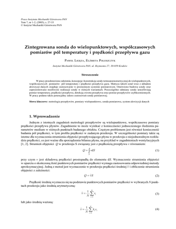 27 Prace Instytutu Mechaniki Górotworu PAN Tom 7, nr 1-2, (2005), s. 27-33 © Instytut Mechaniki Górotworu PAN Zintegrowana sonda do wielopunktowych, współczasowych pomiarów pól temperatury i prędkości przepływu gazu PAWEŁ LIGĘZA, ELŻBIETA POLESZCZYK Instytut Mechaniki Górotworu PAN, ul. Reymonta 27; 30-059 Kraków Streszczenie W pracy przedstawiono założenia, koncepcję i konstrukcję sondy termoanemometrycznej do wielopunktowych, współczasowych pomiarów pól temperatury i prędkości przepływu gazu. Matryca takich sond wraz z układem akwizycji danych znajduje zastosowanie w przenośnym systemie pomiarowym. Omówiono budowę sondy oraz zaprezentowano możliwość realizacji sondy w różnych wariantach. Poszczególne odmiany sondy umożliwiają pomiar temperatury, prędkości przepływu, detekcję zwrotu przepływu oraz pomiar przepływów szybkozmiennych. W pracy podano także potencjalny zakres zastosowań sondy pomiarowej. Słowa kluczowe: metrologia przepływów, pomiary wielopunktowe, sonda pomiarowa, system akwizycji danych 1. Wprowadzenie Jednym z istotnych zagadnień metrologii przepływów są wielopunktowe, współczasowe pomiary prędkości przepływu płynów. Zagadnienie to może wynikać z konieczności jednoczesnego śledzenia parametrów medium w różnych punktach badanego obiektu. Częstym problemem jest również konieczność badania pól prędkości, w tym profilu prędkości w zadanym przekroju. W szczególności pomiary takie są istotne dla wyznaczenia strumienia objętości przepływającego płynu w przekroju o niejednorodnym rozkładzie prędkości, co jest ważne dla sporządzenia bilansu płynu, na przykład w zagadnieniach wentylacyjnych [1, 2]. Strumień objętości Q w przekroju S związany jest z prędkością przepływu v równaniem: Q = vdS (1) S przy czym v jest składową prędkości prostopadłą do elementu dS. Wyznaczenie strumienia objętości w oparciu o skończoną ilość punktowych pomiarów prędkości wymaga zastosowania odpowiedniej metody aproksymacyjnej. Jedną z metod jest wyznaczenie w przekroju prędkości średniej –v i obliczenie strumienia objętości z zależności: Q = vS (2) Prędkość średnią wyznacza się na podstawie punktowych pomiarów prędkości w wybranych N punktach przekroju jako średnią arytmetyczną: v= 1 N N åv i =1 i (3) lub jako średnią ważoną: v= 1 N N åk v i =1 i i (4) 28 Paweł Ligęza, Elżbieta Poleszczyk gdzie: ki – wagi poszczególnych prędkości punktowych wyznaczone na drodze rozważań teoretycznych lub empirycznie. Możliwy jest też podział badanego przekroju na N przekrojów cząstkowych S1 do SN i wyznaczenie strumienia objętości jako sumy strumieni w wybranych przekrojach: Q= N åQ i =1 (5) i W takim przypadku po umieszczeniu w każdym przekroju cząstkowym czujnika pomiaru prędkości możliwa jest estymacja strumienia objętości przepływającego płynu z zależności: Q= N åv S i =1 i i (6) W metodach tych pomiar strumienia objętości dokonywany jest na podstawie punktowych pomiarów prędkości. W przypadku gdy prędkość przepływu jest zmienna zarówno w przestrzeni jak i w czasie konieczne jest zastosowanie metody umożliwiającej pomiary punktowe i spełniającej zadane kryteria dynamiczne. Metodą taką może być metoda termoanemometryczna [3]. W pracy omówiono konstrukcję sondy termoanemometrycznej do zastosowań w systemie wielopunktowych pomiarów pól temperatury i prędkości przepływu gazu. Przy opracowaniu koncepcji systemu pomiarowego przyjęto następujące założenia: ▪ sondy umożliwiające pomiar zbliżony do punktowego, ▪ niewielka inwazyjność sond pomiarowych, ▪ możliwość dokonywania pomiarów dynamicznych, ▪ przystosowanie sond do pracy w warunkach przemysłowych, ▪ zastosowanie platynowo-ceramicznych cienkowarstwowych czujników pomiarowych, ▪ stałotemperaturowy tryb pracy czujników pomiarowych, ▪ indywidualna kompensacja temperaturowa każdej sondy pomiarowej, ▪ integracja sondy z elektronicznym układem przetwarzania sygnału pomiarowego, ▪ wspólny system akwizycji sygnałów pomiarowych i zasilania sond. W skład systemu wchodzą sondy termoanemometryczne zintegrowane z układem przetwarzania sygnału oraz układ akwizycji danych pomiarowych z poszczególnych sond. Rozmieszczenie sond pomiarowych w wybranych punktach badanego przepływu, a następnie rejestracja i przetwarzanie sygnałów z poszczególnych sond umożliwia współczasowy pomiar pola temperatury i prędkości oraz wyznaczenie strumienia objętościowego przepływu płynu. Poza pomiarem temperatury i prędkości opracowano również warianty sondy do detekcji zwrotu przepływu oraz do pomiarów przepływów szybkozmiennych. 2. Konstrukcja sondy pomiarowej Konstrukcja sondy powstała w oparciu o termoanemometrycznego układu pomiarowego, w którym w głowicy pomiarowej czujnik przyłączony jest bezpośrednio do mostka stałotemperaturowego i układu przetwarzania sygnału. Układ elektroniczny realizowany jest w technologii SMT, co pozwala na uzyskanie niewielkich rozmiarów głowicy, przy dobrych parametrach elektrycznych i termicznych [4]. Na wspólnej płytce drukowanej z układem elektronicznym montowane są czujniki termoanemometryczne. Dodatkowo w głowicy z kompensacją temperaturową [5] umieszczony jest czujnik pomiaru temperatury. Sygnałem wyjściowym z głowicy jest napięcie zależne od mierzonej prędkości przepływu płynu. Takie rozwiązanie pozwala na uzyskanie dobrych parametrów metrologicznych układu przy zwiększonej odporności na zakłócenia i niewielkim koszcie głowicy pomiarowej. Umożliwia to wygodne prowadzenie pomiarów wielopunktowych przy zastosowaniu wielu głowic. Schemat ideowy sondy pomiarowej przedstawiono na rys. 1. W zależności od rodzaju elementów pomiarowych, obsadzenia i wartości poszczególnych elementów elektronicznych realizowane są różne warianty sondy. Możliwa jest realizacja uk