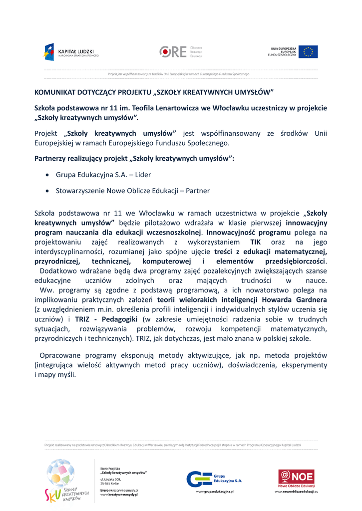 KOMUNIKAT DOTYCZĄCY PROJEKTU „SZKOŁY KREATYWNYCH UMYSŁÓW” Szkoła podstawowa nr 11 im. Teofila Lenartowicza we Włocławku uczestniczy w projekcie „Szkoły kreatywnych umysłów”. Projekt „Szkoły kreatywnych umysłów” jest współfinansowany ze środków Unii Europejskiej w ramach Europejskiego Funduszu Społecznego. Partnerzy realizujący projekt „Szkoły kreatywnych umysłów”: Grupa Edukacyjna S.A. – Lider Stowarzyszenie Nowe Oblicze Edukacji – Partner Szkoła podstawowa nr 11 we Włocławku w ramach uczestnictwa w projekcie „Szkoły kreatywnych umysłów” będzie pilotażowo wdrażała w klasie pierwszej innowacyjny program nauczania dla edukacji wczesnoszkolnej. Innowacyjność programu polega na projektowaniu zajęć realizowanych z wykorzystaniem TIK oraz na jego interdyscyplinarności, rozumianej jako spójne ujęcie treści z edukacji matematycznej, przyrodniczej, technicznej, komputerowej i elementów przedsiębiorczości. Dodatkowo wdrażane będą dwa programy zajęć pozalekcyjnych zwiększających szanse edukacyjne uczniów zdolnych oraz mających trudności w nauce. Ww. programy są zgodne z podstawą programową, a ich nowatorstwo polega na implikowaniu praktycznych założeń teorii wielorakich inteligencji Howarda Gardnera (z uwzględnieniem m.in. określenia profili inteligencji i indywidualnych stylów uczenia się uczniów) i TRIZ - Pedagogiki (w zakresie umiejętności radzenia sobie w trudnych sytuacjach, rozwiązywania problemów, rozwoju kompetencji matematycznych, przyrodniczych i technicznych). TRIZ, jak dotychczas, jest mało znana w polskiej szkole. Opracowane programy eksponują metody aktywizujące, jak np. metoda projektów (integrująca wielość aktywnych metod pracy uczniów), doświadczenia, eksperymenty i mapy myśli. 48 zrekrutowanych szkół podstawowych (po 3 z każdego województwa Polski) przez 2 lata szkolne 2013/14 i 2014/2015 będzie pilotażowo wdrażało (upowszechniało) opracowane programy. W każdej szkole w 1. roku szkolnym upowszechniania uczestniczyć będzie 1 oddział kl. I, a w drugim – kl. II (w ramach kontynuacji) i nowy oddział kl. I. Program nauczania wdrażany będzie na zajęciach obowiązkowych. Zajęcia pozalekcyjne zwiększające szanse edukacyjne uczniów zdolnych (typ 1) oraz uczniów mających trudności w nauce (typ 2) realizowane będą na podstawie autorskich scenariuszy nauczycieli (po 120 godz. na oddział w danym roku szkolnym do podziału wg potrzeb uczniów przez nauczycieli) w oparciu o wypracowane w projekcie 2 programy. Co roku Partnerzy organizować będą KONKURS jako formę rozwijania kompetencji przedsiębiorczych uczniów (w I roku dla kl. I, w II – dla kl. I i II oddzielnie), gdzie nagrodami jest sfinansowanie dla 3 najlepszych klas na danym poziomie kilkudniowych wyjazdów edukacyjnych (dla rodzica i ucznia bez kosztów) W ramach projektu szkoły zostaną wyposażone w specjalnie dobrane środki dydaktyczne i sprzęt IT. Pozwolą one na stworzenie w szkołach pracowni sanlukańskich. Nazwa pracowni nawiązuje do włoskiej Accademia di San Luca, w której – po raz pierwszy na świecie – w XVI w. zastosowano metodę projektu. Potrzeba stosowania jej w procesie edukacyjnym wynika m.in. z wyzwań XXI wieku jakie niesie za sobą rozwój cywilizacyjny, gospodarczy, co zmusza do kształtowania od najmłodszych lat postaw-umiejętności inicjatywności, przedsiębiorczości i odpowiedzialności za swoją pracę. Specjalnie dobrany sprzęt IT i pomoce dydaktyczne pozwolą uczniom „doświadczać, eksperymentować” zgodnie z założeniami projektu. Więcej informacji o projekcie na: www.kreatywneumysly.pl.