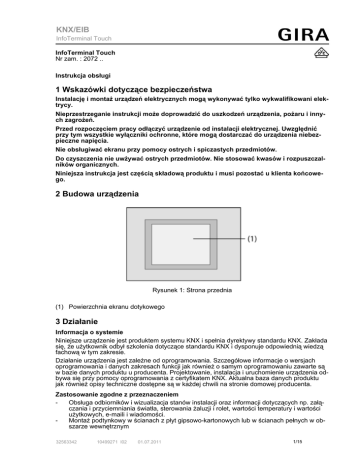 KNX/EIB InfoTerminal Touch InfoTerminal Touch Nr zam. : 2072 .. Instrukcja obsługi 1 Wskazówki dotyczące bezpieczeństwa Instalację i montaż urządzeń elektrycznych mogą wykonywać tylko wykwalifikowani elektrycy. Nieprzestrzeganie instrukcji może doprowadzić do uszkodzeń urządzenia, pożaru i innych zagrożeń. Przed rozpoczęciem pracy odłączyć urządzenie od instalacji elektrycznej. Uwzględnić przy tym wszystkie wyłączniki ochronne, które mogą dostarczać do urządzenia niebezpieczne napięcia. Nie obsługiwać ekranu przy pomocy ostrych i spiczastych przedmiotów. Do czyszczenia nie uwżywać ostrych przedmiotów. Nie stosować kwasów i rozpuszczalników organicznych. Niniejsza instrukcja jest częścią składową produktu i musi pozostać u klienta końcowego. 2 Budowa urządzenia Rysunek 1: Strona przednia (1) Powierzchnia ekranu dotykowego 3 Działanie Informacja o systemie Niniejsze urządzenie jest produktem systemu KNX i spełnia dyrektywy standardu KNX. Zakłada się, że użytkownik odbył szkolenia dotyczące standardu KNX i dysponuje odpowiednią wiedzą fachową w tym zakresie. Działanie urządzenia jest zależne od oprogramowania. Szczegółowe informacje o wersjach oprogramowania i danych zakresach funkcji jak również o samym oprogramowaniu zawarte są w bazie danych produktu u producenta. Projektowanie, instalacja i uruchomienie urządzenia odbywa się przy pomocy oprogramowania z certyfikatem KNX. Aktualna baza danych produktu jak również opisy techniczne dostępne są w każdej chwili na stronie domowej producenta. Zastosowanie zgodne z przeznaczeniem Obsługa odbiorników i wizualizacja stanów instalacji oraz informacji dotyczących np. załączania i przyciemniania światła, sterowania żaluzji i rolet, wartości temperatury i wartości użytkowych, e-maili i wiadomości. Montaż podtynkowy w ścianach z płyt gipsowo-kartonowych lub w ścianach pełnych w obszarze wewnętrznym 32563342 10499271 I02 01.07.2011 1/15 KNX/EIB InfoTerminal Touch Właściwości produktu Podświetlany programowalny kolorowy ekran graficzny TFT, 320x240 punktów, 4096 kolorów Ekran dotykowy, obsługa poprzez dotyk palcami na powierzchni monitora. Możliwy montaż poziomy lub pionowy Złącze USB to szybkiego programowania przy pomocy PC Maks. 1600 funkcji obsługowych, 400 funkcji wskaźnikowych Maks. 50 stron Maks. 24 sceny świetlne z 32 elementami wykonawczymi Tygodniowy zegar sterujący z 16 programami czasowymi każdorazowo w 8 czasach przełączenia (opcjonalnie funkcja Astro i funkcja losowa. Maks. 50 komunikatów usterek, usterka zbiorcza Instalacja sygnalizacyjna z dwoma obszarami aktywacji ochrony Funkcja blokady - umożliwia czyszczenie wyświetlacza Obszary chronione hasłem Maks. 80 bramek logicznych, 12 multiplekserów Rysowanie i prezentacja wydarzeń, wartości użytkowych odbiorników, przebiegów itp. Dodatkowe funkcje przy podłączeniu do sieci IP/Ethernet: Zarządzanie 1 do 5 skrzynek poczty e-mail i wyświetlanie tekstów poczty. Wskazanie i zarządzanie maks. 8 kanałami RSS Obsługa zdalna przy pomocy oprogramowania PC 4 Obsługa Elementy ekranu monitora Funkcjonalność jak również pojawiające się wskazania na powierzchni ekranu monitora zależne są od programowania i z tego względu są zróżnicowane dla każdej instalacji. Elementy możliwe na stronie ekranu podają informacje o statusie, przedstawiają wartości lub informacje, lub zaprogramowane są dla celów obsługowych. Rysunek 2: Elementy ekranu (2) (3) (4) (5) (6) Linijka statusu Strona ekranu Element obsługowy lub wskaźnikowy Pasek przewijania Przyciski funkcyjne 32563342 10499271 I02 01.07.2011 2/15 KNX/EIB InfoTerminal Touch Powierzchnia wrażliwa na dotyk Ekran monitora posiada powierzchnię wrażliwą na dotyk, nazywaną ekranem dotykowym. Obsługa urządzenia następuje poprzez dotykanie palcami powierzchni ekranu lub poprzez specjalne o ołówki do obsługi ekranów dotykowych (nie zawarte w dostawie). i Nie obsługiwać ekranu przy pomocy ostrych i spiczastych przedmiotów. Linijka statusu Jeżeli linia statusu (2) jest zaprogramowana, to będzie ona widoczna na górnym brzegu ekranu monitora. Linia statusu może wskazywać do dziesięciu elementów: Wskazanie wydarzeń Usterka ogólna Wskazanie wartości Data, godzina i teksty ASCII Strona ekranu Na stronach ekranu (3) wyświetlane są elementy obsługowe i wskaźnikowe (4) lub rysunki. Elementy wskaźnikowe (4) wskazują stany komponentów instalacji. Elementy obsługowe służą do nawigacji lub symbolizują sterowane urządzenia, komponenty i funkcje. Na każdej stronie ekranu (3) mogą być także umieszczane obrazy tła. Pasek przewijania Przy pomocy paska przewijania (5) można przesuwać zawartość jednej lub wielu stron. Poprzez użycie przycisków strzałek można przechodzić do innych elementów wskaźnikowych. Przyciski z podwójnymi strzałkami: widoczne tylko wtedy, jeżeli istnieją powiązane z nimi strony. Po użyciu wskazywana jest powiązana strona. Przyciski strzałek: przechodzenie do innych elementów wskaźnikowych aktualnej strony. Przyciski funkcyjne Dla każdego elementu obsługowego (4) dostępne są maks. 4 przyciski funkcyjne (6), które po wyborze elementu obsługowego mogą być wskazywane i obsługiwane. Wybór funkcji/odbiornika Aby obsługiwać urządzenie należy je najpierw wybrać. o Wybrać stronę zawierającą żądany element obsługowy lub wskaźnikowy. o Wybrać palcem żądany element. Ekran monitora zmienia wskazanie - lub Wskazywane są odpowiednie przyciski funkcyjne. Funkcja może być obsługiwana. Wybór funkcji lub odbiornika Obsługa zależy od rodzaju funkcji. Wybrana funkcja musi być odpowiednia funkcja i wskazane muszą zostać przyciski funkcyjne. o Przełączenie: na krótko nacisnąć odpowiedni przycisk funkcyjny. o Regulacja oświetlenia: przez dłuższy czas użyć odpowiedniego przycisku funkcyjnego. o Opuszczanie żaluzji: przez dłuższy czas u