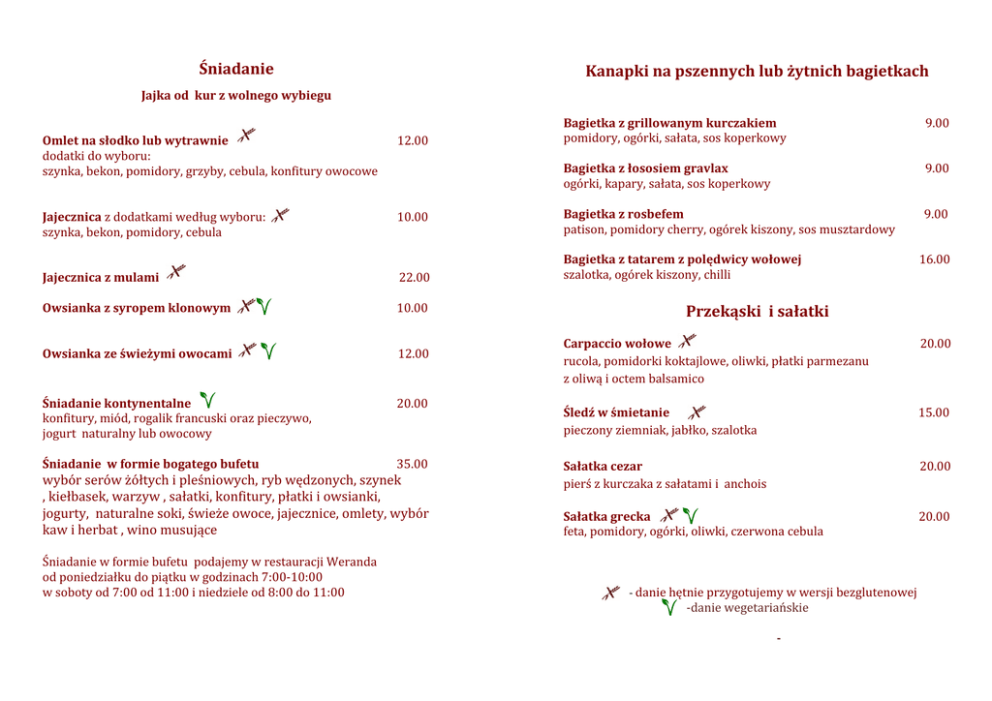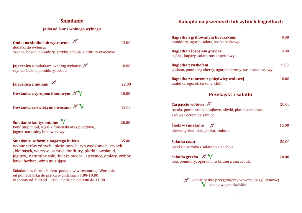 Śniadanie Kanapki na pszennych lub żytnich bagietkach Jajka od kur z wolnego wybiegu Omlet na słodko lub wytrawnie dodatki do wyboru: szynka, bekon, pomidory, grzyby, cebula, konfitury owocowe 12.00 Jajecznica z dodatkami według wyboru: szynka, bekon, pomidory, cebula 10.00 Jajecznica z mulami 22.00 Owsianka z syropem klonowym 10.00 Owsianka ze świeżymi owocami 12.00 Śniadanie kontynentalne konfitury, miód, rogalik francuski oraz pieczywo, jogurt naturalny lub owocowy 20.00 Śniadanie w formie bogatego bufetu 35.00 wybór serów żółtych i pleśniowych, ryb wędzonych, szynek , kiełbasek, warzyw , sałatki, konfitury, płatki i owsianki, jogurty, naturalne soki, świeże owoce, jajecznice, omlety, wybór kaw i herbat , wino musujące Śniadanie w formie bufetu podajemy w restauracji Weranda od poniedziałku do piątku w godzinach 7:00-10:00 w soboty od 7:00 od 11:00 i niedziele od 8:00 do 11:00 Bagietka z grillowanym kurczakiem pomidory, ogórki, sałata, sos koperkowy 9.00 Bagietka z łososiem gravlax ogórki, kapary, sałata, sos koperkowy 9.00 Bagietka z rosbefem patison, pomidory cherry, ogórek kiszony, sos musztardowy 9.00 Bagietka z tatarem z polędwicy wołowej szalotka, ogórek kiszony, chilli 16.00 Przekąski i sałatki Carpaccio wołowe rucola, pomidorki koktajlowe, oliwki, płatki parmezanu z oliwą i octem balsamico 20.00 Śledź w śmietanie pieczony ziemniak, jabłko, szalotka 15.00 Sałatka cezar pierś z kurczaka z sałatami i anchois 20.00 Sałatka grecka feta, pomidory, ogórki, oliwki, czerwona cebula 20.00 - danie hętnie przygotujemy w wersji bezglutenowej -danie wegetariańskie - Lunch od poniedziałku do piątku Zupy Chowder rybny z dorszem i małżami marchew, seler naciowy, por Desery i lody Krem z pieczonego buraka śliwka marynowana w brandy, kozi ser, mus jabłkowy Consomme z podgrzybków łazanki Francuska zupa cebulowa grzanki zapiekane z serem brie Sernik z bakaliami na gorąco konfitura z wiśni 12.00 Crème brûlée świeżo mielony pieprz, imbir 14.00 Beza z kremem z adwokatem orzechy marynowane w alkoholu 16.00 Suflet czekoladowy domowy sorbet porzeczkowy 20.00 Dania główne Udko z kaczki z pampuchem drożdżowym, karmelizowana gruszka i czerwona kapusta Zraz wołowy z buraczkami z imbirem i kaszą gryczaną Makaron papardelle dorsz, borowiki, sos śmietanowy Risotto z kurczakiem suszone pomidory, kapary, cukinia Deser Słodka niespodzianka 30.00zł ( wybrana zupa, danie główne, deser) Zimowe lody chałwowe 15.00 krem z kukułki, kruszona beza, sos waniliowy, kawior z truskawek Świeżo mielona kawa i czekolada na gorąco Herbaty liściaste Polecamy z konfiturą różaną lub malinami w syropie 5.00 Caffe creme 5.00 Espresso 5.00 Cappuccino 7.00 Herbata czarna- Darjeeling royal second flush 7.00 Kawa po wiedeńsku 9.00 Earl grey – szlachetna mieszanka z owocem bergamotki 7.00 Pomarańczowa caffe creme z bitą śmietaną Cointreau 20 ml, skórka pomarańczy 12.00 Rooibos vanilla - czerwonokrzew z dodatkiem kawałków wanilii 7.00 Kawa z advocatem i bitą śmietaną Advocat 40ml 12.00 Herbata zielona Sonne asiens royal 7.00 zielona Sencha wzbogacona trawą cytrynową i kwiatami Saflory Latte machiato z Baileisem Baileis 30 ml, espresso, mleko 12.00 Owoce letnie - kawalki jabłek i papai płatków hibiskusa, skórek dzikiej róży, owoców bzu 7.00 Irish coffee whiskey, bita śmietana, cukier trzcinowy 12.00 Ogród ziołowy- mieszanka ziołowa z trawy cytrynowej mięty Nana, czerwonokrzewu i korzenia lukrecji 7.00 Latte Machiato 200/350ml 8.00/12.00 warstwowa kawa na bazie espresso z delikatną mleczną pianą Herbata miętowa grubo krojone, aromatyczne liście mięty pieprzowej 7.00 Latte Machiato z syropem 200/350ml do wyboru: waniliowy, karmelowy lub amaretto Herbata czarna z laską cynamonu, anyżem, jabłkiem i pomarańczą 11.00 Herbata zielona z trawą cytrynową, z imbirem i limonką 11.00 Kawa zielona Czekolada na gorąco z bitą śmietaną 9.00/13.00 10.00 200/350ml 8.00/12.00 Napoje zimne Wina wytrawne 150ml Soki owocowe 200ml 5.00 Soki wyciskane z pomarańczy i grejpfrutów 200ml 10.00 Sok pomidorowy 200ml 5.00 Pepsi, Mirinda, 7up, Tonic 200ml 5.00 Woda Cisowianka gazowana/niegazowana 300/700ml 5.00/10.00 Piwo bezalkoholowe 300ml 8.00 Piwo Bydgoskie 400ml 8.00 Piwo pszeniczne 400ml 10.00 Wino białe, wytrawne 10.00 Wino czerwone, wytrawne 10.00 Wina deserowe 100ml Wino półsłodkie czerwone 10.00 Tokaj Aszu III puttonowy 20.00 Porto 20 Years Old Port Osborne 30.00 Koniak i Brandy 40ml Orzeźwiające drinki i koktajle Metaxa ******* 30.00 Calvados Boulard V.S.O.P . 35.00 Kir royal- wino musujące z creme de cassis 20.00 Armagnac Castarede V.S.O.P. 35.00 Sorbet brzoskwiniowy - wino musujące i brzoskwinie 20.00 Martel V.S. 30.00 Szprycer- wino wytrawne z wodą gazowaną i kostkami lodu 15.00 Remy Martin V.S.O.P. 35.00 Hennesy X.O. 70.00 Mojito – rum, woda gazowana, limonka, mięta, cukier trzcinowy 20.00 Mojito virgin–woda gazowana, limonka, mięta,cukier trzcinowy 15.00 KAWIARNIA 10.00-15.00