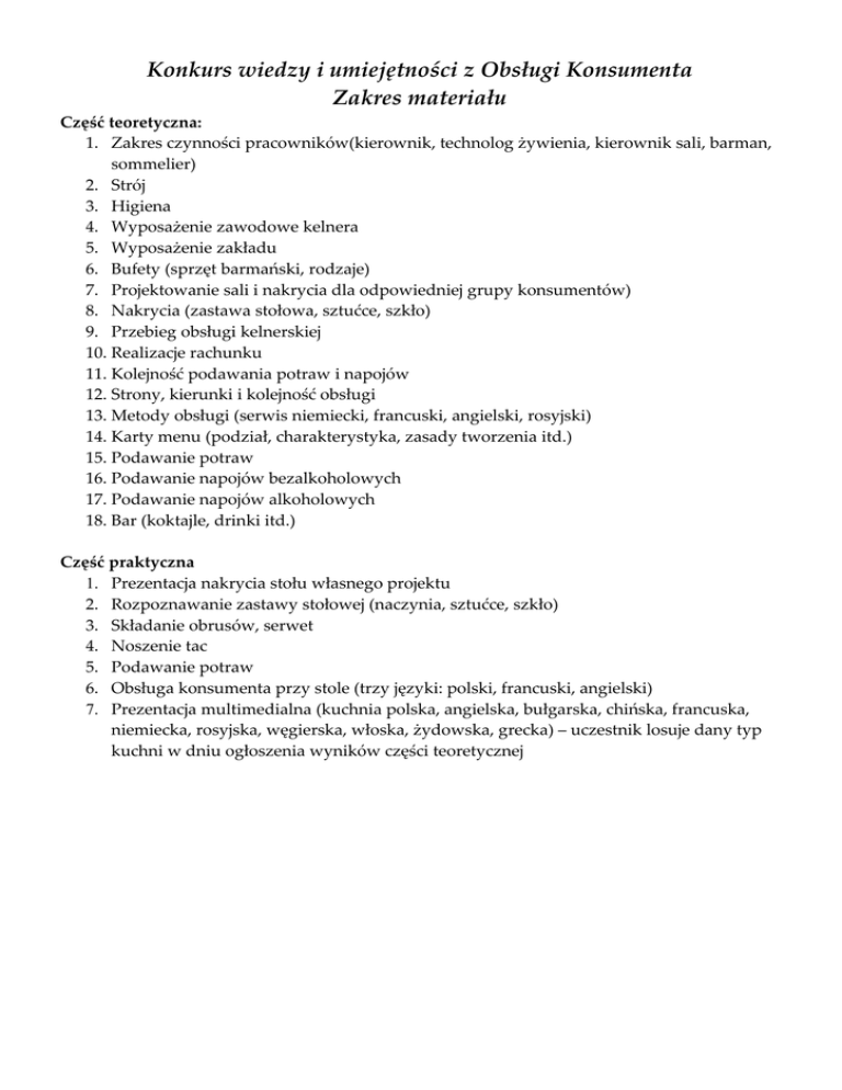 Konkurs wiedzy i umiejętności z Obsługi Konsumenta Zakres materiału Część teoretyczna: 1. Zakres czynności pracowników(kierownik, technolog żywienia, kierownik sali, barman, sommelier) 2. Strój 3. Higiena 4. Wyposażenie zawodowe kelnera 5. Wyposażenie zakładu 6. Bufety (sprzęt barmański, rodzaje) 7. Projektowanie sali i nakrycia dla odpowiedniej grupy konsumentów) 8. Nakrycia (zastawa stołowa, sztućce, szkło) 9. Przebieg obsługi kelnerskiej 10. Realizacje rachunku 11. Kolejność podawania potraw i napojów 12. Strony, kierunki i kolejność obsługi 13. Metody obsługi (serwis niemiecki, francuski, angielski, rosyjski) 14. Karty menu (podział, charakterystyka, zasady tworzenia itd.) 15. Podawanie potraw 16. Podawanie napojów bezalkoholowych 17. Podawanie napojów alkoholowych 18. Bar (koktajle, drinki itd.) Część praktyczna 1. Prezentacja nakrycia stołu własnego projektu 2. Rozpoznawanie zastawy stołowej (naczynia, sztućce, szkło) 3. Składanie obrusów, serwet 4. Noszenie tac 5. Podawanie potraw 6. Obsługa konsumenta przy stole (trzy języki: polski, francuski, angielski) 7. Prezentacja multimedialna (kuchnia polska, angielska, bułgarska, chińska, francuska, niemiecka, rosyjska, węgierska, włoska, żydowska, grecka) – uczestnik losuje dany typ kuchni w dniu ogłoszenia wyników części teoretycznej
