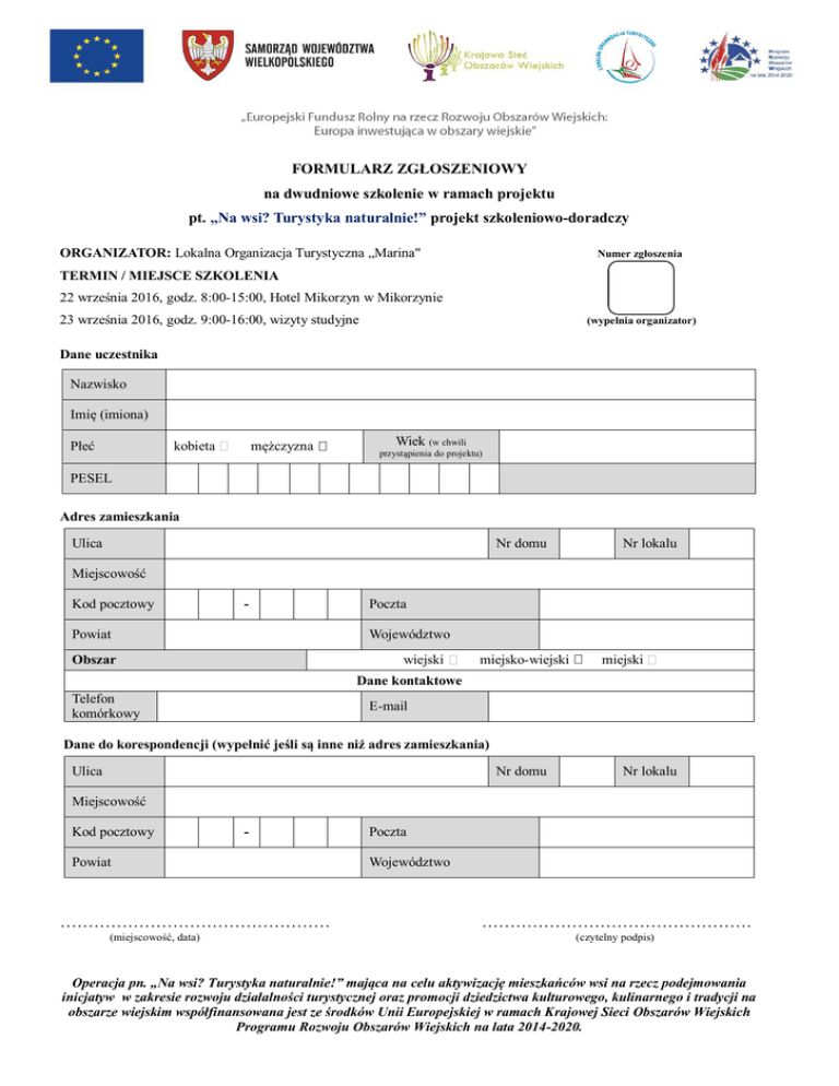 FORMULARZ ZGŁOSZENIOWY na dwudniowe szkolenie w ramach projektu pt. „Na wsi? Turystyka naturalnie!” projekt szkoleniowo-doradczy ORGANIZATOR: Lokalna Organizacja Turystyczna „Marina" Numer zgłoszenia TERMIN / MIEJSCE SZKOLENIA 22 września 2016, godz. 8:00-15:00, Hotel Mikorzyn w Mikorzynie 23 września 2016, godz. 9:00-16:00, wizyty studyjne (wypełnia organizator) Dane uczestnika Nazwisko Imię (imiona) Płeć mężczyzna kobieta Wiek (w chwili przystąpienia do projektu) PESEL Adres zamieszkania Ulica Nr domu Nr lokalu Miejscowość Kod pocztowy - Poczta Województwo Powiat wiejski Obszar miejsko-wiejski miejski Dane kontaktowe Telefon komórkowy E-mail Dane do korespondencji (wypełnić jeśli są inne niż adres zamieszkania) Ulica Nr domu Nr lokalu Miejscowość Kod pocztowy - Powiat ………………………………………… (miejscowość, data) Poczta Województwo ………………………………………… (czytelny podpis) Operacja pn. „Na wsi? Turystyka naturalnie!” mająca na celu aktywizację mieszkańców wsi na rzecz podejmowania inicjatyw w zakresie rozwoju działalności turystycznej oraz promocji dziedzictwa kulturowego, kulinarnego i tradycji na obszarze wiejskim współfinansowana jest ze środków Unii Europejskiej w ramach Krajowej Sieci Obszarów Wiejskich Programu Rozwoju Obszarów Wiejskich na lata 2014-2020. OŚWIADCZENIE O PRZESTRZEGANIU REGULAMINU Oświadczam, że zapoznałem(am) się z regulaminem rekrutacji i uczestnictwa w projekcie „Na wsi? Turystyka naturalnie!” projekt szkoleniowo-doradczy, zgadzam się z jego zapisami i zobowiązuję się do jego skrupulatnego przestrzegania. ………………………………………… (miejscowość, data) ………………………………………… (czytelny podpis) OŚWIADCZENIE O WYRAŻENIU ZGODY NA PRZETWARZANIE DANYCH OSOBOWYCH Wyrażam zgodę na przetwarzanie moich danych osobowych dla potrzeb niezbędnych do realizacji projektu „Na wsi? Turystyka naturalnie!” projekt szkoleniowo-doradczy (zgodnie z Ustawą z dnia 29.08.1997 roku o Ochronie Danych Osobowych; tekst jednolity: Dz. U. z 2002r. Nr 101, poz. 926 ze zm.) ………………………………………… (miejscowość, data) ………………………………………… (czytelny podpis) DEKLARACJA DOT. PROWADZENIA LUB ZAMIARU PODJĘCIA DZIAŁALNOŚCI ZWIĄZANEJ Z TURYSTYKĄ Oświadczam na potrzebę projektu „Na wsi? Turystyka naturalnie!” projekt szkoleniowo-doradczy, że: Pracuję w podmiocie zajmującym się turystyką na terenie gminy (Kazimierz TAK NIE TAK NIE Biskupi, Kleczew, Kramsk, Krzymów, Skulsk, Sompolno, Ślesin, Wierzbinek, Wilczyn) NAZWA PODMIOTU: ……………………………………………. Zamierzam podjąć działalność w obszarze turystyki na terenie gminy (Kazimierz Biskupi, Kleczew, Kramsk, Krzymów, Skulsk, Sompolno, Ślesin, Wierzbinek, Wilczyn) ………………………………………… (miejscowość, data) Zaznacz X właściwą odpowiedź ………………………………………… (czytelny podpis) Operacja pn. „Na wsi? Turystyka naturalnie!” mająca na celu aktywizację mieszkańców wsi na rzecz podejmowania inicjatyw w zakresie rozwoju działalności turystycznej oraz promocji dziedzictwa kulturowego, kulinarnego i tradycji na obszarze wiejskim współfinansowana jest ze środków Unii Europejskiej w ramach Krajowej Sieci Obszarów Wiejskich Programu Rozwoju Obszarów Wiejskich na lata 2014-2020.