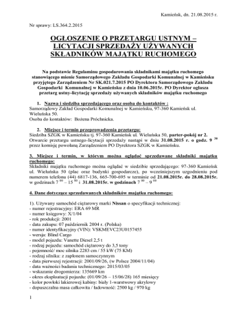 Kamieńsk, dn. 21.08.2015 r. Nr sprawy: LS.364.2.2015 OGŁOSZENIE O PRZETARGU USTNYM – LICYTACJI SPRZEDAŻY UŻYWANYCH SKŁADNIKÓW MAJĄTKU RUCHOMEGO Na podstawie Regulaminu gospodarowania składnikami majątku ruchomego stanowiącego mienie Samorządowego Zakładu Gospodarki Komunalnej w Kamieńsku przyjętego Zarządzeniem Nr SK.021.7.2015 PO Dyrektora Samorządowego Zakładu Gospodarki Komunalnej w Kamieńsku z dnia 10.06.2015r. PO Dyrektor ogłasza przetarg ustny-licytację sprzedaży używanych składników majątku ruchomego 1. Nazwa i siedziba sprzedającego oraz osoba do kontaktów : Samorządowy Zakład Gospodarki Komunalnej w Kamieńsku, 97-360 Kamieńsk ul. Wieluńska 50. Osoba do kontaktów: Bożena Próchnicka. 2. Miejsce i termin przeprowadzenia przetargu: Siedziba SZGK w Kamieńsku tj. 97-360 Kamieńsk ul. Wieluńska 50, parter-pokój nr 2. Otwarcie przetargu ustnego-licytacji sprzedaży nastąpi w dniu 31.08.2015 r. o godz. 9 przez komisję powołaną Zarządzeniem PO Dyrektora SZGK w Kamieńsku. 30 3. Miejsce i termin, w którym można oglądać sprzedawane składniki majątku ruchomego: Składniki majątku ruchomego można oglądać w siedzibie sprzedającego: 97-360 Kamieńsk ul. Wieluńska 50 (plac oraz budynki gospodarcze), po wcześniejszym uzgodnieniu pod numerem telefonu (44) 6817-136, 665-700-695 w terminie od 21.08.2015r. do 28.08.2015r. w godzinach 7 00 – 15 00 i 31.08.2015r. w godzinach 7 00 – 9 00 4. Dane dotyczące sprzedawanych składników majątku ruchomego: 1). Używany samochód ciężarowy marki Nissan o specyfikacji technicznej: - numer rejestracyjny: ERA 69 MR - numer księgowy: X/1/04 - rok produkcji: 2001 - data zakupu: 07 październik 2004 r. (Polska) - numer identyfikacyjny (VIN): VSKMEVC23U0157455 - wersja: Blind Cargo - model pojazdu: Vanette Diesel 2,5 t - rodzaj pojazdu: samochód ciężarowy do 3,5 tony - pojemność/ moc silnika 2283 cm / 55 kW (75 KM) - rodzaj silnika: z zapłonem samoczynnym - data pierwszej rejestracji: 2001/09/26, (w Polsce 2004/11/04) - data ważności badania technicznego: 2015/03/05 - wskazanie drogomierza: 135669 km - okres eksploatacji pojazdu: (01/09/26 – 15/06/28) 165 miesięcy - kolor powłoki lakierowej kabiny: biały 1-warstwowy akrylowy - dopuszczalna masa całkowita / ładowność: 2500 kg / 970 kg 1 - rodzaj nadwozia: Furgon 4 drzwiowy 2 osobowy - liczba osi / rodzaj napędu / skrzynia biegów: 2 / tylny 4x2 / manualna - rozstaw osi: 2900 mm - rodzaj silnika: z zapłonem samoczynnym - liczba cylindrów / układ cylindrów: 4 / rzędowy - długość / szerokość / wysokość: 4503 mm / 1695 mm / 1980 mm - ogumienie: typowe, stan zły - wyposażenie standardowe: głośniki 2szt., napinacze pasów bezpieczeństwa, przegroda części pasażersko-bagażowej, szyba tylna ogrzewana, szyby przyciemniane, światła z regulacją kąta pochylenia, uchwyty do mocowania ładunków, wspomaganie układu kierowniczego, zbiornik paliwa 60 litrów - wyposażenie dodatkowe: hak holowniczy Pojazd niesprawny, naprawiono doraźnie skorodowaną ramę osi przedniej w miejscach mocowania wahaczy strona prawa strona lewa (urwały się podczas hamowania), uszkodzona instalacja elektryczna. Pojazd po wcześniejszych naprawach blacharskich bez wymiany uszkodzonych elementów na nowe błotnik przód strona prawa, pokrywa komory silnika, błotnik przód strona lewa. Kabina kierowcy zniszczona, wykładzina drzwi przód strona lewa spalona, siedzenia zniszczone z ubytkami materiału, progi wgniecone i skorodowane. Komora ładunkowa zniszczona. 2). Używany akumulator (od wózka widłowego) o specyfikacji technicznej: - numer księgowy: VIII/4/94 - data produkcji: 23 lipiec 1999 r. - data zakupu: 1999 r. - niepełny stan elektrolitu w celach akumulatora - masa: 800 kg - wiek: ponad 15 lat - wyeksploatowane urządzenie - dłuższy okres na postoju 3). Używana zagęszczarka gruntu płytowa o specyfikacji technicznej: - numer księgowy: XII/5/05 - data produkcji: brak danych - lata produkcji: 2002-2009 - data zakupu: 30 grudzień 2005 r. - urządzenie: zagęszczarka gruntu o napędzie spalinowym - typ: WACKER DPU 6055 - numer fabryczny maszyny: nie znany - numer fabryczny silnika spalinowego: 771189021939 - obroty nominalne silnika: 2850 obr./ min. - masa własna katalogowa: 456 kg - sposób uruchomienia: elektryczny lub korbowy - otarcia i uszkodzenia obudowy - korozja na elementach stalowych - wyeksploatowane urządzenie - dłuższy okres na postoju 4). Używana zagęszczarka gruntu płytowa o specyfikacji technicznej: - numer księgowy: IX/2/04 - data produkcji: brak danych - lata produkcji: 2002-2009 - data zakupu: 14 wrzesień 2004 r. - urządzenie: zagęszczarka gruntu płytowa o napędzie spalinowym 2 - typ: WACKER DPU 4045 H - numer fabryczny maszyny: 728032623 - numer fabryczny silnika spalinowego: brak danych - obroty nominalne silnika: 2850 obr./ min. - masa własna katalogowa: 382 kg - sposób uruchomienia: elektryczny lub korbowy - otarcia i uszkodzenia obudowy - korozja na elementach stalowych - wyeksploatowane urządzenie - dłuższy okres na postoju 5). Używana zagęszczarka gruntu stopowa o specyfikacji technicznej: - numer księgowy: IX/3/04 - rok produkcji: 1997 - data zakupu: 14 wrzesień 2004 r. - urządzenie: zagęszczarka gruntu stopowa o napędzie spalinowym - typ: BOMAG BT 68 - numer fabryczny maszyny: 101540152148 - numer fabryczny silnika spalinowego: brak danych - moc nominalna silnika: 2,2 kW - masa własna katalogowa: 73 kg - sposób uruchomienia: korbowy - otarcia i uszkodzenia obudowy - korozja na elementach stalowych - wyeksploatowane urządzenie - dłuższy okres na postoju Uwaga: Uczestnik przetargu może przystąpić do licytacji jednego lub więcej wybranych przez siebie składników majątku wskazanych powyżej. Uczestnik przetargu jest zobowiązany do wniesienia wadium w odniesieniu do każdego ze składnika, którego nabyciem jest zainteresowany, w kwotach podanych w pkt 6 Ogłoszenia. 5. Cen