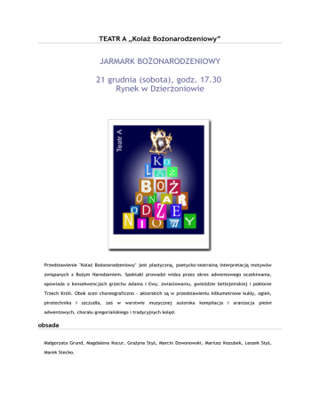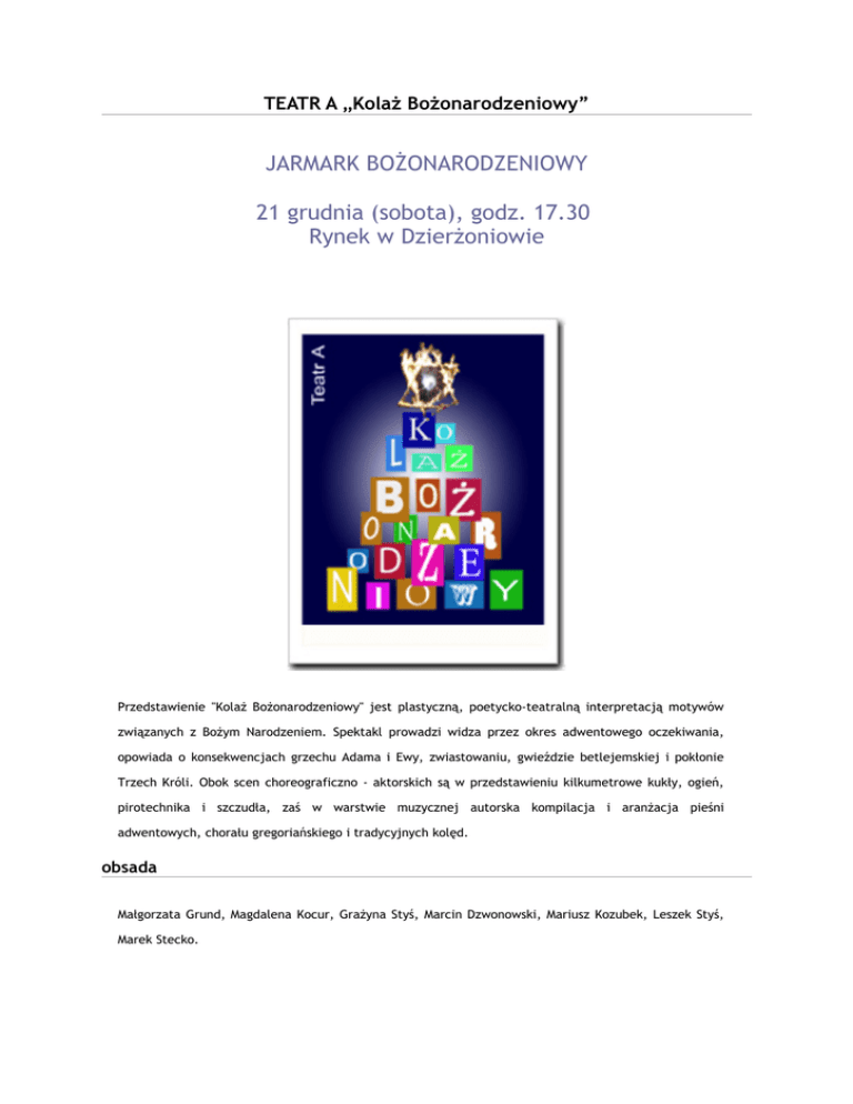 TEATR A „Kolaż Bożonarodzeniowy” JARMARK BOŻONARODZENIOWY 21 grudnia (sobota), godz. 17.30 Rynek w Dzierżoniowie Przedstawienie "Kolaż Bożonarodzeniowy" jest plastyczną, poetycko-teatralną interpretacją motywów związanych z Bożym Narodzeniem. Spektakl prowadzi widza przez okres adwentowego oczekiwania, opowiada o konsekwencjach grzechu Adama i Ewy, zwiastowaniu, gwieździe betlejemskiej i pokłonie Trzech Króli. Obok scen choreograficzno - aktorskich są w przedstawieniu kilkumetrowe kukły, ogień, pirotechnika i szczudła, zaś w warstwie muzycznej autorska kompilacja i aranżacja pieśni adwentowych, chorału gregoriańskiego i tradycyjnych kolęd. obsada Małgorzata Grund, Magdalena Kocur, Grażyna Styś, Marcin Dzwonowski, Mariusz Kozubek, Leszek Styś, Marek Stecko.