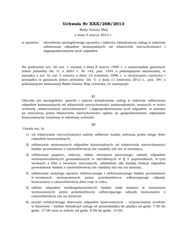 Uchwała Nr XXX/208/2013 Rady Gminy Kłaj z dnia 5 marca 2013 r. w sprawie: określenia szczegółowego sposobu i zakresu świadczenia usług w zakresie odbierania odpadów komunalnych od właścicieli nieruchomości i zagospodarowania tych odpadów. Na podstawie art. 40 ust. 1 ustawy z dnia 8 marca 1990 r. o samorządzie gminnym (tekst jednolity Dz. U. z 2001 r. Nr 142, poz. 1591 z późniejszymi zmianami), w związku z art. 6r ust 3 ustawy z dnia 13 września 1996 r. o utrzymaniu czystości i porządku w gminach (tekst jednolity: Dz. U. z dnia 11 kwietnia 2012 r., poz. 391 z późniejszymi zmianami) Rada Gminy Kłaj uchwala, co następuje: §1 Określa się szczegółowy sposób i zakres świadczenia usług w zakresie odbierania odpadów komunalnych od właścicieli nieruchomości zamieszkałych, zwanych w treści uchwały „właścicielami nieruchomości” i zagospodarowania tych odpadów, w zamian za uiszczoną przez właściciela nieruchomości opłatę za gospodarowanie odpadami komunalnymi ustaloną w odrębnej uchwale. §2 Ustala się, iż: 1) od właściciela nieruchomości należy odbierać każdą zebraną przez niego ilość odpadów komunalnych, 2) odbieranie zmieszanych odpadów komunalnych od właściciela nieruchomości będzie prowadzone z częstotliwością nie rzadziej niż raz w miesiącu, 3) odbieranie papieru, tektury, szkła, tworzywa sztucznego, metali, odpadów wielomateriałowych gromadzonych w określonych w § 3 pojemnikach, w tym workach z folii z tworzyw sztucznych, oddzielnie dla każdej frakcji odpadów prowadzone będzie z częstotliwością nie rzadziej niż raz na miesiąc, 4) odbieranie zużytego sprzętu elektrycznego i elektronicznego będzie prowadzone w terminach wyznaczonych przez przedsiębiorcę odbierającego odpady komunalne z częstotliwością dwa razy w roku, 5) odbiór odpadów wielkogabarytowych będzie miał miejsce w terminach wyznaczonych przez przedsiębiorcę odbierającego odpady komunalne z częstotliwością raz na kwartał, 6) punkt selektywnego zbierania odpadów komunalnych – oczyszczalnia ścieków w Szarowie – będzie świadczył usługi od poniedziałku do piątku od godz. 7.00 do godz. 17.00 oraz w soboty od godz. 8.00 do godz. 14.00. §3 Gmina organizuje odbiór wszystkich odpadów komunalnych powstałych u właścicieli nieruchomości z następujących pojemników: 1) o pojemności 0,12 m3, 0,24 m3, 1,1 m3 - odpady zmieszane; 2) pojemniki, w tym worki z folii z tworzyw sztucznych o pojemności od 60 do 120 l, oznaczone odpowiednimi kolorami w stosunku do każdego rodzaju odpadu zbieranego selektywnie z przeznaczeniem na: a) papier i makulaturę; b) tworzywa sztuczne, metal i odpady wielomateriałowe; c) szkło; §4 1. Segregacji przez właściciela nieruchomości podlegają następujące frakcje odpadów: papier, tektura, szkło, tworzywo sztuczne, metal, odpady wielomateriałowe oraz odpady ulegające biodegradacji, w tym odpady zielone. 2. Dopuszcza się przekazywanie pozostałych frakcji odpadów tj. chemikalia, zużyty sprzęt elektryczny i elektroniczny, meble i inne odpady wielkogabarytowe, odpady budowlane i rozbiórkowe oraz zużyte opony powstałe w gospodarstwie domowym do punktu selektywnej zbiórki wskazanego przez przedsiębiorcę odbierającego odpady. 3. Przeterminowane leki należy przekazywać do punktów zbiórki zlokalizowanych na terenie aptek i placówek służby zdrowia. 4. Zużyte baterie i akumulatory inne niż przemysłowe i samochodowe należy przekazywać do punktów zbiórki zlokalizowanych na terenie gminy. §5 Wykonanie uchwały powierza się Wójtowi Gminy Kłaj. §6 Uchwała wchodzi w życie po upływie 14 dni od dnia ogłoszenia w Dzienniku Urzędowym Województwa Małopolskiego, z mocą obowiązującą od 1 lipca 2013 r. Przewodniczący Rady Gminy Kłaj ………………………….…………… Lucyna Buczek