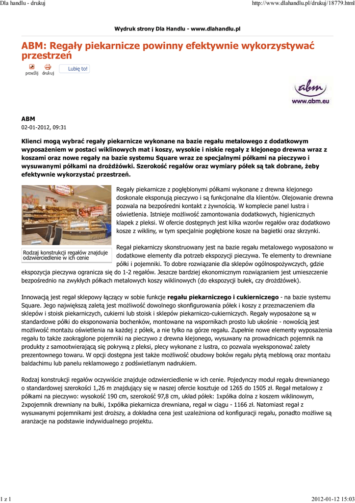 Dla handlu - drukuj 1z1 http://www.dlahandlu.pl/drukuj/18779.html Wydruk strony Dla Handlu - www.dlahandlu.pl ABM: Regały piekarnicze powinny efektywnie wykorzystywać przestrzeń Lubię to! ABM 02-01-2012, 09:31 Klienci mogą wybrać regały piekarnicze wykonane na bazie regału metalowego z dodatkowym wyposażeniem w postaci wiklinowych mat i koszy, wysokie i niskie regały z klejonego drewna wraz z koszami oraz nowe regały na bazie systemu Square wraz ze specjalnymi półkami na pieczywo i wysuwanymi półkami na drożdżówki. Szerokość regałów oraz wymiary półek są tak dobrane, żeby efektywnie wykorzystać przestrzeń. Regały piekarnicze z pogłębionymi półkami wykonane z drewna klejonego doskonale eksponują pieczywo i są funkcjonalne dla klientów. Olejowanie drewna pozwala na bezpośredni kontakt z żywnością. W komplecie panel lustra i oświetlenia. Istnieje możliwość zamontowania dodatkowych, higienicznych klapek z pleksi. W ofercie dostępnych jest kilka wzorów regałów oraz dodatkowo kosze z wikliny, w tym specjalnie pogłębione kosze na bagietki oraz skrzynki. Regał piekarniczy skonstruowany jest na bazie regału metalowego wyposażono w dodatkowe elementy dla potrzeb ekspozycji pieczywa. Te elementy to drewniane półki i pojemniki. To dobre rozwiązanie dla sklepów ogólnospożywczych, gdzie ekspozycja pieczywa ogranicza się do 1-2 regałów. Jeszcze bardziej ekonomicznym rozwiązaniem jest umieszczenie bezpośrednio na zwykłych półkach metalowych koszy wiklinowych (do ekspozycji bułek, czy drożdżówek). Rodzaj konstrukcji regałów znajduje odzwierciedlenie w ich cenie Innowacją jest regał sklepowy łączący w sobie funkcje regału piekarniczego i cukierniczego - na bazie systemu Square. Jego największą zaletą jest możliwość dowolnego skonfigurowania półek i koszy z przeznaczeniem dla sklepów i stoisk piekarniczych, cukierni lub stoisk i sklepów piekarniczo-cukierniczych. Regały wyposażone są w standardowe półki do eksponowania bochenków, montowane na wspornikach prosto lub ukośnie - nowością jest możliwość montażu oświetlenia na każdej z półek, a nie tylko na górze regału. Zupełnie nowe elementy wyposażenia regału to także zaokrąglone pojemniki na pieczywo z drewna klejonego, wysuwany na prowadnicach pojemnik na produkty z samootwierającą się pokrywą z pleksi, plecy wykonane z lustra, co pozwala wyeksponować zalety prezentownego towaru. W opcji dostępna jest także możliwość obudowy boków regału płytą meblową oraz montażu baldachimu lub panelu reklamowego z podświetlanym nadrukiem. Rodzaj konstrukcji regałów oczywiście znajduje odzwierciedlenie w ich cenie. Pojedynczy moduł regału drewnianego o standardowej szerokości 1,26 m znajdujący się w naszej ofercie kosztuje od 1265 do 1505 zł. Regał metalowy z półkami na pieczywo: wysokość 190 cm, szerokość 97,8 cm, układ półek: 1xpółka dolna z koszem wiklinowym, 2xpojemnik drewniany na bułki, 1xpółka piekarnicza drewniana, regał w ciągu - 1166 zł. Natomiast regał z wysuwanymi pojemnikami jest droższy, a dokładna cena jest uzależniona od konfiguracji regału, ponadto możliwe są aranżacje na podstawie indywidualnego projektu. 2012-01-12 15:03