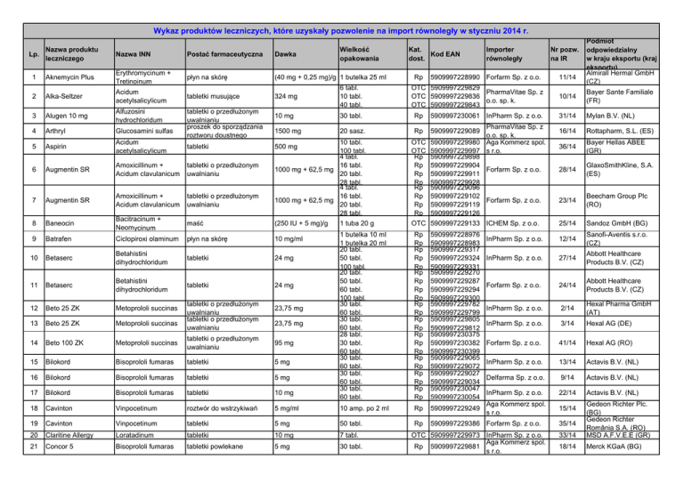 Wykaz produktów leczniczych, które uzyskały pozwolenie na import równoległy w styczniu 2014 r. Nazwa produktu Lp. leczniczego 1 Aknemycin Plus Nazwa INN Postać farmaceutyczna Dawka Erythromycinum + Tretinoinum płyn na skórę (40 mg + 0,25 mg)/g 1 butelka 25 ml tabletki musujące 2 Alka-Seltzer Acidum acetylsalicylicum 3 Alugen 10 mg Alfuzosini hydrochloridum 4 Wielkość opakowania tabletki o przedłużonym uwalnianiu proszek do sporządzania roztworu doustnego 324 mg 6 tabl. 10 tabl. 40 tabl. 10 mg 30 tabl. Arthryl Glucosamini sulfas 5 Aspirin Acidum acetylsalicylicum 6 Augmentin SR Amoxicillinum + Acidum clavulanicum tabletki o przedłużonym uwalnianiu 7 Augmentin SR Amoxicillinum + Acidum clavulanicum tabletki o przedłużonym uwalnianiu 8 Baneocin Bacitracinum + Neomycinum maść 10 tabl. 500 mg 100 tabl. 4 tabl. 16 tabl. 1000 mg + 62,5 mg 20 tabl. 28 tabl. 4 tabl. 16 tabl. 1000 mg + 62,5 mg 20 tabl. 28 tabl. (250 IU + 5 mg)/g 1 tuba 20 g 9 Batrafen Ciclopiroxi olaminum płyn na skórę 10 mg/ml 10 Betaserc Betahistini dihydrochloridum tabletki 24 mg 11 Betaserc Betahistini dihydrochloridum tabletki 24 mg 12 Beto 25 ZK Metoprololi succinas 13 Beto 25 ZK Metoprololi succinas 14 Beto 100 ZK Metoprololi succinas tabletki o przedłużonym uwalnianiu 95 mg 15 Bilokord Bisoprololi fumaras tabletki 5 mg 16 Bilokord Bisoprololi fumaras tabletki 5 mg 17 Bilokord Bisoprololi fumaras tabletki 10 mg 18 Cavinton Vinpocetinum roztwór do wstrzykiwań 19 Cavinton Vinpocetinum 20 Claritine Allergy Loratadinum 21 Concor 5 Bisoprololi fumaras tabletki 1500 mg 20 sasz. Kat. Kod EAN dost. Rp Importer równoległy 5909997228990 Forfarm Sp. z o.o. OTC 5909997229829 PharmaVitae Sp. z OTC 5909997229836 o.o. sp. k. OTC 5909997229843 Rp Bayer Sante Familiale (FR) 31/14 Mylan B.V. (NL) 16/14 Rottapharm, S.L. (ES) 36/14 Bayer Hellas ABEE (GR) 28/14 GlaxoSmithKline, S.A. (ES) 23/14 Beecham Group Plc (RO) 25/14 Sandoz GmbH (BG) InPharm Sp. z o.o. 12/14 Sanofi-Aventis s.r.o. (CZ) InPharm Sp. z o.o. 27/14 Abbott Healthcare Products B.V. (CZ) Forfarm Sp. z o.o. 24/14 Abbott Healthcare Products B.V. (CZ) InPharm Sp. z o.o. 2/14 Hexal Pharma GmbH (AT) InPharm Sp. z o.o. 3/14 Hexal AG (DE) Forfarm Sp. z o.o. 41/14 Hexal AG (RO) InPharm Sp. z o.o. 13/14 Actavis B.V. (NL) Delfarma Sp. z o.o. 9/14 Actavis B.V. (NL) InPharm Sp. z o.o. 22/14 Actavis B.V. (NL) Aga Kommerz spol. s r.o. 15/14 5909997230061 InPharm Sp. z o.o. PharmaVitae Sp. z Rp 5909997229089 o.o. sp. k. OTC 5909997229980 Aga Kommerz spol. OTC 5909997229997 s r.o. Rp 5909997229898 Rp 5909997229904 Forfarm Sp. z o.o. Rp 5909997229911 Rp 5909997229928 Rp 5909997229096 Rp 5909997229102 Forfarm Sp. z o.o. Rp 5909997229119 Rp 5909997229126 OTC 5909997229133 ICHEM Sp. z o.o. Rp Rp Rp Rp Rp Rp Rp Rp Rp Rp Rp Rp Rp Rp Rp Rp Rp Rp Rp Rp Rp Rp 5909997228976 5909997228983 5909997229317 5909997229324 5909997229331 5909997229270 5909997229287 5909997229294 5909997229300 5909997229782 5909997229799 5909997229805 5909997229812 5909997230375 5909997230382 5909997230399 5909997229065 5909997229072 5909997229027 5909997229034 5909997230047 5909997230054 5 mg/ml 10 amp. po 2 ml Rp 5909997229249 tabletki 5 mg 50 tabl. Rp 5909997229386 Forfarm Sp. z o.o. tabletki 10 mg 7 tabl. tabletki powlekane 5 mg 30 tabl. 23,75 mg 23,75 mg 11/14 Podmiot odpowiedzialny w kraju eksportu (kraj eksportu) Almirall Hermal GmbH (CZ) 10/14 1 butelka 10 ml 1 butelka 20 ml 20 tabl. 50 tabl. 100 tabl. 20 tabl. 50 tabl. 60 tabl. 100 tabl. 30 tabl. 60 tabl. 30 tabl. 60 tabl. 28 tabl. 30 tabl. 60 tabl. 30 tabl. 60 tabl. 30 tabl. 60 tabl. 30 tabl. 60 tabl. tabletki o przedłużonym uwalnianiu tabletki o przedłużonym uwalnianiu Nr pozw. na IR OTC 5909997229973 InPharm Sp. z o.o. Aga Kommerz spol. Rp 5909997229881 s r.o. 33/14 Gedeon Richter Plc. (BG) Gedeon Richter România S.A. (RO) MSD A.F.V.E.E (GR) 18/14 Merck KGaA (BG) 35/14 Wykaz produktów leczniczych, które uzyskały pozwolenie na import równoległy w styczniu 2014 r. Nazwa produktu Lp. leczniczego Nazwa INN Postać farmaceutyczna Dawka Wielkość opakowania 22 Concor Cor 2,5 Bisoprololi fumaras tabletki powlekane 2,5 mg 28 tabl. Rp 23 Concor Cor 5 Bisoprololi fumaras tabletki powlekane 5 mg 28 tabl. Rp 24 Daktarin Miconazoli nitras krem 20 mg/g 1 tuba 30 g 25 Emla Lidocainum + Prilocainum krem (25 mg + 25 mg)/g 26 Escitil Escitalopramum tabletki powlekane 10 mg 27 Estreva Estradiolum żel 0,1% Meglumini amidotrizoas + Natrii amidotrizoas Betahistini dihydrochloridum roztwór (660 mg + 100 mg)/ml tabletki 24 mg Kat. Kod EAN dost. PharmaVitae Sp. z o.o. sp. k. 1 tuba 5 g 5 tub po 5 g 28 tabl. 56 tabl. Rp Rp Rp Rp 5902023771422 Pretium Farm Sp. z 5902023771507 o.o. 5909997229935 Forfarm Sp. z o.o. 5909997229942 1 tuba 50g Rp 5909997230009 Forfarm Sp. z o.o. 1 butelka 100 ml 5 butelek po 100 ml 10 butelek po 100 ml 20 tabl. 30 tabl. 50 tabl. 1 tabl. 3 tabl. 1 dozownik 120 g 1 tuba 60 g Rp Rp Rp Rp Rp Rp Rp Rp Rp Rp 5909997230016 5909997230023 5909997230030 5902023771767 5902023771774 5902023771781 5909997229041 5909997229058 5909997230351 5909997230344 Gastrografin 29 Histigen 30 Ibandronic Acid Mylan Acidum ibandronicum tabletki powlekane 150 mg 31 Ketonal żel 25 mg/g (2,5%) maść do oczu (1 mg + 3500 j.m. + 1 tuba 3,5 g 6000 j.m.)/g Rp kapsułki miękkie 60 mg + 300 mg 20 kaps. Rp Rp Rp Dexamethasonum + Neomycini sulfas + Polymyxini B sulfas Alverini citras + Simeticonum Pretium Farm Sp. z o.o. Pretium Farm Sp. z 5902023771897 o.o. 5902023771903 OTC 5909997229256 28 Ketoprofenum Importer równoległy 19/14 Podmiot odpowiedzialny w kraju eksportu (kraj eksportu) Merck KGaA (ES) 6/14 Merck KGaA (ES) Nr pozw. na IR 17/14 5/14 29/14 38/14 InPharm Sp. z o.o. 42/14 Bayer Hellas ABEE (GR) Pretium Farm Sp. z o.o. 4/14 Generics [UK] Limited (GB) Delfarma Sp. z o.o. 8/14 Mylan B.V. (NL) InPharm Sp. z o.o. 43/14 Sandoz (FR) 45/14 Alcon-Couvreur n.v. (CZ) 37/14 Laboratoires MAYOLY SPINDLER (FR) Aga Kommerz spol. s r.o. MB Pharma Spółka 59099972293