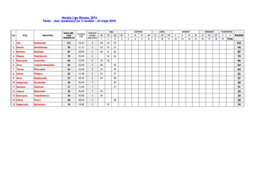 Morska Liga Biznesu 2016 Panie - stan rywalizacji po 3 rundzie - 24 maja 2016 Lp Imię Nazwisko Suma pkt. tura zasadnicza Średnia STB MAJ CZERWIEC LIPIEC SIERPIEŃ WRZESIEŃ PAŹDZIERNIK Zagrane rundy (łącznie) 10 17 24 31 7 14 21 28 5 12 19 2 9 16 23 6 13 27 4 8 1 2 3 4 5 6 7 8 9 10 11 12 13 14 15 16 17 18 19 FINAŁ RAZEM 1 Ute Kisielewski 101 33,67 3 28 34 39 101 2 Dorota Karnikowska 94 31,33 3 34 33 27 94 3 Barbara Bobińska 87 29,00 3 30 31 26 87 4 Oksana Wojtkiewicz 70 35,00 2 34 36 70 5 Katarzyna Liszewska 66 33,00 2 34 6 Anna Judycka-Muszyńska 64 32,00 2 28 36 64 7 Teresa Pietraszko 64 32,00 2 25 39 64 8 Hanna Pałdyna 62 31,00 2 35 27 62 9 Anna 29 66 32 Rydzkowska 57 28,50 2 28 57 10 Małgorzata Brodowska 40 40,00 1 40 40 11 Marzena Szpilman 31 31,00 1 31 31 12 Joanna Borkowska 30 30,00 1 30 30 13 Katarzyna Ciesiołkiewicz 30 30,00 1 30 30 14 Halina Piszcz 28 28,00 1 15 Małgorzata Ballantyne 19 19,00 1 28 19 28 19