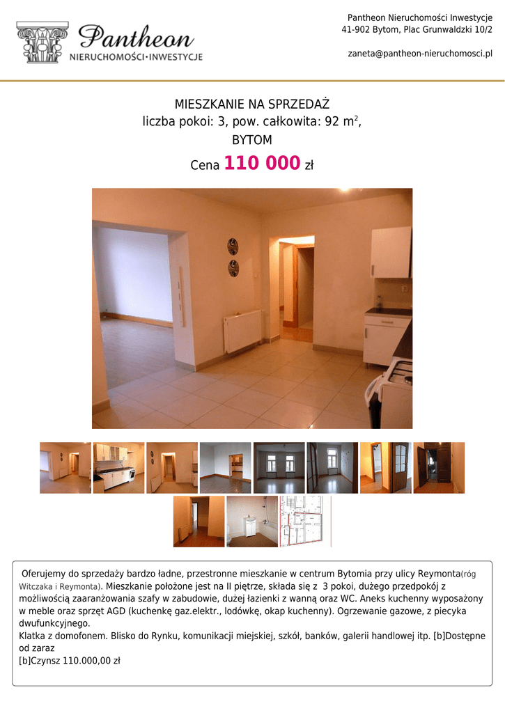 Pantheon Nieruchomości Inwestycje 41-902 Bytom, Plac Grunwaldzki 10/2 [email protected] MIESZKANIE NA SPRZEDAŻ liczba pokoi: 3, pow. całkowita: 92 m2, BYTOM Cena 110 000 zł Oferujemy do sprzedaży bardzo ładne, przestronne mieszkanie w centrum Bytomia przy ulicy Reymonta(róg Witczaka i Reymonta). Mieszkanie położone jest na II piętrze, składa się z 3 pokoi, dużego przedpokój z możliwością zaaranżowania szafy w zabudowie, dużej łazienki z wanną oraz WC. Aneks kuchenny wyposażony w meble oraz sprzęt AGD (kuchenkę gaz.elektr., lodówkę, okap kuchenny). Ogrzewanie gazowe, z piecyka dwufunkcyjnego. Klatka z domofonem. Blisko do Rynku, komunikacji miejskiej, szkół, banków, galerii handlowej itp. [b]Dostępne od zaraz [b]Czynsz 110.000,00 zł Pantheon Nieruchomości Inwestycje 41-902 Bytom, Plac Grunwaldzki 10/2 [email protected] Mieszkanie dla Młodych TAK Cena 110 000 PLN Stara cena 100 000 PLN Cena za m2 1 198,52 PLN Pow. całkowita 91,78 m2 Rodzaj mieszkania 3-POKOJOWE Typ kuchni ANEKS KUCHENNY Wyposażenie kuchni CZĘŚCIOWE Droga dojazdowa ASFALTOWA Województwo ŚLĄSKIE Powiat m. Bytom Gmina Bytom Miejscowość BYTOM Kod pocztowy 41-902 Ulica Reymonta Nr domu 2 Liczba pokoi 3 Liczba sypialni 3 Piętro 2 Liczba pięter 3 Standard DOBRY Umeblowanie CZĘŚCIOWE Liczba łazienek 1 Stan łazienki DOBRY Liczba WC 1 Źródło c.w. GAZOWY 2-OBIEGOWY Forma własności PEŁNA WŁASNOŚĆ Ilość poziomów 1 Linia telefoniczna TAK Internet TAK Telewizja kablowa TAK Domofon TAK Podłączony wodociąg TAK Źródło wody WODA MIEJSKA Podłączona kanalizacja TAK Rodzaj kanalizacji MIEJSKA Lodówka TAK Kuchnia gazowa TAK Liczba miejsc parkingowych 1 Rodzaj okien PLASTIKOWE Pokrycie dachu PAPA Poddasze NIEUŻYTKOWE Rodzaj podłogi PANELE,GRES Rodzaj rynku WTÓRNY Uciążliwość okolicy UMIARKOWANIE CICHE Licznik prądu TAK Wodomierz TAK Pantheon Nieruchomości 690 900 155 [email protected] Pantheon Nieruchomości Inwestycje 41-902 Bytom, Plac Grunwaldzki 10/2 [email protected] Więcej ofert na stronie www.pantheon-nieruchomosci.pl