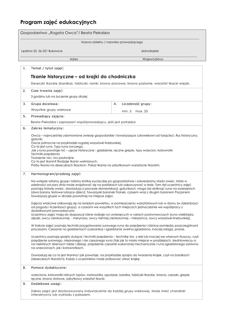Program zajęć edukacyjnych Gospodarstwo „Rogata Owca”/ Beata Piekalska ________________________________________________ ______________________________________________________________________ Nazwa obiektu / nazwisko prowadzącego Lędzina 25, 56-321 Bukowice dolnośląskie _____________________________________________________________________________________________________________________ Adres Województwo 1. Temat / tytuł zajęć: Tkanie historyczne – od krajki do chodniczka Deseczki tkackie (bardka), tabliczki, ramki, krosno pionowe, krosno poziome, warsztat tkacki wiejski. 2. Czas trwania zajęć: 3 godziny lub na życzenie grupy dłużej 3. Grupa docelowa: Wszystkie grupy wiekowe 5. 4. Liczebność grupy: min. 5 max. 25 Prowadzący zajęcia: Beata Piekalska i zapraszani współprowadzący, jeśli jest potrzeba 6. Zakres tematyczny: Owca – najwcześniej udomowione zwierzę gospodarskie i towarzyszące człowiekowi od tysiącleci. Rys historyczny, gatunki. Owce północne na przykładzie rogatej wrzosówki lineburskiej. Co to jest runo. Typy runa owczego. Jak z runa powstaje nić – ujęcie historyczne : grzebienie, ręczne greple, typy wrzecion, kołowrotki Techniki przędzenia Tworzenie nici, nici podwójne Co to jest tkanin? Rodzaje tkanin wełnianych. Próby tkania na deseczkach tkackich. Pokaz tkania na zabytkowym warsztacie tkackim. 7. Harmonogram/przebieg zajęć: Na wstępie witamy grupę i robimy krótką wycieczkę po gospodarstwie i odwiedzamy stado owiec, które w zależności od pory dnia może znajdować się na pastiskach lub odpoczywać w lesie. Tam też uczestnicy zajęć poznają historię owiec, dowiadują o procesie domestykacji, gatunkach, moga też dotknąć runa na zwierzętach (dwa barany testowe lubiące dzieci). Towarzyski baranek Franek, czasem wraz z drugim baranem Pacjanem towarzyszą grupie w drodze powrotnej na miejsce zajęć. Zajęcia właściwe odbywają się na świeżym powietrzu, w pomieszczeniu warsztatowym lub w domu (w zależnbosci od pogody i liczenbosci grupy), a czasami we wszystkich tych miejscach jednocześnie we współpracy z dodatkowymi prowadzacymi. Uczestnicy zajęć mają do dyspozycji różne rodzaje run zwierzęcych w celach porównawczych (runo wielbłąda, alpaki, owcy cienkorunnej - merynosa, owcy nizinnej cienkorunnej – mieszańca, owcy wrzosówki lineburskiej). W trakcie zajęć poznają techniki przygotowania surowego runa do przędzenia i różnice pomiędzy poszczególnymi procesami. Czesanie na grzebieniach (czesanka) i zgrzeblanie (wełna zgrzeblona, inaczej rolags), pranie. Uczestnicy poznają sprzęty służące i techniki przędzenia – technikę tzw. z reki lub inaczej we własnym tłuszczu, czyli przędzenie surowego, niepranego i nie czesanego runa (tak jak to miało miejsce w pradziejach, średniowieczu a na niektórych terenach także i dzisiaj), przędzenie czesanki wykonanej mechanicznie i runa zgrzeblonego zarówno na wrzecionach, jak i kołowrotkach. Dowiadują się co to jest tkanina i jak powstaje, na przykładzie sprzętu do tworzenia krajek, czyli na bardkach (deseczkach tkackich). Każdy z uczestników może próbować utkać krajkę. 8. Pomoce dydaktyczne: wrzeciona, kołowrotki różnych typów, motowidła, szpularze, bardka, tabliczki tkackie, krosna, czesaki, greple ręczne, krosno stołowe, zabytkowy warsztat tkacki. 9. Dodatkowe uwagi: Zakres zajęć jest dostosowywany indywidualnie do każdej grupy wiekowej. Może mieć charakter interaktywny lub wykładu z pokazem.