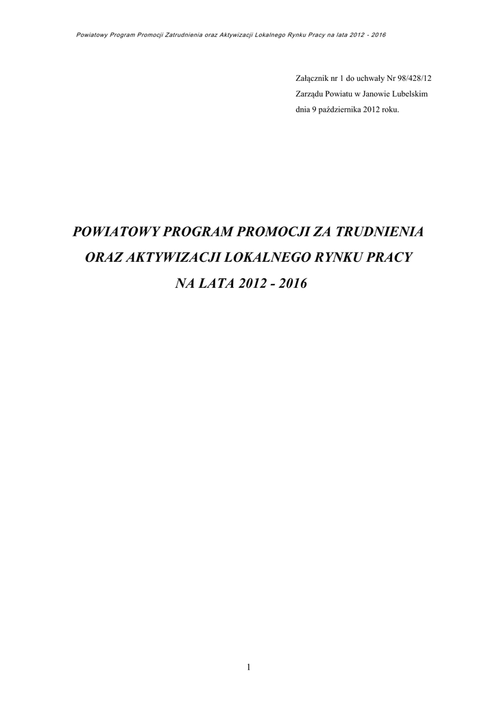 Powiatowy Program Promocji Zatrudnienia oraz Aktywizacji Lokalnego Rynku Pracy na lata 2012 - 2016 Załącznik nr 1 do uchwały Nr 98/428/12 Zarządu Powiatu w Janowie Lubelskim dnia 9 października 2012 roku. POWIATOWY PROGRAM PROMOCJI ZA TRUDNIENIA ORAZ AKTYWIZACJI LOKALNEGO RYNKU PRACY NA LATA 2012 - 2016 1 Powiatowy Program Promocji Zatrudnienia oraz Aktywizacji Lokalnego Rynku Pracy na lata 2012 - 2016 SPIS TREŚCI Wstęp ......................................................................................................................................... ........3 1. Analiza lokalnego rynku pracy ........................................................................................ ........5 2. Źródła finansowania zadań w zakresie aktywizacji lokalnego rynku pracy.........................8 3. Cele Programu .................................................................................................................. ...........8 4. 3.1. Cel główny............................................................................................................. ............8 3.2. Cele szczegółowe ...... ....................................................................................................... 8 Działania w ramach Programu ....................................................................................... ............9 4.1. Pośrednictwo pracy ............................................................................................... ............9 4.2. Usługi w ramach sieci Europejskich Służb Zatrudnienia (EURES) ................................ 10 4.3. Szkolenia osób bezrobotnych .......... ............................................................................... 10 4.4. Wsparcie działań poprzez aktywizację lokalnych przedsiębiorstw oraz przyciąganie nowych inwestorów ................................. .................................................................................... 11 5. 4.5. Poradnictwo i informacja zawodowa oraz pomoc w aktywnym poszukiwaniu pracy ....12 4.6. Instrumenty rynku pracy ....................................................................................... ..........12 4.7. Monitoring zawodów deficytowych i nadwyżkowych .......................................... ..........13 4.8. Wspieranie integracji zawodowej i społecznej osób niepełnosprawnych ............. ..........14 4.9. Dialog społeczny i partnerstwo na rzecz rynku pracy ........................................... ..........15 Monitoring ........................................................................................................................16 Zakończenie ............................................................................................................................17 2 Powiatowy Program Promocji Zatrudnienia oraz Aktywizacji Lokalnego Rynku Pracy na lata 2012 - 2016 WSTĘP Podstawę prawną dla opracowania Powiatowego Programu Promocji Zatrudnienia oraz Aktywizacji Lokalnego Rynku Pracy na lata 2 0 1 2 - 2016 stanowią odpowiednio przepisy art. 9 ust. pkt 1 ustawy z dnia 20 kwietnia 2004 r. o promocji zatrudnienia i instytucjach rynku pracy (Dz. U. Nr 99, poz. 1001) oraz art. 12 pkt 9c ustawy z dnia 5 czerwca 1998r. o samorządzie powiatowym (Dz. U. z 2001 r. Nr 142, poz. 1592 ze zm.). Pierwszy wymieniony przepis brzmi „do zadań samorządu powiatu w zakresie polityki rynku pracy należy opracowanie i realizacja programu promocji zatrudnienia oraz aktywizacji lokalnego rynku pracy stanowiącego część powiatowej strategii rozwiązywania problemów społecznych, o której mowa w odrębnych przepisach". Natomiast drugi cyt. przepis wskazuje, że „do wyłącznej właściwości rady powiatu należy uchwalanie powiatowego programu przeciwdziałania bezrobociu oraz aktywizacji lokalnego rynku pracy". Ilekroć jest mowa o „Programie" chodzi o Powiatowy Program Promocji Zatrudnienia oraz Akt ywizacji Lokalnego Rynku Pracy na lata 2 0 1 2 - 2016. Program został przygotowany w oparciu o zadania przypisane samorządowi powiatu a realizowane przez Powiatowy Urząd Pracy w Janowie Lubelskim, do których należy m. in.: pozyskiwanie i gospodarowanie środkami finansowymi na realizację zadań z zakresu aktywizacji lokalnego rynku pracy; prowadzenie pośrednictwa pracy i poradnictwa zawodowego; inicjowanie, organizowanie i finansowanie usług i instrumentów rynku pracy; inicjowanie, organizowanie i finansowanie projektów lokalnych i innych działań na rzecz aktywizacji bezrobotnych; współdziałanie z instytucjami rynku pracy. W Programie zostały określone priorytety lokalnej polityki rynku pracy i rozwoju zasobów ludzkich w Powiecie Janowskim, wpisujące się w realizacje priorytetów i celów regionalnych dokumentów strategicznych, w tym Strategii Rozwoju Powiatu Janowskiego na lata 2007 - 2020. Uwzględnione zostały również założenia wynikające z: 3 Powiatowy Program Promocji Zatrudnienia oraz Aktywizacji Lokalnego Rynku Pracy na lata 2012 - 2016 - Europejskiej Strategii Zatrudnienia, - Narodowego Planu Rozwoju na lata 2007 - 2013, - Narodowe Strategiczne Ramy Odniesienia 2007 - 2013 wspierające wzrost gospodarczy i zatrudnienie. - Narodowa Strategia Spójności - Strategii Rozwoju Kraju na lata 2007 - 2015, - Krajowego Programu Reform na lata 2009 - 2011 na rzecz realizacji Strategii Lizbońskiej, - Krajowego Planu Działań na Rzecz Zatrudnienia na lata 2009 -2011., - Narodowej Strategii Wzrostu Zatrudnienia i Rozwoju Zasobów Ludzkich w latach 2000 - 2006, - Ram Odniesienia Polityki Zatrudnienia; - Strategii Rozwoju Województwa Lubelskiego na lata 2006 - 2020, - Planu Działań na Rzecz Zatrudnienia w Województwie Lubelskim na 2011 rok, Ponadto Powiatowy Program Promocji Za trudnienia oraz Aktywizacji Lokalnego Rynku Pracy na lata 2011 - 2016 dla Powiatu Janowskiego jest zgodny z celami założonymi w projekcie „Strategii Rozwoju Powiatu Janowskiego na lata 2007 - 2020". Najważniejszą rol