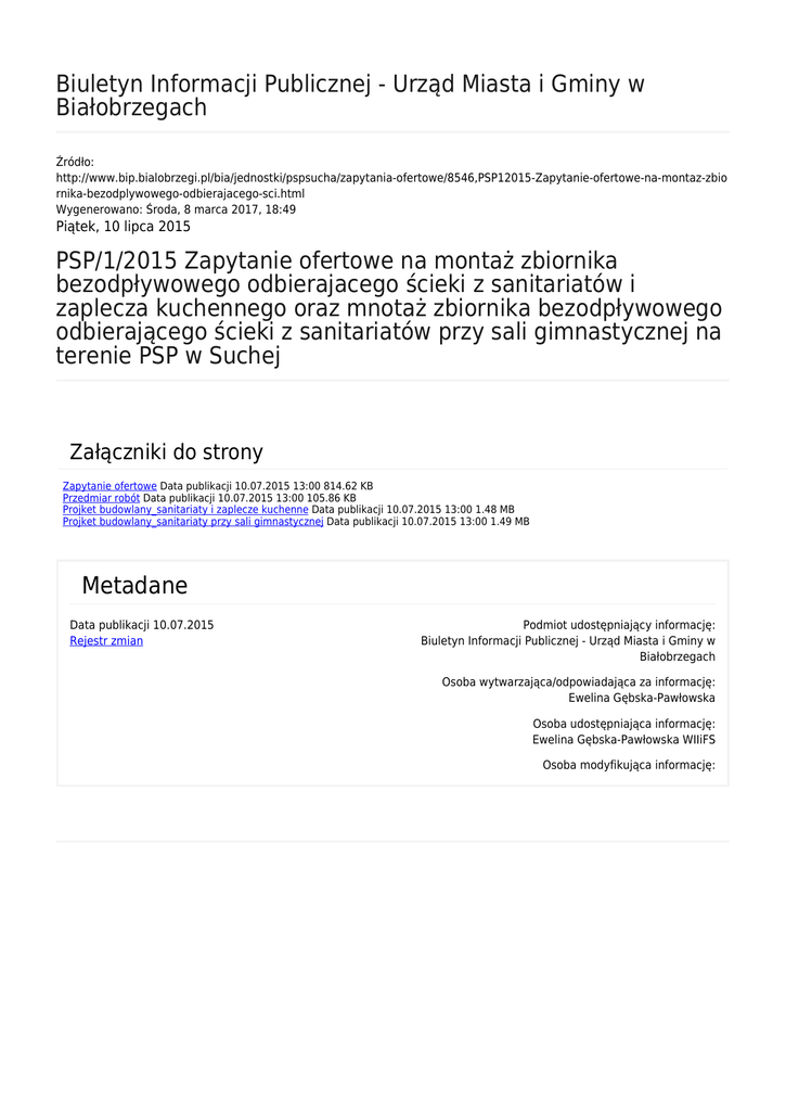 Biuletyn Informacji Publicznej - Urząd Miasta i Gminy w Białobrzegach Źródło: http://www.bip.bialobrzegi.pl/bia/jednostki/pspsucha/zapytania-ofertowe/8546,PSP12015-Zapytanie-ofertowe-na-montaz-zbio rnika-bezodplywowego-odbierajacego-sci.html Wygenerowano: Środa, 8 marca 2017, 18:49 Piątek, 10 lipca 2015 PSP/1/2015 Zapytanie ofertowe na montaż zbiornika bezodpływowego odbierajacego ścieki z sanitariatów i zaplecza kuchennego oraz mnotaż zbiornika bezodpływowego odbierającego ścieki z sanitariatów przy sali gimnastycznej na terenie PSP w Suchej Załączniki do strony Zapytanie ofertowe Data publikacji 10.07.2015 13:00 814.62 KB Przedmiar robót Data publikacji 10.07.2015 13:00 105.86 KB Projket budowlany_sanitariaty i zaplecze kuchenne Data publikacji 10.07.2015 13:00 1.48 MB Projket budowlany_sanitariaty przy sali gimnastycznej Data publikacji 10.07.2015 13:00 1.49 MB Metadane Data publikacji 10.07.2015 Rejestr zmian Podmiot udostępniający informację: Biuletyn Informacji Publicznej - Urząd Miasta i Gminy w Białobrzegach Osoba wytwarzająca/odpowiadająca za informację: Ewelina Gębska-Pawłowska Osoba udostępniająca informację: Ewelina Gębska-Pawłowska WIIiFS Osoba modyfikująca informację:
