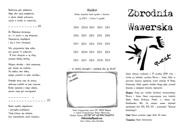 Rubinową gdy pójdziecie, długi płot tutaj znajdziecie, w płocie słupki policzycie, wynik w kratki tu wstawicie. _ _ _ _ _ _ _ _ _ _ _ [6] Do Błękitnej docieramy, no i w prawo w nią skręcamy. Szparagową znajdujemy i się w lewo kierujemy. Gdy przypomnisz datę sobie, ona pewnie Ci podpowie. W lewo skręcisz w tę ulicę, poznasz bliską okolicę. Miejsca zbrodni – dziś cmentarza, gdy okazja się nadarza. Na tablicy liter kilka, spójrz, przecież to tylko chwilka… Podejdź teraz więc do znicza, północny-wschód on nam wytycza. Kiedy spiszesz z niego zdanie, prawie masz już rozwiązanie! Hasło: Należy uzupełnić hasło zgodnie z kluczem: np. [3]/4 - 4 litera 3 zagadki [3]/6 [5]/14 [6]/1 [4]/4 [3]/1 [5]/6 [2]/2 [2]/3 [5]/1 [3]/6 [7]/7 [6]/5 [3]/4 [7]/2 [7]/5 [3]/1 [6]/12 [5]/5 [1]/3 [2]/4 [3]/3 [4]/3 [7]/13 [7]/9 [3]/4 Wawerska t s e qu - tu szukaj pieczątki i pamiętaj aby ją ukryć! Quest dotyczy wydarzeń z 27 grudnia 1939 roku mordu na ludności cywilnej Wawra i Anina. Była to pierwsza masowa egzekucja cywili podczas II Wojny Światowej. Szlak questu wiedzie drogą jaką przeszli skazani, a następnie straceni, mężczyźni. ij odb Tu ę zątk piec _ _ _ _ _ _ _ _ _ _ _ _ _ _ _ _ _ _ _ _ _ _ _ [7] Hasło szybko odgadniecie i pieczątkę przybijecie. Tutaj kończy się zadanie, lecz wspomnienie niech zostanie… Zbrodnia Quest przygotowany przez 147 WDSH Błękitni w ramach Programowego Ruchu Odkrywców. Opiekun Questa: Szczep 147 WDHiGZ Błękitni [email protected] Autor tekstu: Anna Kucińska Miejsce: Trasa gry wiedzie uliczkami warszawskiego Wawra i Anina. Quest rozpoczynamy przy kościele Matki Bożej Królowej Polski w Aninie (ul. Rzeźbiarska 46). Na miejsce można dojechać autobusami linii 525, 125, 115 - przystanek "Instytut Kardiologii". Czas: Spacer powinien zająć około 45 minut. Tematyka: Quest historyczny. *** Noc grudniowa mroźna była, gdy tragedia się zdarzyła. Zbrodni trasę pokonacie, gdy na questa się udacie. W karczmie wszystko się zaczyna, dwóch przestępców jest to wina, awanturę tam zrobili i dwóch Niemców postrzelili. Od kościoła dziś zaczniemy bo nie wszyscy przecież wiemy, wspomnień zbrodni tej wynikiem kościół stał się jej pomnikiem. Marysińską gdy spotkacie, tutaj w prawo skręcić macie. Długa prosta jest przed Wami, zobaczycie z resztą sami. Przy kościele gdy staniecie, główne wejście wnet znajdziecie. Szybko schodki policzycie, gdy staniecie na ich szczycie. Drugiej Poprzecznej poszukajcie, przy domu nr 3 się zatrzymajcie. Tu gdzie sąd był, dom dziś stoi, dziś już nikt się go nie boi. _ _ _ _ _ [1] Dalej prosto gdy pójdziecie, do Wydawniczej wnet dotrzecie. Przez ulicę gdy przejdziecie, zaraz tunel dostrzeżecie. W zemście za ich przewinienie, na mieszkańców to cierpienie, spadło w noc niespodziewanie - wzięto ich na przesłuchanie. Obok furtkę odnajdziecie, kroki ku niej skierujecie. W prawo za nią wnet skręcacie i Rzeźbiarską podążacie. Z domów mężczyzn zabierali, i do sądu kierowali. Prawie każdy jest skazany. Wyrok: będzie rozstrzelany. Wielką halę gdy miniecie, znak to, że dobrze idziecie. Kilka liter przed nią stoi, jaki napis? drodzy moi... Tu wędrówka się zaczyna, chociaż późna już godzina. Niemcy więźniów eskortują, karabiny swe szykują. - - - - [2] Jest to ich ostatnia droga, i ogarnia wszystkich trwoga, nie żegnając się z rodziną, za Ojczyznę tutaj giną. *** Przodem do basenu stoicie, gdzie iść dalej się głowicie. W prawo zatem się udajcie i Poprzecznej się trzymajcie. Gdy gospodę napotkacie, to ulicę odczytacie. Nazwę jej tu zapiszecie i Poprzeczną znów pójdziecie. _ _ . _ _ _ _ _ _ _ _ _ [3] A przechodząc pod torami, zainteresujcie się ścianami. Kolor szybko nam podajcie, do Widocznej się udajcie. _ _ _ _ _ [4] Przez ulicę znów przejdziecie i się w prawo skierujecie. Rubinowej poszukacie i się przy niej zatrzymajcie. Karczma tutaj właśnie stała, gdzie tragedia miejsce miała. Karczmarz został powieszony, ku przestrodze zostawiony. _ _ _ _ _ _ _ _ _ _ _ _ _ _ _ _ _ [5] (obecny numer domu - słownie)