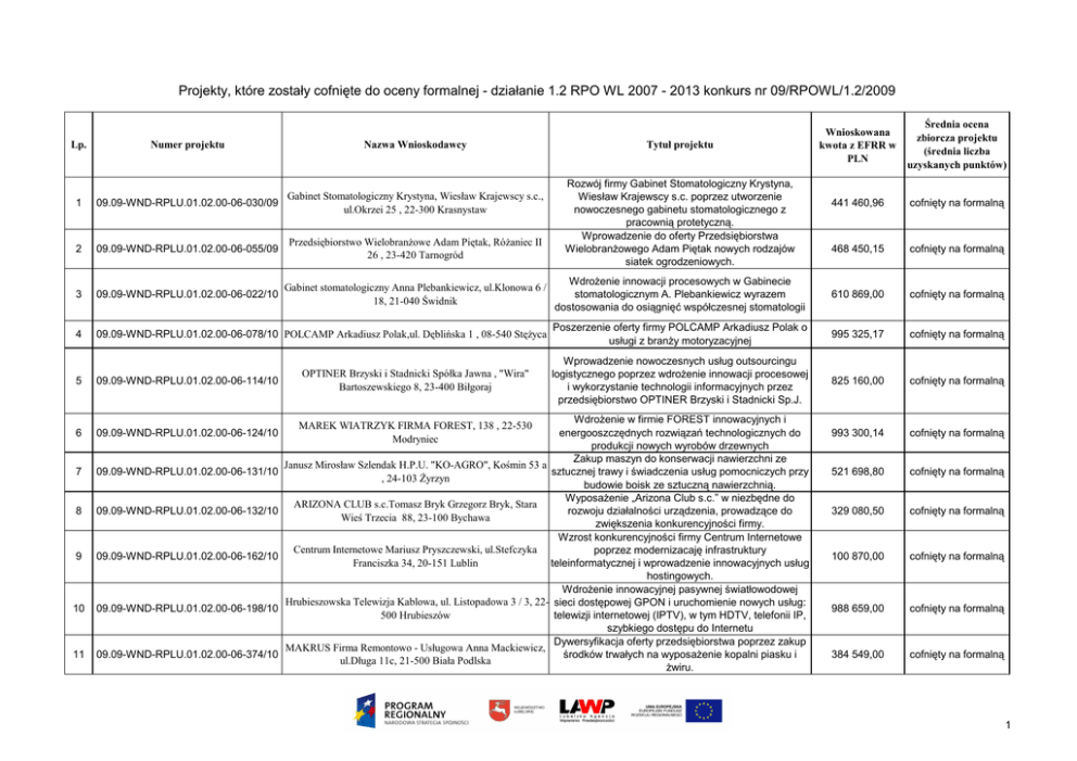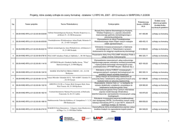 Projekty, które zostały cofnięte do oceny formalnej - działanie 1.2 RPO WL 2007 - 2013 konkurs nr 09/RPOWL/1.2/2009 Lp. Numer projektu Nazwa Wnioskodawcy Tytuł projektu Rozwój firmy Gabinet Stomatologiczny Krystyna, Wiesław Krajewscy s.c. poprzez utworzenie nowoczesnego gabinetu stomatologicznego z pracownią protetyczną. Wprowadzenie do oferty Przedsiębiorstwa WielobranŜowego Adam Piętak nowych rodzajów siatek ogrodzeniowych. Wnioskowana kwota z EFRR w PLN Średnia ocena zbiorcza projektu (średnia liczba uzyskanych punktów) 441 460,96 cofnięty na formalną 468 450,15 cofnięty na formalną 1 Gabinet Stomatologiczny Krystyna, Wiesław Krajewscy s.c., 09.09-WND-RPLU.01.02.00-06-030/09 ul.Okrzei 25 , 22-300 Krasnystaw 2 09.09-WND-RPLU.01.02.00-06-055/09 Przedsiębiorstwo WielobranŜowe Adam Piętak, RóŜaniec II 26 , 23-420 Tarnogród 3 09.09-WND-RPLU.01.02.00-06-022/10 Gabinet stomatologiczny Anna Plebankiewicz, ul.Klonowa 6 / 18, 21-040 Świdnik WdroŜenie innowacji procesowych w Gabinecie stomatologicznym A. Plebankiewicz wyrazem dostosowania do osiągnięć współczesnej stomatologii 610 869,00 cofnięty na formalną 4 09.09-WND-RPLU.01.02.00-06-078/10 POLCAMP Arkadiusz Polak,ul. Dęblińska 1 , 08-540 StęŜyca Poszerzenie oferty firmy POLCAMP Arkadiusz Polak o usługi z branŜy motoryzacyjnej 995 325,17 cofnięty na formalną Wprowadzenie nowoczesnych usług outsourcingu logistycznego poprzez wdroŜenie innowacji procesowej i wykorzystanie technologii informacyjnych przez przedsiębiorstwo OPTINER Brzyski i Stadnicki Sp.J. 825 160,00 cofnięty na formalną 993 300,14 cofnięty na formalną 521 698,80 cofnięty na formalną 329 080,50 cofnięty na formalną 100 870,00 cofnięty na formalną 988 659,00 cofnięty na formalną 384 549,00 cofnięty na formalną 5 09.09-WND-RPLU.01.02.00-06-114/10 6 09.09-WND-RPLU.01.02.00-06-124/10 7 09.09-WND-RPLU.01.02.00-06-131/10 8 09.09-WND-RPLU.01.02.00-06-132/10 9 09.09-WND-RPLU.01.02.00-06-162/10 10 09.09-WND-RPLU.01.02.00-06-198/10 11 09.09-WND-RPLU.01.02.00-06-374/10 OPTINER Brzyski i Stadnicki Spółka Jawna , "Wira" Bartoszewskiego 8, 23-400 Biłgoraj WdroŜenie w firmie FOREST innowacyjnych i energooszczędnych rozwiązań technologicznych do produkcji nowych wyrobów drzewnych Zakup maszyn do konserwacji nawierzchni ze Janusz Mirosław Szlendak H.P.U. "KO-AGRO", Kośmin 53 a sztucznej trawy i świadczenia usług pomocniczych przy , 24-103 śyrzyn budowie boisk ze sztuczną nawierzchnią. WyposaŜenie „Arizona Club s.c.” w niezbędne do ARIZONA CLUB s.c.Tomasz Bryk Grzegorz Bryk, Stara rozwoju działalności urządzenia, prowadzące do Wieś Trzecia 88, 23-100 Bychawa zwiększenia konkurencyjności firmy. Wzrost konkurencyjności firmy Centrum Internetowe Centrum Internetowe Mariusz Pryszczewski, ul.Stefczyka poprzez modernizacaję infrastruktury Franciszka 34, 20-151 Lublin teleinformatycznej i wprowadzenie innowacyjnych usług hostingowych. WdroŜenie innowacyjnej pasywnej światłowodowej Hrubieszowska Telewizja Kablowa, ul. Listopadowa 3 / 3, 22- sieci dostępowej GPON i uruchomienie nowych usług: 500 Hrubieszów telewizji internetowej (IPTV), w tym HDTV, telefonii IP, szybkiego dostępu do Internetu Dywersyfikacja oferty przedsiębiorstwa poprzez zakup MAKRUS Firma Remontowo - Usługowa Anna Mackiewicz, środków trwałych na wyposaŜenie kopalni piasku i ul.Długa 11c, 21-500 Biała Podlska Ŝwiru. MAREK WIATRZYK FIRMA FOREST, 138 , 22-530 Modryniec 1 12 09.09-WND-RPLU.01.02.00-06-379/10 13 09.09-WND-RPLU.01.02.00-06-454/10 14 09.09-WND-RPLU.01.02.00-06-477/10 15 09.09-WND-RPLU.01.02.00-06-494/10 16 09.09-WND-RPLU.01.02.00-06-539/10 Rozwój firmy GRAN-POL poprzez wdroŜenie innowacyjnych w skali świata rozwiązań technologicznych i produktowych w zakresie cięcia kamienia. Wzrost konkurencyjności przedsiębiorstwa na rynku Wiesława Jabłońska Ewa Wawrzycka Mariola Tworzowska krajowym poprzez zakup innowacyjnych środków S.C. ,ul.Partyzantów 42 / U3, 24-100 Puławy trwałych oraz specjalistycznego oprogramowania. Wzrost innowacyjności przedsiębiorstwa REDLIFE REDLIFE Robert Pałka, Ułanów 7 , 20-554 Lublin Robert Pałka poprzez rozwój produkcji medycznych wyrobów tekstylnych. Firma Handlowo-Usługowa „MOTOHURT” Józef Podsiadło, Podniesienie innowacyjności i konkurencyjności firmy 22-600 Jeziernia MOTOHURT na rynku regionalnym AVIS Ekologiczne place zabaw S. C. Marek Małecki Karina Nowoczesna stolarnia Małecka, Gustawa Morcinka 18, 20-465 Lublin GRAN-POL Stanisław Chomiuk, Derewiczna 3, 21311Komarówka Podlaska 999 875,82 cofnięty na formalną 156 342,00 cofnięty na formalną 964 751,52 cofnięty na formalną 542 180,55 cofnięty na formalną 572 760,00 cofnięty na formalną 2