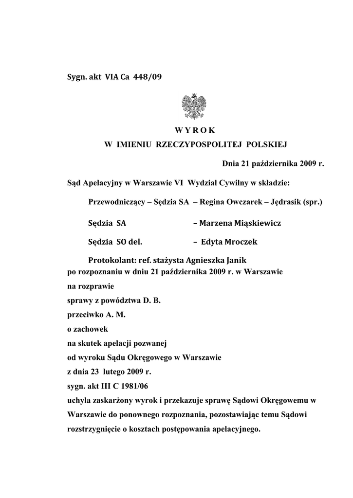 Sygn. akt VIA Ca 448/09 WYROK W IMIENIU RZECZYPOSPOLITEJ POLSKIEJ Dnia 21 października 2009 r. Sąd Apelacyjny w Warszawie VI Wydział Cywilny w składzie: Przewodniczący – Sędzia SA – Regina Owczarek – Jędrasik (spr.) Sędzia SA – Marzena Miąskiewicz Sędzia SO del. – Edyta Mroczek Protokolant: ref. stażysta Agnieszka Janik po rozpoznaniu w dniu 21 października 2009 r. w Warszawie na rozprawie sprawy z powództwa D. B. przeciwko A. M. o zachowek na skutek apelacji pozwanej od wyroku Sądu Okręgowego w Warszawie z dnia 23 lutego 2009 r. sygn. akt III C 1981/06 uchyla zaskarżony wyrok i przekazuje sprawę Sądowi Okręgowemu w Warszawie do ponownego rozpoznania, pozostawiając temu Sądowi rozstrzygnięcie o kosztach postępowania apelacyjnego. 2 Sygn. akt VIA Ca 448 / 09 UZASADNIENIE Wyrokiem z dnia 23 lutego 2009r. Sąd Okręgowy w Warszawie zasądził od pozwanej A. M. na rzecz D. B. tytułem zachowku kwotę 80.367,24 zł wraz z odsetkami ustawowymi od dnia 21 grudnia 2006r. do dnia zapłaty oraz orzekł o kosztach procesu Za podstawę rozstrzygnięcia Sąd Okręgowy przyjął następujące ustalenia. W. M. – ojciec powódki i mąż pozwanej zmarł […] maja 2002r. W. M. pozostawił po sobie testament sporządzony między październikiem a grudniem 1993r. najpierw w formie pisemnej, a później notarialnej, w którym złożył oświadczenie o wydziedziczeniu dzieci z pierwszego małżeństwa, tj. powódki i jej brata, ustanawiając swoją jedyną spadkobierczynią drugą żonę – pozwaną A. M. Przyczyną złożenia takiego oświadczenia woli przez spadkodawcę było jego rozżalenie wobec dzieci, czemu dawał wyraz w rozmowach z żoną i odwiedzającymi ich bliskimi i znajomymi. Powódce spadkodawca zarzucał niewdzięczność wskazując, iż powódka -mimo zainwestowania w jej edukację znacznych środków pieniężnych- nie podjęła nigdy pracy zawodowej, nie była w pełni samodzielna i zawsze polegała na jego pomocy finansowej, natomiast nie pomagała mu w sytuacjach, kiedy on potrzebował pomocy. Ponadto w rozmowach W. M. twierdził, że powódka utrudniała mu kontakt z wnukami, nie odwiedzała go i on również nie był u niej mile widziany. W. M. często relacjonował incydent, który miał miejsce po śmierci jego pierwszej żony, w 3 trakcie którego – jak twierdził- powódka i jej brat żądali opuszczenia przez niego mieszkania i doszło między nimi do szarpaniny. Stosunki między W. M. a jego dziećmi można podzielić na dwa okresy. Powódka i jej brat nie akceptowali małżeństwa ojca z pozwaną, przy czym powódka czyniła ojcu wyrzuty natury emocjonalnej, zarzucając mu związek z pozwaną jeszcze przed śmiercią matki. Taka sytuacja spowodowała znaczne oziębienie wzajemnych relacji między dziećmi a ich ojcem, lecz nie doprowadziła do ich całkowitego zerwania. Powódka nie zabraniała kontaktów W. M. z wnukami i prawnukami, widywała się także z ojcem sporadycznie przy okazji spotkań rodzinnych. Odbudowa kontaktów między powódką i jej ojcem trwała długo i uległa poprawie od roku 1990, by około roku 2000 nabrać charakteru mniej oficjalnego, a bardziej serdecznego. Powódka była także u ojca w szpitalu w ostatnich dniach jego życia. Mimo serdecznej oprawy i częstszych spotkań z córką, spadkodawca nadal żywił do niej negatywne emocje, wypowiadając się na jej temat do żony w sposób niepochlebny; nie rozumiał jej pretensji; uważał, iż powinna ona opiekować się nim i pomagać w każdej sytuacji zwłaszcza, że zapewnił jej odpowiedni strat życiowy. Powódka i jej mąż otrzymali […] lipca 1977r. od spadkodawcy i matki powódki nieruchomość gruntową w K. J., którą powódka z mężem zbyli […] lipca 1997r. za kwotę 615.312 zł. W. M. odzyskał – bez pomocy dzieci – od Skarbu Państwa nieruchomość przy ul. […] w W. zabudowaną wielo-mieszkaniową kamienicą, przy czym jego udział w tej nieruchomości wynosił 4/6, a udział jego dzieci po 1/6. Po dokonaniu niezbędnych remontów nieruchomości W. M. wraz z dziećmi zbyli w dniach […] kwietnia 1999r., […] maja 2000r. i […] lipca 2000r. prawa do nieruchomości przy ul. […]. Łącznie z tego tytułu W. M. uzyskał kwotę 746.22,66 zł. 4 Postanowieniem z dnia […] marca 2006r. Sąd Rejonowy dla Warszawy Mokotowa stwierdził, że spadek po W. M. na podstawie testamentu notarialnego sporządzonego […] grudnia 1993r. przed notariuszem B. W. w W. za numerem repertorium […], otwartego i ogłoszonego w Sądzie Rejonowym dla Warszawy Mokotowa na rozprawie w dniu […] lutego 2006r., nabyła w całości żona A. D. M. W decyzji Naczelnika Urzędu Skarbowego w Piasecznie z dnia […] czerwca 2006r. ustalającej wysokość podatku od spadku i darowizn ustalono czystą wartość majątku nabytego przez A. M. na skutek nabycia spadku po W. M. na kwotę 179.893,00 zł. W tak ustalonym stanie faktycznym Sąd Okręgowy uznał powództwo o zapłatę kwoty 80.367,24 zł za zasadne. Sąd I instancji wskazał, że podstawę prawną dochodzonego roszczenia stanowi przepis art. 991 § 1 k.c. , w myśl którego zstępnym spadkodawcy, którzy byliby powołani do spadku z ustawy, należą się, jeżeli uprawniony jest trwale niezdolny do pracy dwie trzecie wartości udziału spadkowego, który by mu przypadł w dziedziczeniu ustawowym. Zdaniem Sądu Okręgowego pozwana przyznała rację powódce odnośnie wysokości schedy spadkowej w chwili otwarcia spadku, twierdzenie zaś powódki o jej trwałej niezdolności do pracy w chwili otwarcia spadku znajduje uzasadnienie w dokumentacji medycznej. Z tych względów Sąd I instancji uwzględnił wyliczenia powódki co do kwoty zachowku. Sąd Okręgowy podkreślił, iż co do wysokości kwoty spadku bardziej przekonujące były dokumenty złożone przez powódkę, decyzja zaś Urzędu Skarbowego nie jest miarodajna jako wydana cztery lata po otwarciu spadku oraz z tej przyczyny, że urzędy skarbowe nie maj