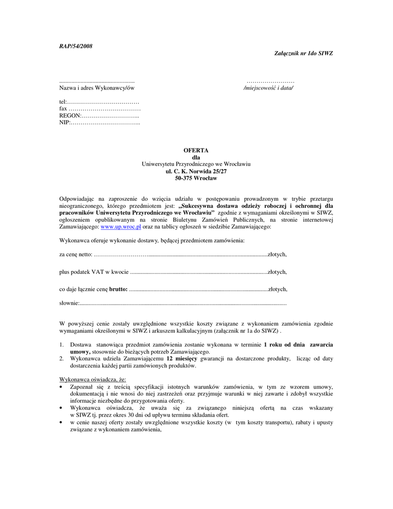 RAP/54/2008 Załącznik nr 1do SIWZ .................................................. Nazwa i adres Wykonawcy/ów …………………… /miejscowość i data/ tel:……………………………… fax ……………………………… REGON:……………………….. NIP:…………………………….. OFERTA dla Uniwersytetu Przyrodniczego we Wrocławiu ul. C. K. Norwida 25/27 50-375 Wrocław Odpowiadając na zaproszenie do wzięcia udziału w postępowaniu prowadzonym w trybie przetargu nieograniczonego, którego przedmiotem jest: „Sukcesywna dostawa odzieży roboczej i ochronnej dla pracowników Uniwersytetu Przyrodniczego we Wrocławiu” zgodnie z wymaganiami określonymi w SIWZ, ogłoszeniem opublikowanym na stronie Biuletynu Zamówień Publicznych, na stronie internetowej Zamawiającego: www.up.wroc.pl oraz na tablicy ogłoszeń w siedzibie Zamawiającego: Wykonawca oferuje wykonanie dostawy, będącej przedmiotem zamówienia: za cenę netto: ………………………...............................................................................złotych, plus podatek VAT w kwocie ...........................................................................................złotych, co daje łącznie cenę brutto: ............................................................................................złotych, słownie:......................................................................................................................................... W powyższej cenie zostały uwzględnione wszystkie koszty związane z wykonaniem zamówienia zgodnie wymaganiami określonymi w SIWZ i arkuszem kalkulacyjnym (załącznik nr 1a do SIWZ) . 1. 2. Dostawa stanowiąca przedmiot zamówienia zostanie wykonana w terminie 1 roku od dnia zawarcia umowy, stosownie do bieżących potrzeb Zamawiającego. Wykonawca udziela Zamawiającemu 12 miesięcy gwarancji na dostarczone produkty, licząc od daty dostarczenia każdej partii zamówionych produktów. Wykonawca oświadcza, że: • Zapoznał się z treścią specyfikacji istotnych warunków zamówienia, w tym ze wzorem umowy, dokumentacją i nie wnosi do niej zastrzeżeń oraz przyjmuje warunki w niej zawarte i zdobył wszystkie informacje niezbędne do przygotowania oferty. • Wykonawca oświadcza, że uważa się za związanego niniejszą ofertą na czas wskazany w SIWZ tj. przez okres 30 dni od upływu terminu składania ofert. • w cenie naszej oferty zostały uwzględnione wszystkie koszty (w tym koszty transportu), rabaty i upusty związane z wykonaniem zamówienia, 3. Następujące roboty objęte zamówieniem będą wykonane przez podwykonawcę/ów: ................................................................................................................................................................................... ................................................................................................................................................................................... ................................................................................................................................................................................... ................................................................................................................................................................................... ................................................................................................................................................................................... ................................................................................................................................................................................... ................................................................................................................................................................................... (wypełnić jeżeli dotyczy) 4. Wykonawca oświadcza ponadto, że zapoznał się z postanowieniami umowy określonymi w załączniku nr 5 do SIWZ i nie wnosi do nich zastrzeżeń oraz, że po uprawomocnieniu się wyboru jego oferty, zobowiązuje się on do zawarcia umowy zgodnej z niniejszą ofertą na warunkach określonych w SIWZ, w miejscu i terminie wskazanym przez Zamawiającego. 5. Oferta została złożona na ...................... od nr ............... do nr .................... 6. Nr faxu …………………………………….., na który Zamawiający będzie zgłaszał zapotrzebowanie na zamawiany asortyment. stronach podpisanych i kolejno ponumerowanych Integralną część oferty stanowią następujące dokumenty: 1/ .................................................................................................... 2/ .................................................................................................... 3/ .................................................................................................... 4/ .................................................................................................... 5/ .................................................................................................... 6/ .................................................................................................... 7/ .................................................................................................... 8/ ………………………………………………………………… 9/ ………………………………………………………………… 10/ ……………………………………………………………….. 11/ ……………………………………………………………….. 12/ ……………………………………………………………….. ..........................., dnia ............ .................................................... Podpis(y) osoby/osób upoważnionej/ych do reprezentacji Wykonawcy/ów