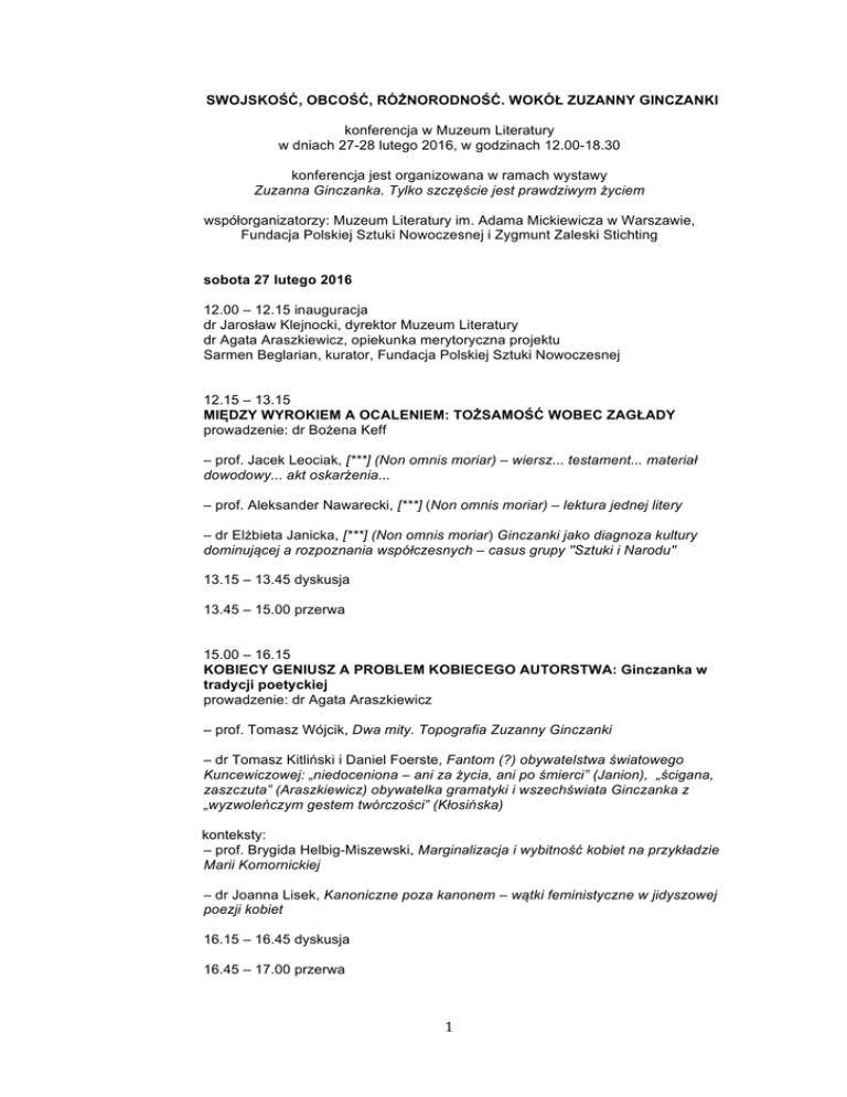 SWOJSKOŚĆ, OBCOŚĆ, RÓŻNORODNOŚĆ. WOKÓŁ ZUZANNY GINCZANKI konferencja w Muzeum Literatury w dniach 27-28 lutego 2016, w godzinach 12.00-18.30 konferencja jest organizowana w ramach wystawy Zuzanna Ginczanka. Tylko szczęście jest prawdziwym życiem współorganizatorzy: Muzeum Literatury im. Adama Mickiewicza w Warszawie, Fundacja Polskiej Sztuki Nowoczesnej i Zygmunt Zaleski Stichting sobota 27 lutego 2016 12.00 – 12.15 inauguracja dr Jarosław Klejnocki, dyrektor Muzeum Literatury dr Agata Araszkiewicz, opiekunka merytoryczna projektu Sarmen Beglarian, kurator, Fundacja Polskiej Sztuki Nowoczesnej 12.15 – 13.15 MIĘDZY WYROKIEM A OCALENIEM: TOŻSAMOŚĆ WOBEC ZAGŁADY prowadzenie: dr Bożena Keff – prof. Jacek Leociak, [***] (Non omnis moriar) – wiersz... testament... materiał dowodowy... akt oskarżenia... – prof. Aleksander Nawarecki, [***] (Non omnis moriar) – lektura jednej litery – dr Elżbieta Janicka, [***] (Non omnis moriar) Ginczanki jako diagnoza kultury dominującej a rozpoznania współczesnych – casus grupy "Sztuki i Narodu" 13.15 – 13.45 dyskusja 13.45 – 15.00 przerwa 15.00 – 16.15 KOBIECY GENIUSZ A PROBLEM KOBIECEGO AUTORSTWA: Ginczanka w tradycji poetyckiej prowadzenie: dr Agata Araszkiewicz – prof. Tomasz Wójcik, Dwa mity. Topografia Zuzanny Ginczanki – dr Tomasz Kitliński i Daniel Foerste, Fantom (?) obywatelstwa światowego Kuncewiczowej: „niedoceniona – ani za życia, ani po śmierci” (Janion), „ścigana, zaszczuta” (Araszkiewicz) obywatelka gramatyki i wszechświata Ginczanka z „wyzwoleńczym gestem twórczości” (Kłosińska) konteksty: – prof. Brygida Helbig-Miszewski, Marginalizacja i wybitność kobiet na przykładzie Marii Komornickiej – dr Joanna Lisek, Kanoniczne poza kanonem – wątki feministyczne w jidyszowej poezji kobiet 16.15 – 16.45 dyskusja 16.45 – 17.00 przerwa 1 17.00 – 18.30 ODSŁONY INNOŚCI: MELANCHOLIA, WYKLUCZENIE, MARGINESY KANONU panel dyskusyjny prowadzenie: Sylwia Chutnik uczestniczą: dr hab. Tomasz Basiuk, dr hab. Arleta Galant, Agnieszka Tarasiuk, prof. Marek Wasilewski niedziela 28 lutego 2016 12.30 – 13.30 POSTULAT WIELOKULTUROWOŚCI I RÓŻNORODNOŚCI A TEMAT ZAGŁADY W KULTURZE prowadzenie: prof. Andrzej Stanisław Kowalczyk – Ryszard Kotarba, Śmierć poetki. Zuzanna Ginczanka w Krakowie 1942-1944 – prof. Andrzej Leder, Zagłada, uchodźcy, odpowiedzialność – prof. Przemysław Czapliński, Wielość, inność, konflikt. Polska wojna kulturowa z perspektywy literackiej 13.30 – 14.00 dyskusja 14.00 – 15.30 SWOJSKOŚĆ/OBCOŚĆ A TOŻSAMOŚĆ NARODOWA panel dyskusyjny prowadzenie: prof. Magdalena Środa uczestniczą: Yaron Karol Becker, dr Jacek Dobrowolski, dr Sergiusz Kowalski, dr Piotr Paziński, dr Patrycja Sasnal 15.30 – 16.00 dyskusja 16.00 – 17.00 przerwa 17.00 – 19.00 KOBIECOŚĆ, ZAGŁADA I UWIKŁANIE W PATRIARCHALNĄ OPRESJĘ pokaz filmów Aneta Grzeszykowska, Bolimorfia, 2008, 7’21’’ Anna Baumgart, Świeże wiśnie, 2010, 19’06’’ Jean-Gabriel Périot, Nawet gdyby była zbrodniarką…, 2006, 9’39’’ panel dyskusyjny prowadzenie: dr Iwona Kurz uczestniczą: dr Katarzyna Bojarska, Karol Sienkiewicz, Weronika Szczawińska 19.30 – Finisaż wystawy w Muzeum Literatury w programie – wiersze Zuzanny Ginczanki w interpretacji Katarzyny Herman Lusia Stauber czyta [***] (Non omnis moriar) 2