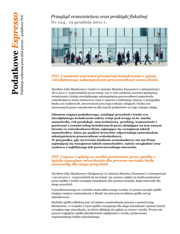 Publikacja wydawana przez dział prawno – podatkowy PwC Podatkowe Espresso Przegląd orzecznictwa oraz praktyki fiskalnej Nr 124, 15 grudnia 2011 r. PIT: Ustalenia wartości pieniężnej świadczenia z tytułu nieodpłatnego udostępnienia pracownikowi samochodu Dyrektor Izby Skarbowej w Łodzi (w imieniu Ministra Finansów) w interpretacji z 18.11.2011 r. wypowiedział się na temat, czy w celu ustalenia wartości pieniężnej świadczenia z tytułu nieodpłatnego udostępnienia pracownikowi samochodu, wnioskodawca może zastosować cenę w oparciu o kalkulację własną, w przypadku braku cen rynkowych, stosowanych przy tego rodzaju usługach i braku cen stosowanych przez wnioskodawcę dla innych podmiotów za tego rodzaju usługi. Zdaniem organu podatkowego, ustalając przychód z tytułu ww. nieodpłatnego świadczenia należy wziąć pod uwagę m.in. markę samochodu, rok produkcji, stan techniczny, przebieg, wyposażenie i porównać z cenami usług świadczonych przez działające na tym samym terenie co wnioskodawca firmy zajmujące się wynajmem takich samochodów, które po analizie kryteriów odpowiadają samochodom udostępnianym pracownikom wnioskodawcy. W przypadku, gdy na terenie działania wnioskodawcy nie ma firmy zajmującej się wynajmem takich samochodów, należy uwzględnić ceny rynkowe z najbliższego lub porównywalnego otoczenia. PIT: Czynsz i opłaty za media poniesione przez spółkę z tytułu wynajmu mieszkania dla prezesa zarządu będą stanowiły dla niego przychód Dyrektor Izby Skarbowej w Bydgoszczy (w imieniu Ministra Finansów) w interpretacji z 30.09.2011 r. wypowiedział się na temat, czy czynsz i opłaty za media poniesione przez spółkę z tytułu wynajmu mieszkania dla prezesa zarządu, będą stanowiły dla niego przychód. Z przedstawionego we wniosku stanu faktycznego wynika, że prezes zarządu spółki (mający miejsce zamieszkania w Rosji) nie jest pracownikiem spółki ani jej udziałowcem. Siedziba spółki oddalona jest od miejsca zamieszkania prezesa o ponad tysiąc kilometrów, w związku z czym spółka wynajmuje dla niego mieszkanie i ponosi koszty wynajmu tego mieszkania, na które składają się opłaty za czynsz i media. Prezes nie ponosi względem spółki jakichkolwiek odpłatności z tytułu użytkowania wspomnianego lokalu mieszkalnego. Zdaniem organu podatkowego, prezes zarządu otrzymuje nieodpłatne świadczenie, a tym samym uzyskuje przychód w rozumieniu ustawy o podatku dochodowym od osób fizycznych. Przy ustalaniu wartości nieodpłatnych świadczeń obowiązują zasady określone w odpowiednim przepisie ustawy o podatku dochodowym od osób fizycznych. CIT: Wydatki poniesione w związku z organizacją imprezy jubileuszowej jako koszt uzyskania przychodu Dyrektor Izby Skarbowej w Łodzi (w imieniu Ministra Finansów) w interpretacji z 14.11.2011 r. wypowiedział się w zakresie zaliczenia do kosztów uzyskania przychodów wydatków poniesionych w związku z organizacją imprezy jubileuszowej. Z przedstawionego stanu faktycznego wynika, że wnioskodawca zorganizował imprezę okolicznościową i poniósł wydatki m.in. na wynajem firmy cateringowej, zespołu muzycznego oraz druku zaproszeń. Zdaniem organu podatkowego, kosztami uzyskania przychodów są wszelkie koszty, które zostały poniesione w celu osiągnięcia przychodów oraz które mają związek z prowadzoną działalnością. Zatem wydatki poniesione na zorganizowanie imprezy okolicznościowej, stanowiące koszt statystyczny przypadający na pracowników spółki (wśród zaproszonych byli zarówno pracownicy z osobami towarzyszącymi, jak i kontrahenci) mogą być zaliczone do kosztów uzyskania przychodów. CŁO: Bioetanol ze Stanów Zjednoczonych - możliwe podwyższenie cła Komisja Europejska wszczęła postępowanie antydumpingowe oraz antysubwencyjne dotyczące przywozu bioetanolu pochodzącego ze Stanów Zjednoczonych. Towar ten jest objęty kodami CN ex 2207 10 00, ex 2207 20 00, ex 2208 90 99, ex 2710 11 11, ex 2710 11 15, ex 2710 11 21, ex 2710 11 25, ex 2710 11 31, ex 2710 11 41, ex 2710 11 45, ex 2710 11 49, ex 2710 11 51, ex 2710 11 59, ex 2710 11 70, ex 2710 11 90, ex 3814 00 10, ex 3814 00 90, ex 3820 00 00 oraz ex 3824 90 97. Celem obu prowadzonych postępowań jest odpowiednio ustalenie, czy wspomniany towar był eksportowany z USA po cenach dumpingowych oraz czy władze amerykańskie subwencjonowały wywóz tego towaru. Jeżeli okoliczności te zostaną potwierdzone, Unia Europejska wprowadzi dodatkowe cło antydumpingowe i/lub wyrównawcze (antysubwencyjne), powodujące podwyższenie wartości importowanego bioetanolu o wysokość zaniżenia cen (dumpingu) i/lub przyznanej subwencji. Wynik postępowania w zakresie stosowania dumpingu cenowego ma być znany przed końcem lutego 2013 r., natomiast w odniesieniu do zarzutu subsydiowania nieco wcześniej, tj. przed końcem grudnia 2012 r. Jednakże już przed końcem sierpnia 2012 r. możliwe będzie wprowadzenie tymczasowego cła wyrównawczego, obowiązującego do zakończenia procedury antysubwencyjnej. Zastrzeżenie prawne: Przegląd orzecznictwa oraz praktyki fiskalnej ma jedynie charakter informacyjny i nie może stanowić jedynej podstawy do podejmowania działań. © 2011 PricewaterhouseCoopers Sp. z o.o. Wszystkie prawa zastrzeżone. W tym dokumencie nazwa "PwC" odnosi się do PricewaterhouseCoopers Sp. z o.o., firmy wchodzącej w skład sieci PricewaterhouseCoopers International Limited, z których każda stanowi odrębny i niezależny podmiot prawny. Takiego środka nie przewiduje sie w przypadku postępowania antydumpingowego. Okoliczności te powinny zostać uwzględnione przez importerów oraz użytkowników tych towarów przy kalkulacji opłacalności transakcji importowych. Przetestuj taxonline.pl Zeskanuj kod W przypadku pytań, prosimy o kontakt z Tomaszem Misiakiem: [email protected], Tel.: 22 523 4858, tel. kom.: 502 18 4858 – z e s k a n u j www.taxonline.pl/testowy