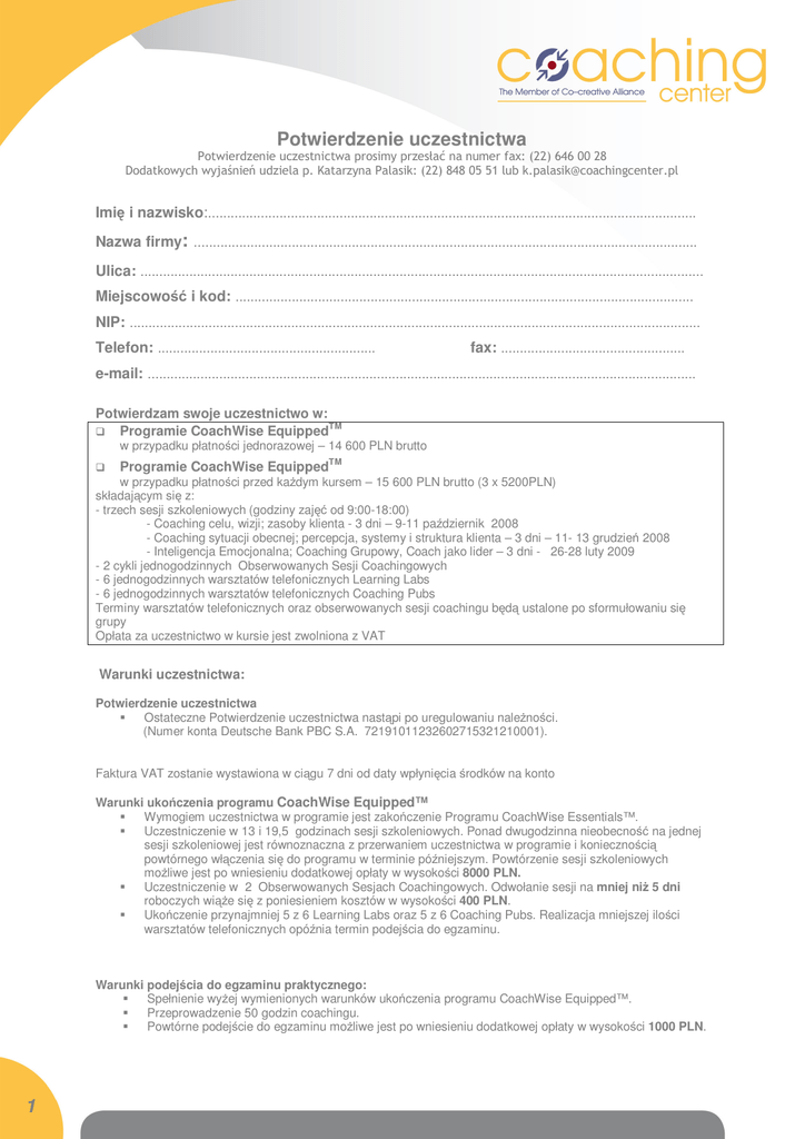 Potwierdzenie uczestnictwa Potwierdzenie uczestnictwa prosimy przesłać na numer fax: (22) 646 00 28 Dodatkowych wyjaśnień udziela p. Katarzyna Palasik: (22) 848 05 51 lub [email protected] Imię i nazwisko:.................................................................................................................................. Nazwa firmy: ...................................................................................................................................... Ulica: ...................................................................................................................................................... Miejscowość i kod: .......................................................................................................................... NIP: ........................................................................................................................................................ Telefon: .......................................................... fax: ................................................. e-mail: .................................................................................................................................................. Potwierdzam swoje uczestnictwo w: TM Programie CoachWise Equipped w przypadku płatności jednorazowej – 14 600 PLN brutto Programie CoachWise EquippedTM w przypadku płatności przed każdym kursem – 15 600 PLN brutto (3 x 5200PLN) składającym się z: - trzech sesji szkoleniowych (godziny zajęć od 9:00-18:00) - Coaching celu, wizji; zasoby klienta - 3 dni – 9-11 październik 2008 - Coaching sytuacji obecnej; percepcja, systemy i struktura klienta – 3 dni – 11- 13 grudzień 2008 - Inteligencja Emocjonalna; Coaching Grupowy, Coach jako lider – 3 dni - 26-28 luty 2009 - 2 cykli jednogodzinnych Obserwowanych Sesji Coachingowych - 6 jednogodzinnych warsztatów telefonicznych Learning Labs - 6 jednogodzinnych warsztatów telefonicznych Coaching Pubs Terminy warsztatów telefonicznych oraz obserwowanych sesji coachingu będą ustalone po sformułowaniu się grupy Opłata za uczestnictwo w kursie jest zwolniona z VAT Warunki uczestnictwa: Potwierdzenie uczestnictwa Ostateczne Potwierdzenie uczestnictwa nastąpi po uregulowaniu należności. (Numer konta Deutsche Bank PBC S.A. 72191011232602715321210001). Faktura VAT zostanie wystawiona w ciągu 7 dni od daty wpłynięcia środków na konto Warunki ukończenia programu CoachWise Equipped™ Wymogiem uczestnictwa w programie jest zakończenie Programu CoachWise Essentials™. Uczestniczenie w 13 i 19,5 godzinach sesji szkoleniowych. Ponad dwugodzinna nieobecność na jednej sesji szkoleniowej jest równoznaczna z przerwaniem uczestnictwa w programie i koniecznością powtórnego włączenia się do programu w terminie późniejszym. Powtórzenie sesji szkoleniowych możliwe jest po wniesieniu dodatkowej opłaty w wysokości 8000 PLN. Uczestniczenie w 2 Obserwowanych Sesjach Coachingowych. Odwołanie sesji na mniej niż 5 dni roboczych wiąże się z poniesieniem kosztów w wysokości 400 PLN. Ukończenie przynajmniej 5 z 6 Learning Labs oraz 5 z 6 Coaching Pubs. Realizacja mniejszej ilości warsztatów telefonicznych opóźnia termin podejścia do egzaminu. Warunki podejścia do egzaminu praktycznego: Spełnienie wyżej wymienionych warunków ukończenia programu CoachWise Equipped™. Przeprowadzenie 50 godzin coachingu. Powtórne podejście do egzaminu możliwe jest po wniesieniu dodatkowej opłaty w wysokości 1000 PLN. 1 Liczebność grup szkoleniowych: Maksymalna ilość osób na sesji szkoleniowej – 26 osób Maksymalna ilość osób na warsztacie telefonicznym – 15 osób Odwołanie udziału w programie W przypadku odwołania uczestnictwa na mniej niż 21 dni lub nieobecności w programie uczestnik będzie miał możliwość uczestniczenia w programie w innym terminie pod warunkiem wniesienia dodatkowej opłaty w wysokości 8000 PLN . Warunki odwołania programu Coaching Center zastrzega sobie prawo do odwołania programu bądź do zaproponowania uczestnikowi alternatywnego terminu tego samego programu nie ponosząc z tego tytułu odpowiedzialności. W przypadku odwołania programu Coaching Center zwróci całość uprzednio wniesionych opłat. Dane osobowe Wyrażam zgodę na wykorzystywanie i przetwarzanie moich danych osobowych do celów marketingowych organizatora (zgodnie z ustawą z 29.08.1997 roku o ochronie danych osobowych Dz. U. Nr 133, poz.833), a w szczególności zgadzam się na otrzymywanie informacji handlowej od organizatora w rozumieniu Ustawy z 18 lipca 2002 r. o świadczeniu usług drogą elektroniczną na podane wyżej adresy e-mail. Podpisanie zgłoszenia równoznaczne jest z akceptacją powyższych warunków oraz upoważnia organizatora do wystawienia faktury bez składania podpisu przez osobę upoważnioną ze strony firmy płatnika. Data: ........................................... 2 Podpis/pieczęć: ..................................