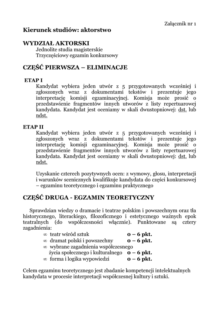 Załącznik nr 1 Kierunek studiów: aktorstwo WYDZIAŁ AKTORSKI Jednolite studia magisterskie Trzyczęściowy egzamin konkursowy CZĘŚĆ PIERWSZA – ELIMINACJE ETAP I Kandydat wybiera jeden utwór z 5 przygotowanych wcześniej i zgłoszonych wraz z dokumentami tekstów i prezentuje jego interpretację komisji egzaminacyjnej. Komisja może prosić o przedstawienie fragmentów innych utworów z listy repertuarowej kandydata. Kandydat jest oceniamy w skali dwustopniowej: dst. lub ndst. ETAP II Kandydat wybiera jeden utwór z 5 przygotowanych wcześniej i zgłoszonych wraz z dokumentami tekstów i prezentuje jego interpretację komisji egzaminacyjnej. Komisja może prosić o przedstawienie fragmentów innych utworów z listy repertuarowej kandydata. Kandydat jest oceniamy w skali dwustopniowej: dst. lub ndst. Uzyskanie czterech pozytywnych ocen: z wymowy, głosu, interpretacji i warunków scenicznych kwalifikuje kandydata do części konkursowej – egzaminu teoretycznego i egzaminu praktycznego CZĘŚĆ DRUGA - EGZAMIN TEORETYCZNY Sprawdzian wiedzy o dramacie i teatrze polskim i powszechnym oraz tła historycznego, literackiego, filozoficznego i estetycznego ważnych epok teatralnych (do współczesności włącznie). Punktowane są cztery zagadnienia: • teatr wśród sztuk 0 – 6 pkt. • dramat polski i powszechny 0 – 6 pkt. • wybrane zagadnienia współczesnego życia społecznego i kulturalnego 0 – 6 pkt. • forma i logika wypowiedzi 0 – 6 pkt. Celem egzaminu teoretycznego jest zbadanie kompetencji intelektualnych kandydata w procesie interpretacji współczesnej kultury i sztuki. Z uwagi na specyficzny zakres wymaganej wiedzy sprawdzian obowiązuje wszystkich kandydatów. Kandydaci mogą uzyskać na egzaminie teoretycznym max. 24 pkt. CZĘŚĆ TRZECIA - EGZAMIN PRAKTYCZNY składa się z dwóch punktowanych etapów: 1. Egzamin rytmiczno-ruchowy: • sprawność fizyczna 0 - 10 pkt. • sprawność taneczno - rytmiczna 0 - 10 pkt. Kandydat może uzyskać max.: 20 pkt 2. Egzamin aktorski: • warunki dykcyjne 0 – 15 pkt. • warunki głosowe 0 – 15 pkt. • interpretacja tekstów 0 – 15 pkt. • zadania aktorskie 0 – 15 pkt. • interpretacja piosenki 0 – 15 pkt. • warunki sceniczne 0 – 15 pkt. Kandydat może uzyskać max.: 90 pkt. W całym egzaminie praktycznym kandydat może uzyskać max. 110 pkt. * O przyjęciu na pierwszy rok studiów na Wydział Aktorski decyduje ogólna suma punktów uzyskana przez kandydata z egzaminu teoretycznego, praktycznego i języka obcego. Załącznik nr 2 Kierunek studiów: reżyseria WYDZIAŁ REŻYSERII Jednolite studia magisterskie egzamin konkursowy w trzech etapach. I ETAP – ELIMINACJA WSTĘPNA odbywa się na podstawie składanej wraz z dokumentami kandydata pracy (egzemplarz reżyserski wybranego przez kandydata dramatu lub adaptacji scenicznej prozy). Pracę czyta dwóch recenzentów – wykładowców przedmiotu głównego. Na specjalnym posiedzeniu komisja praktyczna (bez scenografów) na podstawie pisemnych opinii recenzentów ocenia pracę w skali od 0 do 11 pkt. (0 pkt = ocena niedostateczna) i sporządza listę osób dopuszczonych do II etapu. II ETAP – EGZAMIN PRAKTYCZNY Kandydaci przystępują do egzaminów w kolejności ustalonej przez dziekana. Wyniki poszczególnych elementów nie mają wpływu na dopuszczenie do następnych: kandydat musi przystąpić do wszystkich. Opuszczenie któregoś z egzaminów w II etapie oznacza skreślenie z listy kandydatów. Wyniki uzyskane w II etapie nie mają wpływu na dopuszczenie do etapu III, natomiast zwiększają dorobek punktowy kandydata, określający miejsce na liście przed rozpoczęciem III etapu. Egzamin praktyczny składa się z następujących elementów: obrona złożonego egzemplarza reżyserskiego 0 – 11 pkt. realizacja etiudy na zadany temat 0 – 11 pkt. obrona etiudy 0 – 11 pkt. praca z aktorem 0 – 11 pkt. rysunek 0 – 11 pkt. umuzykalnienie 0 – 11 pkt. spostrzegawczość 0 – 11 pkt. wyobraźnia 0 – 11 pkt. skojarzenia 0 – 11 pkt. umiejętności narracyjne 0 – 11 pkt. porównania 0 – 11 pkt. komiks 0 – 11 pkt. zdolności aktorskie 0 – 11 pkt. sprawdzian predyspozycji zawodowej do studiów reżyserskich 0 – 20 pkt. III ETAP – EGZAMIN TEORETYCZNY Sprawdzian wiedzy o dramacie i teatrze polskim i powszechnym oraz tła historycznego, literackiego, filozoficznego i estetycznego ważnych epok teatralnych (do współczesności włącznie). Punktowane są cztery zagadnienia: • teatr wśród sztuk 0 – 12 pkt. • dramat polski i powszechny 0 – 12 pkt. • wybrane zagadnienia współczesnego życia społecznego i kulturalnego 0 – 12 pkt. • forma i logika wypowiedzi 0 – 12 pkt. Celem egzaminu teoretycznego jest zbadanie kompetencji intelektualnych kandydata w procesie interpretacji współczesnej kultury i sztuki. Z uwagi na specyficzny zakres wymaganej wiedzy sprawdzian obowiązuje wszystkich kandydatów. * O przyjęciu na studia decyduje suma uzyskanych przez kandydata punktów. Załącznik nr 3 Kierunek studiów: aktorstwo WYDZIAŁ SZTUKI LALKARSKIEJ Specjalność: aktorstwo lalkowe Jednolite studia magisterskie egzamin konkursowy w trzech etapach. I ETAP – eliminacje wstępne (obejmuje sprawdzian z podstawowych predyspozycji aktorskich takich jak: głos, słuch, wymowa, interpretacja). Kandydat spośród min. 5 utworów przygotowanych wcześniej wybiera 2 (proza i wiersz) oraz piosenkę i prezentuje ich interpretację komisji egzaminacyjnej. Kandydat jest oceniany w skali dwustopniowej: dst. lub ndst. Uzyskanie czterech pozytywnych ocen (dst.) z wymowy, głosu, interpretacji i umuzykalnienia kwalifikuje kandydata do II etapu egzaminu. II ETAP – egzamin konkursowy (egzamin rytmiczno – ruchowy, egzamin z zakresu „gry z przedmiotem” oraz egzamin aktorski) 1. W części rytmiczno-ruchowej punktowana jest: - sprawność fizyczna 0 – 10 pkt. - sprawność taneczno-rytmiczna 0 – 10 pkt. Kandydat może uzyskać max. 20 p