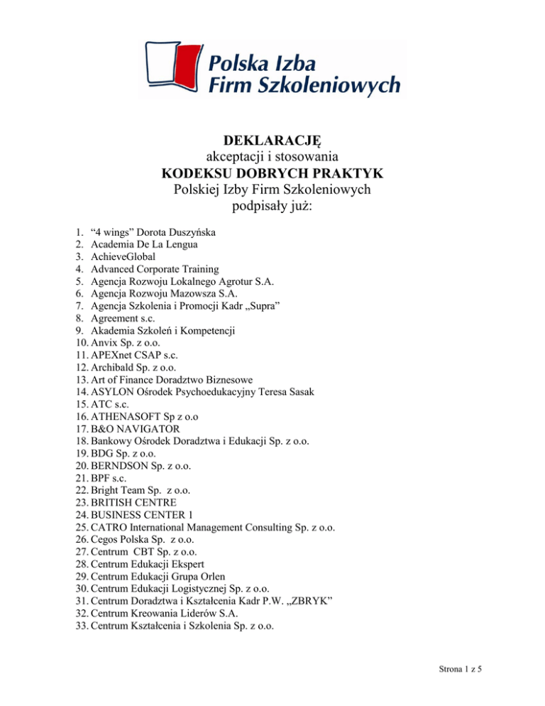 DEKLARACJĘ akceptacji i stosowania KODEKSU DOBRYCH PRAKTYK Polskiej Izby Firm Szkoleniowych podpisały już: 1. “4 wings” Dorota Duszyńska 2. Academia De La Lengua 3. AchieveGlobal 4. Advanced Corporate Training 5. Agencja Rozwoju Lokalnego Agrotur S.A. 6. Agencja Rozwoju Mazowsza S.A. 7. Agencja Szkolenia i Promocji Kadr „Supra” 8. Agreement s.c. 9. Akademia Szkoleń i Kompetencji 10. Anvix Sp. z o.o. 11. APEXnet CSAP s.c. 12. Archibald Sp. z o.o. 13. Art of Finance Doradztwo Biznesowe 14. ASYLON Ośrodek Psychoedukacyjny Teresa Sasak 15. ATC s.c. 16. ATHENASOFT Sp z o.o 17. B&O NAVIGATOR 18. Bankowy Ośrodek Doradztwa i Edukacji Sp. z o.o. 19. BDG Sp. z o.o. 20. BERNDSON Sp. z o.o. 21. BPF s.c. 22. Bright Team Sp. z o.o. 23. BRITISH CENTRE 24. BUSINESS CENTER 1 25. CATRO International Management Consulting Sp. z o.o. 26. Cegos Polska Sp. z o.o. 27. Centrum CBT Sp. z o.o. 28. Centrum Edukacji Ekspert 29. Centrum Edukacji Grupa Orlen 30. Centrum Edukacji Logistycznej Sp. z o.o. 31. Centrum Doradztwa i Kształcenia Kadr P.W. „ZBRYK” 32. Centrum Kreowania Liderów S.A. 33. Centrum Kształcenia i Szkolenia Sp. z o.o. Strona 1 z 5 34. Centrum Psychoterapii i Szkoleń Psychologicznych Barbara Gojżewska 35. Centrum Rozwiązań Menedżerskich S.A. 36. Centrum Szkolenia Zawodowego Sp. z o.o. 37. Centrum Szkoleń i Promocji KORA 38. Certes Sp. z o.o. 39. Certus Centrum Szkolenia i Doradztwa Sp. z o.o. 40. Coaching Center 41. Comartin 42. Communication Design Group 43. Communication One Consulting Sp. z o.o. 44. Competir Polska Sp. z o.o. 45. Computer Service Support S.A. 46. Conart Sp. z o.o. 47. C.L. Consulting i Logistyka Sp. z o. o. 48. CS Szkolenie I Doradztwo Sp. z o.o. 49. CE2 Centrum Edukacji M. Dziewa, E. Tarnas-Szwed Sp.j. 50. Denis School Sp. z o.o. 51. Dom szkoleń i doradztwa Mykowska Aleksandra 52. DOOR POLAND Sp. z o.o. 53. Edustacja.pl Sp. z o.o. 54. EFFECT GROUP Sp. z o.o. 55. Ego Centrum Edukacji i Doradztwa 56. Ekologus Sp. z o.o. 57. ENGLISH UNLIMITED 58. EU Partner Sp. z o.o. 59. Europejska Grupa Konsultingowa 60. Europejski Instytut Psychologii Biznesu sp.j. 61. Europejski Instytut Rozwoju Kadr Sp. z o.o. 62. Europejskie Centrum Edukacyjno- Szkoleniowe Sp. z o.o. 63. Europejskie Stowarzyszenie Badań i Rozwoju Inżynierii Informacji, Psychocybernetyki i NLP "COGITATE" 64. EXBIS EKSPERCI BIZNESMENON - Siewierski, Szopa i Szóstak sp. j. 65. Firma Szkoleniowa Agnieszka Wiśniewska - Woźniak 66. Firma Szkoleniowo Doradcza Anna Szywała s.c. 67. FIRMA 2000 Sp. z o.o. 68. Fokus Grupa doradczo – szkoleniowa 69. FPL Sp. z o.o. 70. Fundacja Edukacja Bez Granic 71. Fundacja Nauki Języków Obcych „Linguae Mundi” 72. Fundacja Promocji Europejskiej 73. Fundacja Rozwoju Bankowości Spółdzielczej we Wrocławiu 74. Fundacja Rozwoju Przedsiębiorczości 75. Fundacja „Wałbrzych 2000” 76. Fundacja Warszawski Instytut Bankowości 77. GB Resources Polska Sp. z o.o. 78. G.B. Management s.c. 79. Germanicus Niemieckie Centrum Językowe Sp. z o.o. 80. Geruna s.c. 81. Górnośląska Agencja Przekształceń Przedsiębiorstw S.A. Strona 2 z 5 82. Grupa EK’s Polska 83. Grupa Doradczo - Szkoleniowa 3S 84. Grupa Tempo s.c. 85. GSI GROUP 86. HEIDTMAN&PIASECKI 87. Heuresis Sp. z o.o. 88. Hoffmann Consulting Sp. z o.o. 89. HOUSE OF SKILLS 90. HPR Group Sp. z o.o. 91. HRP s.c. 92. HUMAN CHANGES FACTORY Sp. z o.o. 93. Human Partner 94. Human Solutions 95. IDES Consultants Polska Sp. z o.o. 96. ILS Robert Fiutak 97. IMPACT POLSKA Sp. z o.o. 98. Impuls BTL Sp. z o.o. 99. InfoAudit Sp. z o.o. 100. Informatyczne Centrum Edukacyjne Powiatu Myślenickiego przy ZSTE w Myślenicach 101. Inprogress Michał Pacyna 102. Inspiris Szkolenia Doradztwo Katarzyna Zych 103. Instytut Badań i Rozwoju Gospodarki 104. INTEGRA – Ośrodek Treningów i Konsultacji 105. Inventi Consulting s.c. 106. Invictus Sp. z o.o. 107. IRP 108. ITC CS Sp. z o.o. 109. ITM Centrum Komputerowe Sp. z o.o. 110. J.G. Training Jadwiga Gwóźdź 111. KDK INFO Sp. z o.o. 112. Konsultacje i Szkolenia TROP Sp. z o.o. 113. Kontekst HR Sp. z o.o. 114. Kontrakt OSH 115. Kreator Premium 116. KSK Bezpieczeństwo Sp. z o.o. 117. KWIECIŃSCY Biuro Usług BHP I PPOŻ Dawid Kwieciński 118. K&K Katarzyna Łukaszuk 119. Laboratorium Psychoedukacji – Szkolenia i Doradztwo Sp. z o.o. 120. Lauren Peso Polska Sp. z o.o. 121. Labiedź Consulting 122. LIWAX Liliana Gudalewicz 123. Mazowieckie Centrum Szkoleń Sp. z o.o. 124. MEDIA PLUS Jarosław Zaremba 125. MEDIACON Doradztwo Szkolenia 126. Meditor Ośrodek Kształcenia Ustawicznego 127. MEDIATOR Ośrodek Szkoleń i Doradztwa Gospodarczego Krzysztof Wierzęć 128. MEDVICE Katarzyna Krzesińska 129. Międzynarodowa Szkoła Bankowości i Finansów Sp. z o.o. 130. MODERATOR s.c. Strona 3 z 5 131. MPM prodAction Sp. z o.o. 132. MTD Marek Dziduszko 133. Nowe Horyzonty Świat Sukcesu Jolanta Poźniak 134. Nowe Motywacje Sp. z o.o. 135. Olsztyńska Szkoła Biznesu s.c. 136. Ortus Grzegorz Najda 137. OSI CompuTrain SA 138. Ośrodek Doradztwa i Treningu Kierowniczego 139. Ośrodek Kształcenia Zawodowego „Elpro” Sp. z o.o. 140. Ośrodek Pomocy i Edukacji Psychologicznej INTRA 141. Ośrodek Studiów i Przedsiębiorczości Event Group Sp. z o.o. 142. O.K. Centrum Języków Obcych Sp. z o.o. 143. PDC Consensus 144. Personel Profit Sp. z o.o. 145. Perspektywa Tomasz Tynderenda 146. PIOMAR HOUSE Piotr Dzikowski 147. PM – Doradztwo Gospodarcze Sp. z o.o. 148. Polska Akademia Rachunkowości S.A. 149. Polska Izba Przemysłu Farmaceutycznego i Wyrobów Medycznych „POLFARMED” 150. Polska Organizacja Pracodawców Osób Niepełnosprawnych 151. Polskie Centrum Certyfikacji Sp. z o.o. 152. Pomorska Akademia Kształcenia Zawodowego w Słupsku Sp. z o.o. 153. Praxis s.c. 154. PRO Consulting Group Inspiracje dla rozwoju Sp. z o.o. 155. Profes 156. Professional Business Law Medicine 157. Profirma Sp. z o.o. 158. ProKadra 159. Proqual Management Institute 160. PROSPERA Consulting Renata Kaczyńska - Maci