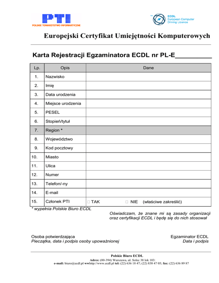 Europejski Certyfikat Umiejętności Komputerowych Karta Rejestracji Egzaminatora ECDL nr PL-E__________ Lp. Opis 1. Nazwisko 2. Imię 3. Data urodzenia 4. Miejsce urodzenia 5. PESEL 6. Stopień/tytuł 7. Region * 8. Województwo 9. Kod pocztowy 10. Miasto 11. Ulica 12. Numer 13. Telefon/-ny 14. E-mail 15. Członek PTI Dane TAK NIE (właściwe zakreślić) * wypełnia Polskie Biuro ECDL Oświadczam, że znane mi są zasady organizacji oraz certyfikacji ECDL i będę się do nich stosował Osoba potwierdzająca Pieczątka, data i podpis osoby upoważnionej Egzaminator ECDL Data i podpis Polskie Biuro ECDL Adres: (00-394) Warszawa, ul. Solec 38 lok 103: e-mail: [email protected] wwhttp://www.ecdl.pl tel: (22) 636 18 47; (22) 838 47 05; fax: (22) 636 89 87