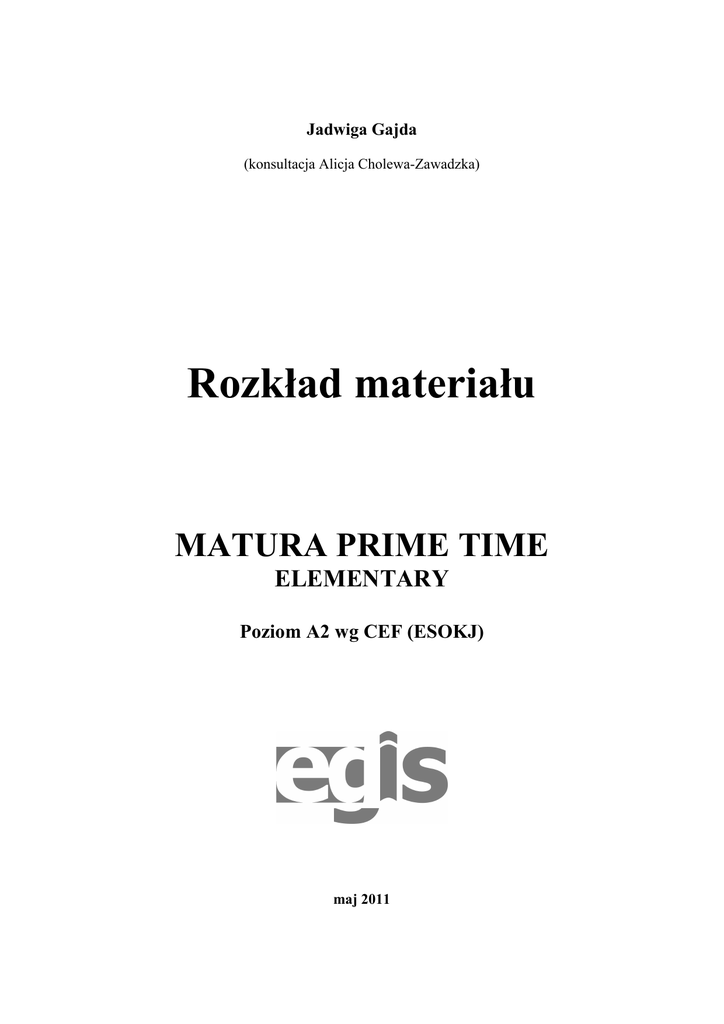 Jadwiga Gajda (konsultacja Alicja Cholewa-Zawadzka) Rozkład materiału MATURA PRIME TIME ELEMENTARY Poziom A2 wg CEF (ESOKJ) maj 2011 Wstęp Matura Prime Time to nowy, czteropoziomowy kurs przeznaczony dla uczniów szkół ponadgimnazjalnych przygotowujących się do egzaminu maturalnego na poziomie podstawowym i rozszerzonym. Jego pierwsza część, Matura Prime Time Elementary, odpowiada poziomowi A2 w skali przyjętej przez Radę Europy. Podręcznik jest dostosowany do wymogów nowej podstawy programowej, która będzie powszechnie obowiązywać w szkołach ponadgimnazjalnych od roku szkolnego 2012/2013. MoŜe być on takŜe z powodzeniem stosowany w klasach nauczanych zgodnie z obowiązującą obecnie tzw. starą podstawą programową, gdyŜ treść podręcznika, jego zasób tematyczny, leksykalny i gramatyczny oraz ćwiczone umiejętności językowe są zgodne ze standardami wymagań egzaminacyjnych (zob. Informator o egzaminie maturalnym od 2008 roku) na poziomie podstawowym i strukturą egzaminu maturalnego obowiązującego od 2012 roku. Podręcznik posiada bardzo bogatą, nowoczesną obudowę, umoŜliwiającą uatrakcyjnienie zajęć lekcyjnych, poszerzenie treści nauczania oraz zachęcenie i wdroŜenie ucznia do samodzielnej pracy nad językiem. Do dodatkowych komponentów naleŜą: nagrania na płytach CD (Class CDs), zeszyt ćwiczeń (Workbook), interaktywny eBook (i-eBook) zawierający – poza materiałem prezentowanym w ksiąŜce – m.in. krótkie dokumentalne filmy wideo, interaktywne gry leksykalne, testy sprawdzające znajomość słownictwa i gramatyki. Nauczyciel w swojej pracy moŜe takŜe wykorzystać: ksiąŜkę nauczyciela z dokładnymi scenariuszami zajęć (Teacher’s Book), testy do poszczególnych rozdziałów podręcznika (Test CD-ROM) i szczególnie polecane, ze względu na wykorzystanie najnowocześniejszych technologii informacyjno-komunikacyjnych, oprogramowanie do tablic interaktywnych (Interactive Whiteboard Software). Przedstawiony poniŜej szczegółowy rozkład materiału do podręcznika Matura Prime Time Elementary jest propozycją i punktem wyjścia do konstruowania indywidualnych rozkładów materiału dostosowanych do konkretnych warunków i moŜliwości edukacyjnych uczniów. Przy budowaniu własnych rozkładów naleŜy wziąć pod uwagę takie warunki pracy dydaktycznej jak: wymiar godzin, liczebność klas i grup uczniów, środki dydaktyczne w szkole i/ lub pracowni językowej oraz uzdolnienia i preferencje młodzieŜy w konkretnym zespole uczniów. Proponowany rozkład materiału jest dostosowany do wprowadzania wszelkich zmian i modyfikacji. Wszystkie pozycje oznaczone gwiazdką (*) i wykropkowane w tekście słuŜą do nanoszenia własnych informacji. Są to m.in.: termin/ data* (np. moŜna wpisać miesiąc lub dokładne daty, w zaleŜności od potrzeb lub wymagań dyrekcji szkoły); uwagi* w ostatniej kolumnie tabeli (np. o realizacji niektórych punktów rozkładu). W rozkładzie uwzględniono takŜe zajęcia dodatkowe*, które nie są oparte na materiale podręcznikowym (np. z okazji świąt: St.Valentine’s Day, Christmas lub dodatkowe zajęcia poświęcone niektórym trudniejszym zagadnieniom gramatycznym). Podręcznik Matura Prime Time Elementary jest podzielony na 6 głównych modułów, a kaŜdy moduł – na rozdziały od a do i oraz 2 rozdziały powtórzeniowe i 1 rozdział maturalny. Rozkład materiału, oprócz uszczegółowienia tematyki i słownictwa oraz gramatyki i umiejętności językowych, proponuje tematy i ilość zajęć lekcyjnych w poszczególnych rozdziałach. Jeden moduł to od 14 do 18 lekcji, a rozdział początkowy (tzw. Starter) to 1-2 lekcje, co w sumie daje minimum 85, a maksymalnie 110 godzin. Biorąc pod uwagę fakt, Ŝe rok szkolny ma średnio ok. 33 tygodni, materiał podręcznikowy moŜe być zrealizowany w ciągu roku szkolnego przy minimum 3 godzinach zajęć tygodniowo (ok. 100 godzin). Natomiast przy większej liczbie godzin języka angielskiego w tygodniu (np. 4; razem ok. 130 godzin w ciągu roku) dysponujemy dodatkowymi godzinami do wykorzystania poza materiałem z podręcznika (patrz: zajęcia dodatkowe*). W rozkładzie materiału został uwzględniony podział na umiejętności receptywne, czyli czytanie i słuchanie, oraz umiejętności produktywne, czyli mówienie i pisanie. Przy umiejętnościach produktywnych opisane zostały takŜe związane z nimi funkcje językowe, 2 np. wskazywanie drogi, udzielanie rad czy relacjonowanie wydarzeń przeszłych. Dodatkowo umieszczenie przy konkretnych ćwiczeniach poszczególnych pozycji standardów wymagań egzaminacyjnych (SWE…) i wymagań szczegółowych według nowej podstawy programowej [ws…] powoduje, Ŝe proponowany rozkład materiału jest szczególnie pomocny dla nauczyciela w jego pracy dydaktycznej. Podsumowując informacje wstępne, podajemy zastosowane w rozkładzie skróty i kolory czcionki: (SWE…) – standardy wymagań egzaminacyjnych, dotyczące obowiązującego egzaminu maturalnego (wraz ze zmianami w egzaminie ustnym od 2012) ICT – zadania z wykorzystaniem technologii informacyjnokomunikacyjnych SB – podręcznik ucznia WB – zeszyt ćwiczeń i-eBook – interaktywny eBook * …… – informacje do uzupełnienia przez nauczyciela niebieski kolor czcionki – dotyczy nowej podstawy programowej, m.in. [ws…], czyli wymagania szczegółowe 3 ROZKŁAD MATERIAŁU – MATURA PRIME TIME Elementary (NR DOPUSZCZENIA: …………………………) (PROGRAM NAUCZANIA: ……………………………………) [IV etap edukacyjny, poziom IV.1, zakres podstawowy] ROK SZK.: …………… MODUŁ ROZDZIAŁ ILOŚĆ LEKCJI TERMIN / DATA* Starter Unit 1-2 lekcje ………………… KLASA/GRUPA: ………… TEMATYKA & SŁOWNICTWO Alfabet, literowanie Liczebniki główne (1-100) Liczebniki porządkowe Przedmioty szkolne np. History, Science Przybory szkolne np. ruler, notebook Kolory NAUCZYCIEL:………………………………
