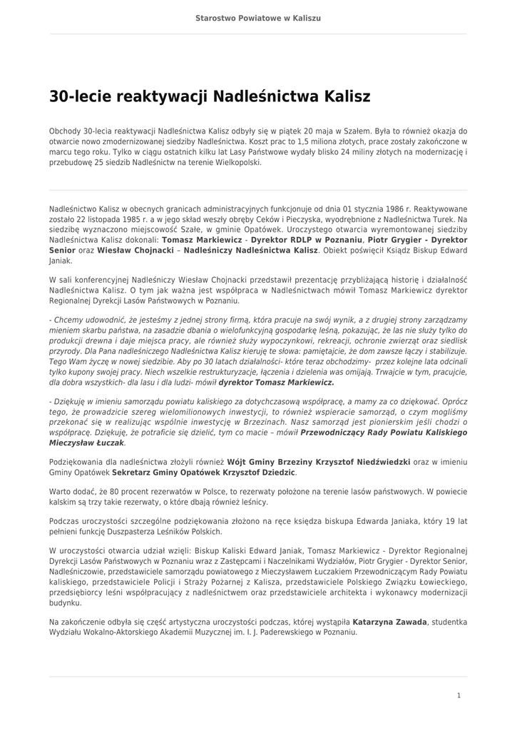 Starostwo Powiatowe w Kaliszu 30-lecie reaktywacji Nadleśnictwa Kalisz Obchody 30-lecia reaktywacji Nadleśnictwa Kalisz odbyły się w piątek 20 maja w Szałem. Była to również okazja do otwarcie nowo zmodernizowanej siedziby Nadleśnictwa. Koszt prac to 1,5 miliona złotych, prace zostały zakończone w marcu tego roku. Tylko w ciągu ostatnich kilku lat Lasy Państwowe wydały blisko 24 miliny złotych na modernizację i przebudowę 25 siedzib Nadleśnictw na terenie Wielkopolski. Nadleśnictwo Kalisz w obecnych granicach administracyjnych funkcjonuje od dnia 01 stycznia 1986 r. Reaktywowane zostało 22 listopada 1985 r. a w jego skład weszły obręby Ceków i Pieczyska, wyodrębnione z Nadleśnictwa Turek. Na siedzibę wyznaczono miejscowość Szałe, w gminie Opatówek. Uroczystego otwarcia wyremontowanej siedziby Nadleśnictwa Kalisz dokonali: Tomasz Markiewicz - Dyrektor RDLP w Poznaniu, Piotr Grygier - Dyrektor Senior oraz Wiesław Chojnacki – Nadleśniczy Nadleśnictwa Kalisz. Obiekt poświęcił Ksiądz Biskup Edward Janiak. W sali konferencyjnej Nadleśniczy Wiesław Chojnacki przedstawił prezentację przybliżającą historię i działalność Nadleśnictwa Kalisz. O tym jak ważna jest współpraca w Nadleśnictwach mówił Tomasz Markiewicz dyrektor Regionalnej Dyrekcji Lasów Państwowych w Poznaniu. - Chcemy udowodnić, że jesteśmy z jednej strony firmą, która pracuje na swój wynik, a z drugiej strony zarządzamy mieniem skarbu państwa, na zasadzie dbania o wielofunkcyjną gospodarkę leśną, pokazując, że las nie służy tylko do produkcji drewna i daje miejsca pracy, ale również służy wypoczynkowi, rekreacji, ochronie zwierząt oraz siedlisk przyrody. Dla Pana nadleśniczego Nadleśnictwa Kalisz kieruję te słowa: pamiętajcie, że dom zawsze łączy i stabilizuje. Tego Wam życzę w nowej siedzibie. Aby po 30 latach działalności- które teraz obchodzimy- przez kolejne lata odcinali tylko kupony swojej pracy. Niech wszelkie restrukturyzacje, łączenia i dzielenia was omijają. Trwajcie w tym, pracujcie, dla dobra wszystkich- dla lasu i dla ludzi- mówił dyrektor Tomasz Markiewicz. - Dziękuję w imieniu samorządu powiatu kaliskiego za dotychczasową współpracę, a mamy za co dziękować. Oprócz tego, że prowadzicie szereg wielomilionowych inwestycji, to również wspieracie samorząd, o czym mogliśmy przekonać się w realizując wspólnie inwestycję w Brzezinach. Nasz samorząd jest pionierskim jeśli chodzi o współpracę. Dziękuję, że potraficie się dzielić, tym co macie – mówił Przewodniczący Rady Powiatu Kaliskiego Mieczysław Łuczak. Podziękowania dla nadleśnictwa złożyli również Wójt Gminy Brzeziny Krzysztof Niedźwiedzki oraz w imieniu Gminy Opatówek Sekretarz Gminy Opatówek Krzysztof Dziedzic. Warto dodać, że 80 procent rezerwatów w Polsce, to rezerwaty położone na terenie lasów państwowych. W powiecie kalskim są trzy takie rezerwaty, o które dbają również leśnicy. Podczas uroczystości szczególne podziękowania złożono na ręce księdza biskupa Edwarda Janiaka, który 19 lat pełnieni funkcję Duszpasterza Leśników Polskich. W uroczystości otwarcia udział wzięli: Biskup Kaliski Edward Janiak, Tomasz Markiewicz - Dyrektor Regionalnej Dyrekcji Lasów Państwowych w Poznaniu wraz z Zastępcami i Naczelnikami Wydziałów, Piotr Grygier - Dyrektor Senior, Nadleśniczowie, przedstawiciele samorządu powiatowego z Mieczysławem Łuczakiem Przewodniczącym Rady Powiatu kaliskiego, przedstawiciele Policji i Straży Pożarnej z Kalisza, przedstawiciele Polskiego Związku Łowieckiego, przedsiębiorcy leśni współpracujący z nadleśnictwem oraz przedstawiciele architekta i wykonawcy modernizacji budynku. Na zakończenie odbyła się część artystyczna uroczystości podczas, której wystąpiła Katarzyna Zawada, studentka Wydziału Wokalno-Aktorskiego Akademii Muzycznej im. I. J. Paderewskiego w Poznaniu. 1 Starostwo Powiatowe w Kaliszu Tekst/Foto: W.Przybylska 2