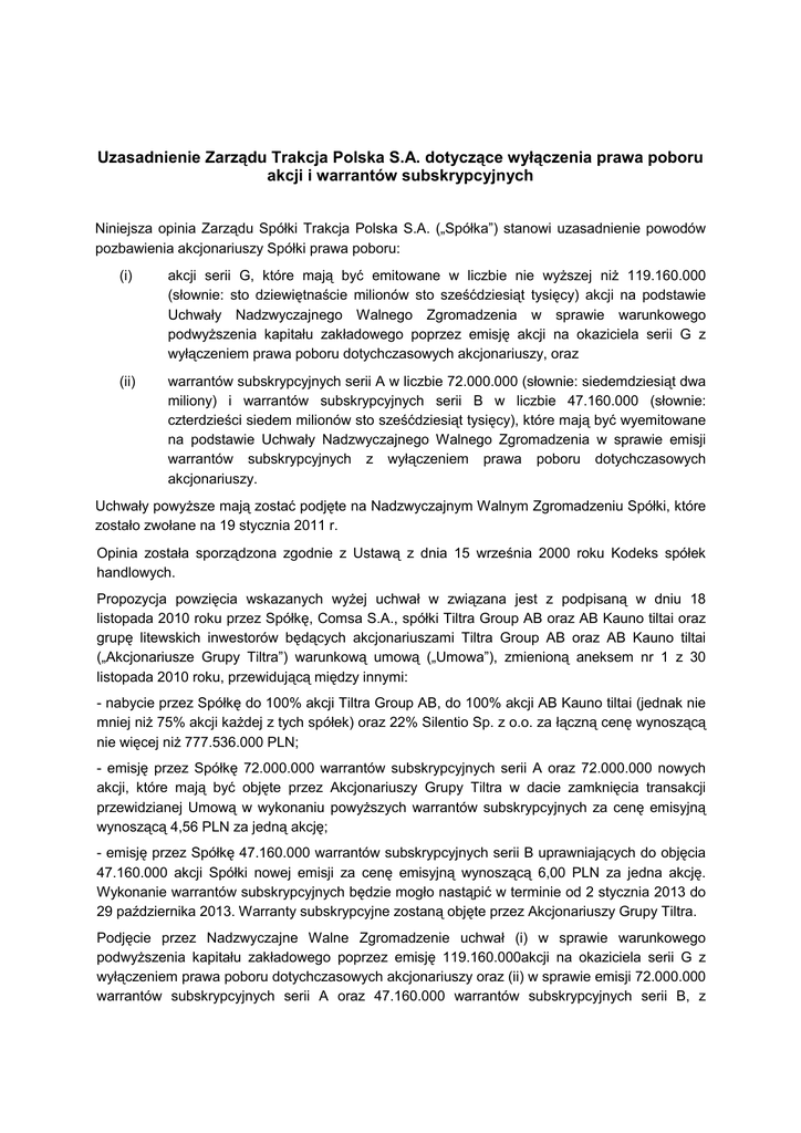 Uzasadnienie Zarządu Trakcja Polska S.A. dotyczące wyłączenia prawa poboru akcji i warrantów subskrypcyjnych Niniejsza opinia Zarządu Spółki Trakcja Polska S.A. („Spółka”) stanowi uzasadnienie powodów pozbawienia akcjonariuszy Spółki prawa poboru: (i) akcji serii G, które mają być emitowane w liczbie nie wyższej niż 119.160.000 (słownie: sto dziewiętnaście milionów sto sześćdziesiąt tysięcy) akcji na podstawie Uchwały Nadzwyczajnego Walnego Zgromadzenia w sprawie warunkowego podwyższenia kapitału zakładowego poprzez emisję akcji na okaziciela serii G z wyłączeniem prawa poboru dotychczasowych akcjonariuszy, oraz (ii) warrantów subskrypcyjnych serii A w liczbie 72.000.000 (słownie: siedemdziesiąt dwa miliony) i warrantów subskrypcyjnych serii B w liczbie 47.160.000 (słownie: czterdzieści siedem milionów sto sześćdziesiąt tysięcy), które mają być wyemitowane na podstawie Uchwały Nadzwyczajnego Walnego Zgromadzenia w sprawie emisji warrantów subskrypcyjnych z wyłączeniem prawa poboru dotychczasowych akcjonariuszy. Uchwały powyższe mają zostać podjęte na Nadzwyczajnym Walnym Zgromadzeniu Spółki, które zostało zwołane na 19 stycznia 2011 r. Opinia została sporządzona zgodnie z Ustawą z dnia 15 września 2000 roku Kodeks spółek handlowych. Propozycja powzięcia wskazanych wyżej uchwał w związana jest z podpisaną w dniu 18 listopada 2010 roku przez Spółkę, Comsa S.A., spółki Tiltra Group AB oraz AB Kauno tiltai oraz grupę litewskich inwestorów będących akcjonariuszami Tiltra Group AB oraz AB Kauno tiltai („Akcjonariusze Grupy Tiltra”) warunkową umową („Umowa”), zmienioną aneksem nr 1 z 30 listopada 2010 roku, przewidującą między innymi: - nabycie przez Spółkę do 100% akcji Tiltra Group AB, do 100% akcji AB Kauno tiltai (jednak nie mniej niż 75% akcji każdej z tych spółek) oraz 22% Silentio Sp. z o.o. za łączną cenę wynoszącą nie więcej niż 777.536.000 PLN; - emisję przez Spółkę 72.000.000 warrantów subskrypcyjnych serii A oraz 72.000.000 nowych akcji, które mają być objęte przez Akcjonariuszy Grupy Tiltra w dacie zamknięcia transakcji przewidzianej Umową w wykonaniu powyższych warrantów subskrypcyjnych za cenę emisyjną wynoszącą 4,56 PLN za jedną akcję; - emisję przez Spółkę 47.160.000 warrantów subskrypcyjnych serii B uprawniających do objęcia 47.160.000 akcji Spółki nowej emisji za cenę emisyjną wynoszącą 6,00 PLN za jedna akcję. Wykonanie warrantów subskrypcyjnych będzie mogło nastąpić w terminie od 2 stycznia 2013 do 29 października 2013. Warranty subskrypcyjne zostaną objęte przez Akcjonariuszy Grupy Tiltra. Podjęcie przez Nadzwyczajne Walne Zgromadzenie uchwał (i) w sprawie warunkowego podwyższenia kapitału zakładowego poprzez emisję 119.160.000akcji na okaziciela serii G z wyłączeniem prawa poboru dotychczasowych akcjonariuszy oraz (ii) w sprawie emisji 72.000.000 warrantów subskrypcyjnych serii A oraz 47.160.000 warrantów subskrypcyjnych serii B, z wyłączeniem prawa poboru dotychczasowych akcjonariuszy, jest jednym z warunków zawieszających, od których spełnienia uzależniona jest realizacja Umowy. Wobec planów Zarządu Spółki dokonania inwestycji w postaci nabycia akcji litewskich spółek Tiltra Group AB oraz AB Kauno tiltai, zwiększenia potencjału gospodarczego Spółki oraz rozszerzenia obszaru działalności Spółki na Litwę oraz pozostałe kraje, w których działają Tiltra Group AB oraz AB Kauno tiltai, Zarząd jest zdania, że pozbawienie dotychczasowych akcjonariuszy prawa poboru akcji serii G oraz prawa poboru warrantów subskrypcyjnych serii A jest pożądane i leży w interesie Spółki. Podwyższenie kapitału zakładowego Spółki w drodze niepublicznej emisji akcji serii G, skierowanej do dotychczasowych akcjonariuszy spółek Tiltra Group AB oraz AB Kauno tiltai pozwoli na częściowe sfinansowanie nabycia akcji w przedmiotowych spółkach, bez konieczności zaciągania zewnętrznego zadłużenia na rynku finansowym, a jednocześnie na pozyskanie dla Spółki nowych inwestorów w osobach Akcjonariuszy Grupy Tiltra. W ocenie Zarządu Spółki transakcja przewidziana w Umowie umożliwi Spółce osiągnięcie wiodącej pozycji na rynku budownictwa infrastruktury w Europie Środkowej i Wschodniej. W wyniku planowanej transakcji Spółka zwiększy swoją konkurencyjność, a także będzie mogła w bardziej efektywny sposób powiększać wartość dla akcjonariuszy. W związku z powyższym w opinii Zarządu Spółki pozbawienie akcjonariuszy prawa poboru akcji serii G oraz warrantów subskrypcyjnych serii A i warrantów subskrypcyjnych serii B na warunkach określonych w przedkładanych Nadzwyczajnemu Walnemu Zgromadzeniu projektach Uchwał leży w interesie Spółki.