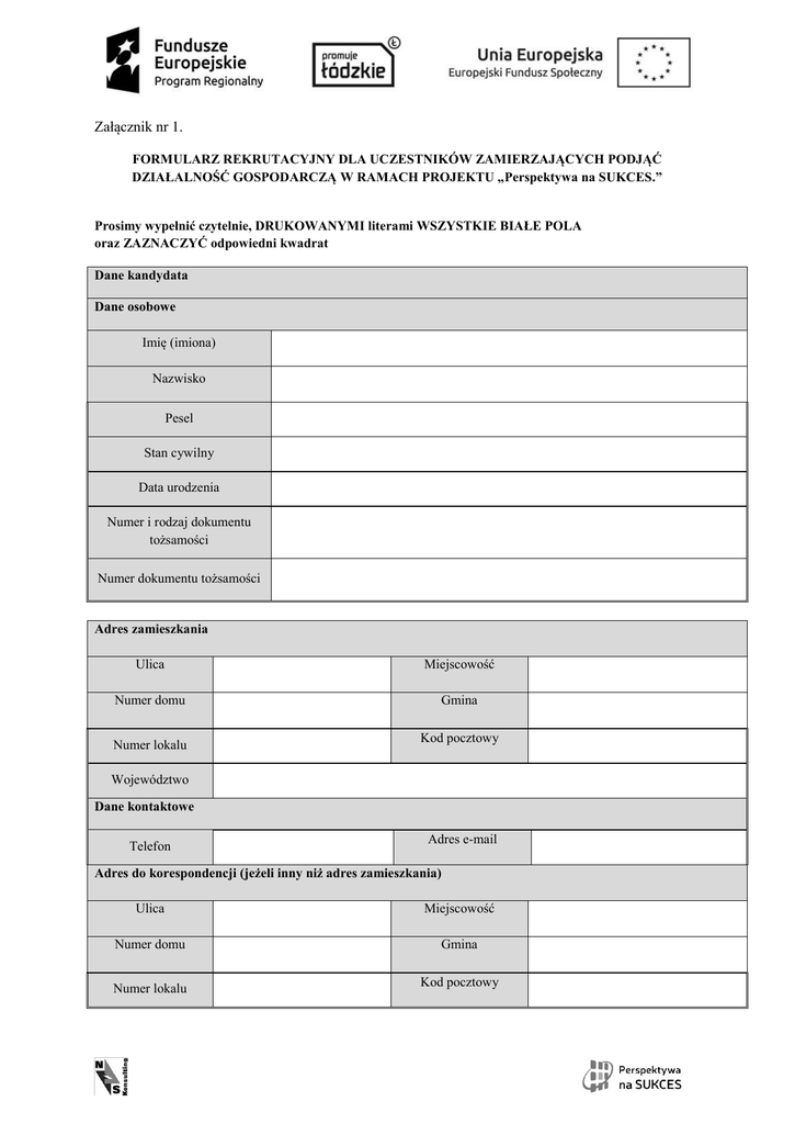 Załącznik nr 1. FORMULARZ REKRUTACYJNY DLA UCZESTNIKÓW ZAMIERZAJĄCYCH PODJĄĆ DZIAŁALNOŚĆ GOSPODARCZĄ W RAMACH PROJEKTU „Perspektywa na SUKCES.” Prosimy wypełnić czytelnie, DRUKOWANYMI literami WSZYSTKIE BIAŁE POLA oraz ZAZNACZYĆ odpowiedni kwadrat Dane kandydata Dane osobowe Imię (imiona) Nazwisko Pesel Stan cywilny Data urodzenia Numer i rodzaj dokumentu tożsamości Numer dokumentu tożsamości Adres zamieszkania Ulica Miejscowość Numer domu Gmina Numer lokalu Kod pocztowy Województwo Dane kontaktowe Telefon Adres e-mail Adres do korespondencji (jeżeli inny niż adres zamieszkania) Ulica Miejscowość Numer domu Gmina Numer lokalu Kod pocztowy Województwo Status uczestnika Jestem osobą przewidzianą do zwolnienia - osoba, która znajduje się w okresie wypowiedzenia stosunku pracy lub stosunku służbowego z przyczyn dotyczących zakładu pracy lub która została poinformowana przez pracodawcę o zamiarze nieprzedłużenia przez niego stosunku pracy lub stosunku służbowego Jestem osobą zagrożoną zwolnieniem z pracy - osoba zatrudniona u pracodawcy, który w okresie 12 miesięcy poprzedzających przystąpienie tego pracownika do projektu dokonał rozwiązania stosunku pracy lub stosunku służbowego z przyczyn niedotyczących pracowników, zgodnie z przepisami ustawy z dnia 13 marca 2003 r. o szczególnych zasadach rozwiązywania z pracownikami stosunków pracy z przyczyn niedotyczących pracowników (Dz. U. z 2015 r. poz. 192) lub zgodnie z przepisami ustawy z dnia 26 czerwca 1974 r. Kodeks pracy (Dz. U. z 2014 r. poz. 1502, z późn.), w przypadku rozwiązania stosunku pracy lub stosunku służbowego z tych przyczyn u pracodawcy zatrudniającego mniej niż 20 pracowników albo dokonał likwidacji stanowisk pracy z przyczyn ekonomicznych, organizacyjnych, produkcyjnych lub technologicznych. Jestem osobą zwolnioną z przyczyn dotyczących zakładu pracy w okresie nie dłuższym niż 6 miesięcy przed dniem przystąpienia do projektu TAK NIE TAK NIE TAK NIE Jestem zarejestrowany/a w powiatowym urzędzie pracy jako bezrobotny/a TAK NIE Nie jestem zarejestrowany/a w powiatowym urzędzie pracy jako bezrobotny/a ale pozostaję bez zatrudnienia TAK NIE Jestem osobą z niepełnosprawnością - osoba niepełnosprawna w świetle przepisów ustawy z dnia 27 sierpnia 1997 r. o rehabilitacji zawodowej i społecznej oraz zatrudnieniu osób niepełnosprawnych (Dz.U. 1997 nr 123 poz. 776), a także osoba z zaburzeniami psychicznymi, o których mowa w ustawie z dnia 19 sierpnia 1994 r. o ochronie zdrowia psychicznego (Dz. U. 1994 nr 111, poz. 535), tj. osoba z odpowiednim orzeczeniem lub innym dokumentem poświadczającym stan zdrowia. Posiadam wykształcenie: podstawowe lub niższe gimnazjalne ponadgimnazjalne ogólnokształcące ponadgimnazjalne zawodowe zasadnicze zawodowe inne (wpisać)……………..…………… TAK NIE OPIS PLANOWANEJ DZIAŁALNOŚCI GOSPODARCZEJ POSIADANE KWALIFIKACJE, DOŚWIADCZENIE I UMIEJĘTNOŚCI NIEZBĘDNE DO PROWADZENIA DZIAŁALNOŚCI OSPODARCZEJ PLANOWANY KOSZT INWESTYCJI Ja niżej podpisany/a oświadczam, że: - w okresie 12 miesięcy poprzedzających dzień przystąpienia do projektu nie posiadałem/am aktywnego wpisu do Centralnej Ewidencji i Informacji o Działalności Gospodarczej, ani nie byłem/am zarejestrowany/a jako przedsiębiorca w Krajowym Rejestrze Sądowym ani nie prowadziłem/am działalności gospodarczej na podstawie odrębnych przepisów, - nie jestem wspólnikiem spółki osobowej ani nie posiadam więcej niż 10% udziału w kapitale spółki kapitałowej, - nie zasiadam w organach zarządzających lub kontrolnych podmiotów prowadzących działalność gospodarczą, - nie pełnię funkcji prokurenta, - nie korzystam równolegle z innych środków publicznych na rozpoczęcie działalności gospodarczej, - nie otrzymałem/am w okresie 3 lat poprzedzających dzień przystąpienia do projektu wsparcia finansowego ze środków publicznych na uruchomienie lub prowadzenie działalności gospodarczej, - nie został wobec mnie orzeczony zakaz dostępu do środków publicznych, o którym mowa w art. 12 ust. 1 pkt 1 ustawy z 15 czerwca 2012 r. o skutkach powierzania wykonywania pracy cudzoziemcom przebywającym wbrew przepisom na terytorium Rzeczypospolitej Polskiej (Dz U. z 2012 r., poz. 769), - nie posiadam zaległości w zapłacie podatków, składek ubezpieczenia społecznego lub zdrowotnego ani nie jest wobec mnie prowadzona egzekucja, - posiadam pełną zdolności do czynności prawnych, - nie byłem karany za przestępstwa przeciwko obrotowi gospodarczemu, - zapoznałem/am się z treścią Regulaminu rekrutacji oraz Regulaminu przyznawania środków finansowych na rozwój przedsiębiorczości ; - dane zawarte w formularzu są zgodne z prawdą. Ponadto zobowiązuję się w terminie do 4 tygodni od zakończenia udziału w projekcie do przedłożenia Beneficjentowi oświadczenia o moim statusie na rynku pracy. Miejscowość ………………………………, dnia ………………………………….……………………………… (Czytelny podpis kandydata/ki)