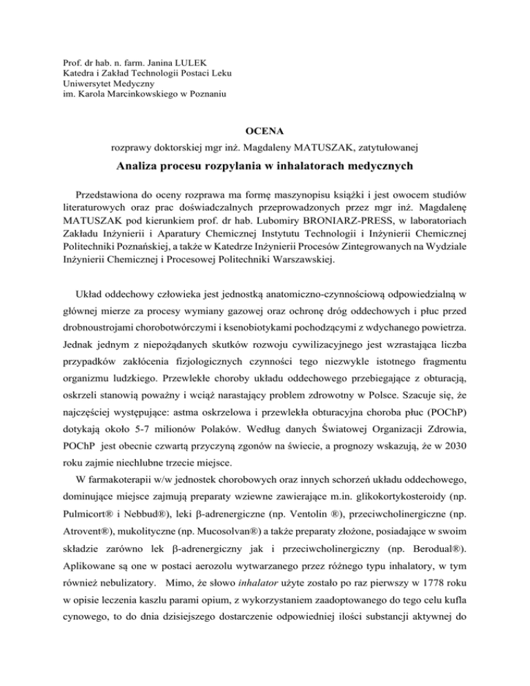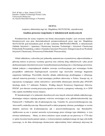 Prof. dr hab. n. farm. Janina LULEK Katedra i Zakład Technologii Postaci Leku Uniwersytet Medyczny im. Karola Marcinkowskiego w Poznaniu OCENA rozprawy doktorskiej mgr inż. Magdaleny MATUSZAK, zatytułowanej Analiza procesu rozpylania w inhalatorach medycznych Przedstawiona do oceny rozprawa ma formę maszynopisu książki i jest owocem studiów literaturowych oraz prac doświadczalnych przeprowadzonych przez mgr inż. Magdalenę MATUSZAK pod kierunkiem prof. dr hab. Lubomiry BRONIARZ-PRESS, w laboratoriach Zakładu Inżynierii i Aparatury Chemicznej Instytutu Technologii i Inżynierii Chemicznej Politechniki Poznańskiej, a także w Katedrze Inżynierii Procesów Zintegrowanych na Wydziale Inżynierii Chemicznej i Procesowej Politechniki Warszawskiej. Układ oddechowy człowieka jest jednostką anatomiczno-czynnościową odpowiedzialną w głównej mierze za procesy wymiany gazowej oraz ochronę dróg oddechowych i płuc przed drobnoustrojami chorobotwórczymi i ksenobiotykami pochodzącymi z wdychanego powietrza. Jednak jednym z niepożądanych skutków rozwoju cywilizacyjnego jest wzrastająca liczba przypadków zakłócenia fizjologicznych czynności tego niezwykle istotnego fragmentu organizmu ludzkiego. Przewlekłe choroby układu oddechowego przebiegające z obturacją, oskrzeli stanowią poważny i wciąż narastający problem zdrowotny w Polsce. Szacuje się, że najczęściej występujące: astma oskrzelowa i przewlekła obturacyjna choroba płuc (POChP) dotykają około 5-7 milionów Polaków. Według danych Światowej Organizacji Zdrowia, POChP jest obecnie czwartą przyczyną zgonów na świecie, a prognozy wskazują, że w 2030 roku zajmie niechlubne trzecie miejsce. W farmakoterapii w/w jednostek chorobowych oraz innych schorzeń układu oddechowego, dominujące miejsce zajmują preparaty wziewne zawierające m.in. glikokortykosteroidy (np. Pulmicort® i Nebbud®), leki b-adrenergiczne (np. Ventolin ®), przeciwcholinergiczne (np. Atrovent®), mukolityczne (np. Mucosolvan®) a także preparaty złożone, posiadające w swoim składzie zarówno lek b-adrenergiczny jak i przeciwcholinergiczny (np. Berodual®). Aplikowane są one w postaci aerozolu wytwarzanego przez różnego typu inhalatory, w tym również nebulizatory. Mimo, że słowo inhalator użyte zostało po raz pierwszy w 1778 roku w opisie leczenia kaszlu parami opium, z wykorzystaniem zaadoptowanego do tego celu kufla cynowego, to do dnia dzisiejszego dostarczenie odpowiedniej ilości substancji aktywnej do docelowych receptorów dróg oddechowych stanowi poważne wyzwanie nie tylko dla technologów farmaceutycznych i producentów urządzeń umożliwiających bezpośrednie podanie leku do płuc, ale także pacjentów aplikujących samodzielnie preparaty inhalacyjne. Skuteczność terapii aerozolowej zależy od wielu czynników, z których w pierwszej kolejności wymienić należy: właściwości fizykochemiczne cieczy i zawieszonej lub rozpuszczonej w niej substancji aktywnej, konstrukcję inhalatora oraz jego optymalne wykorzystanie a także dynamikę inhalacji w wielu wypadkach zależną od samego pacjenta. W przedstawionym wyżej kontekście, w pełni uzasadnione było podjęcie przez Doktorantkę badań mających na celu „analizę teoretyczno-doświadczalną procesu rozpylania cieczy w wybranych inhalatorach medycznych. Miała ona doprowadzić do uzyskania nowych informacji o charakterze poznawczo-aplikacyjnym na temat złożonego procesu atomizacji roztworów i zawiesin. Biorąc pod uwagę fakt, że treść przedstawionej do recenzji pracy balansuje na krawędzi dwóch wydawałoby się bliskich a jednak nieco odmiennych dziedzin, tzn. inżynierii chemicznej i technologii farmaceutycznej oraz zdając sobie sprawę z mnogości zawartych w niej informacji i wyników, w ocenie rozprawy skupiłam się głównie na jej aspektach farmaceutycznych. W skład dysertacji, liczącej 231 stron, oprócz Wykazu stosowanych oznaczeń, Wprowadzenia, a także Celu pracy, wchodzą 2 główne rozdziały tj. Część teoretyczna i Część eksperymentalna, oba z licznymi podrozdziałami. Obejmują one: obszerny przegląd i analizę danych piśmiennictwa, szczegółowy opis prowadzonych doświadczeń i stosowanych technik eksperymentalnych, analizę uzyskanych wyników badań oraz krótki podsumowanie zawierające 8 wniosków i 2 równania korelacyjne autorstwa Doktorantki. W rozdziale Bibliografia zawarty jest wykaz 316 publikacji, z których > 50% ukazało się w ciągu ostatnich 10 lat. Szkoda, że brak jest w nim co najmniej 2 cytowanych w części teoretycznej pozycji. W rozdziale bibliograficznym Autorka zamieściła również spis 21 źródeł internetowych, jednak nie podała przy nich dat wejścia, co jest zazwyczaj praktykowane, szczególnie w publikacjach o charakterze naukowym. Na wyróżnienie zasługuje natomiast bardzo staranne udokumentowanie zarówno części teoretycznej jak i eksperymentalnej rozprawy, na które składają się 174 ryciny, wykresy i schematy oraz 33 tabele, z których zdecydowana większość zawiera uzyskane przez Doktorantkę wyniki. 2 Niestety nie udało mi się znaleźć ani w formie papierowej, ani w formie elektronicznej rozprawy streszczenia w języku angielskim, wymaganego wg obowiązującej Ustawy o stopniach naukowych i tytule naukowym oraz o stopniach i tytule w zakresie sztuki. Wyrażam nadzieję, że zostanie ono dołączone do pracy przed przystąpieniem do jej obrony. Ocena merytoryczna Zasadność tytułu rozprawy oraz przedstawionego celu i obszaru badań, w przekonywujący sposób zostało potwierdzone w części teoretycznej pracy. Stanowi ona interesujące kompendium, w większości aktualnej wiedzy, na temat rozpylania i podstawowych parametrów związanych z tym procesem, a także czynników wpływających na skuteczność inhalacji jako metody z wyboru w leczeniu chorób układu oddechowego. Na szczególną uwagę zasługuje rozdział dotyczący inhalatorów medycznyc