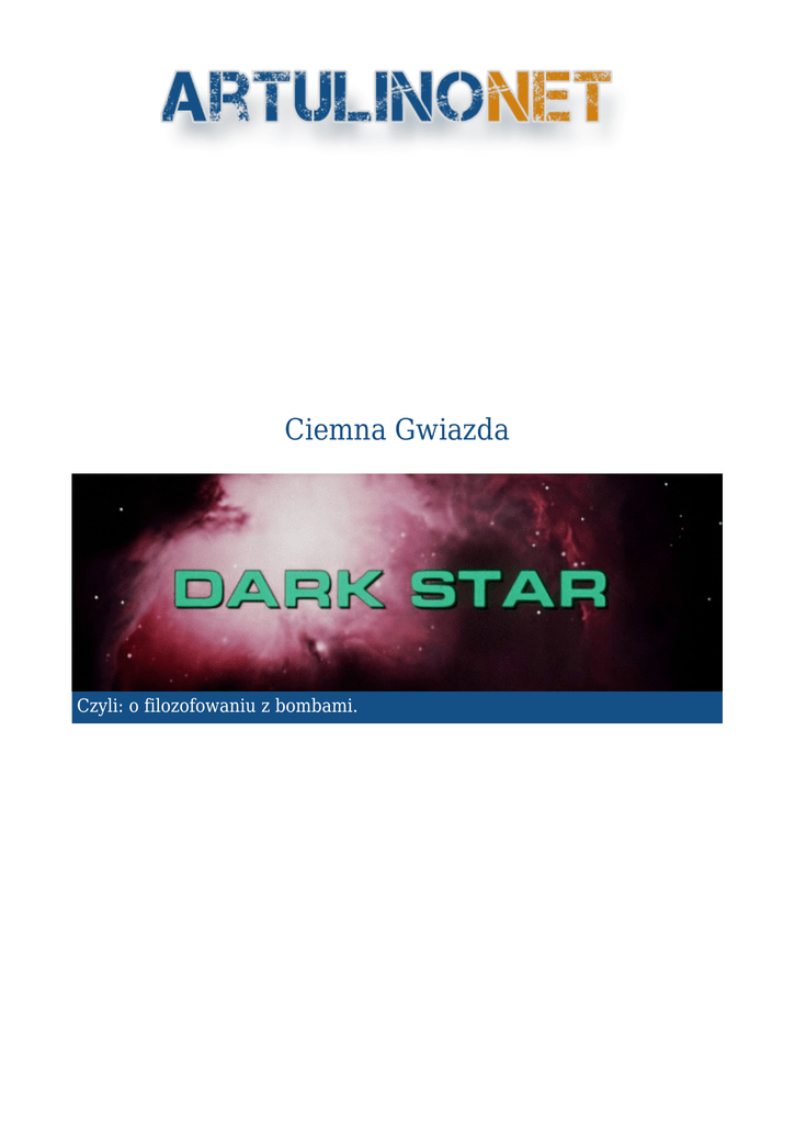 Ciemna Gwiazda Czyli: o filozofowaniu z bombami. Ciemna Gwiazda 2016-07-15 Czyli: o filozofowaniu z bombami. Człowiek sięgnął gwiazd. Kolonizuje nowe planety, odkrywa nieznane przestrzenie pozaziemskie, bada nowe formy życia. Jednak życie w kosmosie jest pełne niebezpieczeństw, być może niespodziewana dehermetyzacja statku, rój meteorów, może jakiś obcy. Jednak największym chyba niebezpieczeństwem są planety. Nie, nie życie i warunki na nich zastane, po prostu planety. Należy dodać, że te niestabilne. Co to są niestabilne planety? Już śpieszę z wyjaśnieniem. Są to planety które wesoło latają sobie po kosmosie i jeszcze weselej zderzają się z statkami kosmicznymi i innymi planetami. Naukowcy przecież nie raz o tym wspominali, prawda? :-) Na całe szczęście problem jest znany i są sposoby aby uchronić ludzkość i kosmos od szaleństwa dziko pędzących planet. Grupa kosmonautów na okręcie zwiadowczym „Dark Star” patroluje kosmos. Skromna załoga w skład której wchodzą Bojler (Cal Kuniholm), Doolittle (Brian Narelle), Talby (Dre Pahich), oraz Pinback (Dan O'Bannon), wiedzie dość monotonne życie. Są w swojej misji od 20 lat (według czasu pokładowego od 3). Wystarczająco długo aby okręt zaczął się psuć. Awarie są dokuczliwe, nie mają już swoich kajut, śpią w jakimś magazynie. Załogę gnębią też braki w zaopatrzeniu – w wyniku wypadku utracili jeden z najbardziej potrzebnych produktów – papier toaletowy. :-) W każdym bądź razie latają od jednego potencjalnego zagrożenia do drugiego. Po identyfikacji planety i potwierdzeniu jej niestabilności, zostaje ona zbombardowana, zniszczona. Kosmos może odetchnąć z ulgą, kolejne zagrożenie zostało wyeliminowane… Bombardowanie nie jest czymś ciężkim do przeprowadzenia. Twórcy okrętu nie oszczędzali i bomby znajdujące się w luku bombowym są najnowszej generacji. Są tak nowoczesne, że komunikują się z załogą i komputerem przy pomocy… głosu. Tak, najnormalniej z sobą rozmawiają, a wręcz dyskutują! Uczestniczymy z niedowierzaniem w rozmowach typu: Komputer: „Bomba 12, nie masz pozwolenia na start” Bomba: „Dostałem polecenie startu” K: „Nic podobnego, polecenie było błędne, wracaj do luku” B: „A to ja przepraszam. Wracam do luku” Trzeba przyznać, że jest to z lekka absurdalne, szczególnie kiedy jedna z nich zaczyna filozofować. Aby to wymyślić trzeba było być geniuszem, ew był „pod wpływem” i to czegoś www.artulino.net bardzo mocnego. :-) Okręt kosmiczny, bez obcego na pokładzie jest ewenementem. Więc i tu też mamy obcego. Tak, załoga wie o nim. Sami go zabrali, bo według Pinbacka powinni mieć maskotkę. On sam będzie ganiał go po okręcie, a nawet z nim walczył. Patrząc na tego obcego poczułem smutek – wiem, że NIGDY i NIGDZIE więcej nie zobaczę równie oryginalnego, równe bezsensownego, groteskowego i dziwacznego projektu obcego. Nigdy i nigdzie… :-( Chylę czoła przed projektantem. Jest on banalny, ale obcy (choć znajomo wygląda) jak tylko się da. Powinien on głęboko zapaść w pamięć każdemu kto obejrzy ten obraz filmowy. Sceny z hasającym obcym, bo napisać grasującym było by przerostem, po pokładzie przypominają późniejszego Obcego. Sądzę, że gdyby ksenomorf zobaczył swojego protoplastę, usiadł by w kącie i zapłakał. :-) Sam film „Ciemna Gwiazda” jest niskobudżetowy, ale nadrabia pomysłami. Absurdalnymi, dziwacznymi. Efekty są z punktu widzenia widza w 2016 są tanie i wiekowe – film jest z 1974, nie przeszkadzają one jednak. W roku 1974 zdobył on nawet nagrodę za najlepsze efekty specjalne. Projekt okrętu nie jest udziwniony, choć miałem wrażenie, że jest większy wewnątrz, niż na zewnątrz. Załoga jest wybitnie męska, mają więc na ścianach plakaty z roznegliżowanymi paniami i tu jest ciekawa sprawa, nie wiem czy to w wersji którą miałem okazję oglądać, ale w przybliżeniach plakaty są… ocenzurowane, rozmyte są do granic możliwości. W ujęciach z daleka są jednak już normalne. Załoga jest też bardzo specyficzna, raczej mało entuzjastycznie podchodzi do postawionego przed nimi zadania. Owszem niszczą planety, ale chyba robią to aby oderwać się o nudnej pokładowej rutyny, a nudzi im się i to bardzo. Scenariusz jest pełen nonsensu, są dziwne zachowania załogi – na przykład przy pracy w zagrożeniu, cała trójka (czwarty z załogi jest obserwatorem) wykrzykuje polecania/rozkazy/mówi co robi. Do kogo? Do kolegów? Oni sami zajęci są krzyczeniem. :-) Śmiesznie to wygląda, bardziej przypomina panikę, niż pracę. Wbrew pozorom film oglądało mi się dobrze, nie był zbyt trzymający w napięciu, ale miał swoje momenty – sceny z obcym, czy filozofujące bomby. Poważne sytuacje przerywane są scenami humorystycznymi – jednak na szczęście nie jest to całkowita komedia. Czy kiedyś wrócę do „Ciemnej Gwiazdy”? Kto wie… Sądzę, że zasługuje na to, jest on pomysłowy i ma on bardzo specyficzny klimat. Nie należy jednak podchodzić do niego z pełną powagą, a potraktować go z lekkim przymrużeniem oka. Tytuł polski: Ciemna Gwiazda Tytuł oryginalny: Dark Star Reżyseria: John Carpenter Cal Kuniholm jako Bojler Brian Narelle jako Doolittle Dre Pahich jako Talby Dan O'Bannon jako Pinback www.artulino.net Artur Wyszyński www.artulino.net