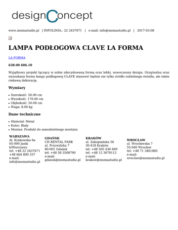 www.momastudio.pl | INFOLINIA.: 22 2437671 | e-mail: [email protected] | 2017-03-08 LAMPA PODŁOGOWA CLAVE LA FORMA LA FORMA 638.00 606.10 Wyjątkowy projekt łączący w sobie zdecydowaną formę oraz lekki, nowoczesny design. Oryginalna oraz wyszukana forma lampy podłogowej CLAVE stanowić będzie nie tylko źródło subtelnego światła, ale także ciekawą dekorację. Wymiary ● ● ● ● Szerokość: 50.00 cm Wysokość: 170.00 cm Głębokość: 50.00 cm Waga: 8.00 kg Dane techniczne ● ● ● Materiał: Metal Kolor: Biały Montaż: Produkt do samodzielnego montażu WARSZAWA Al. Krakowska 6a 05-090 Janki k/Warszawy tel: +48 22 2437671 +48 664 890 337 e-mail: [email protected] GDAŃSK CH RENTAL PARK ul. Przywidzka 7 80-001 Gdańsk tel: +48 58 3508790 e-mail: [email protected] KRAKÓW ul. Zakopiańska 56 30-418 Kraków tel: +48 505 436 669 tel: +48 12 3070112 e-mail: [email protected] WROCŁAW ul. Wrocławska 7 55-040 Wrocław tel: +48 71 3461885 e-mail: [email protected]