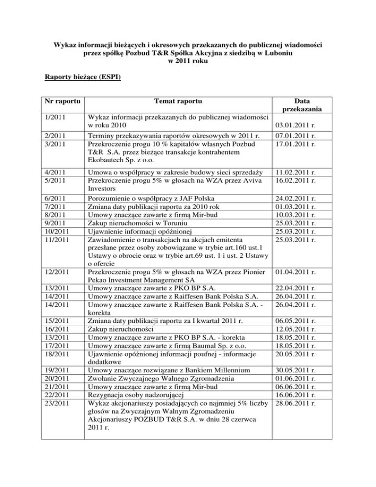 Wykaz informacji bieżących i okresowych przekazanych do publicznej wiadomości przez spółkę Pozbud T&R Spółka Akcyjna z siedzibą w Luboniu w 2011 roku Raporty bieżące (ESPI) Nr raportu Temat raportu Data przekazania 1/2011 Wykaz informacji przekazanych do publicznej wiadomości w roku 2010 03.01.2011 r. 2/2011 3/2011 Terminy przekazywania raportów okresowych w 2011 r. Przekroczenie progu 10 % kapitałów własnych Pozbud T&R S.A. przez bieżące transakcje kontrahentem Ekobautech Sp. z o.o. 07.01.2011 r. 17.01.2011 r. 4/2011 5/2011 Umowa o współpracy w zakresie budowy sieci sprzedaży Przekroczenie progu 5% w głosach na WZA przez Aviva Investors Porozumienie o współpracy z JAF Polska Zmiana daty publikacji raportu za 2010 rok Umowy znaczące zawarte z firmą Mir-bud Zakup nieruchomości w Toruniu Ujawnienie informacji opóźnionej Zawiadomienie o transakcjach na akcjach emitenta przesłane przez osoby zobowiązane w trybie art.160 ust.1 Ustawy o obrocie oraz w trybie art.69 ust. 1 i ust. 2 Ustawy o ofercie Przekroczenie progu 5% w głosach na WZA przez Pionier Pekao Investment Management SA Umowy znaczące zawarte z PKO BP S.A. Umowy znaczące zawarte z Raiffesen Bank Polska S.A. Umowy znaczące zawarte z Raiffesen Bank Polska S.A. korekta Zmiana daty publikacji raportu za I kwartał 2011 r. Zakup nieruchomości Umowy znaczące zawarte z PKO BP S.A. - korekta Umowy znaczące zawarte z firmą Baumal Sp. z o.o. Ujawnienie opóźnionej informacji poufnej - informacje dodatkowe Umowy znaczące rozwiązane z Bankiem Millennium Zwołanie Zwyczajnego Walnego Zgromadzenia Umowy znaczące zawarte z firmą Mir-bud Rezygnacja osoby nadzorującej Wykaz akcjonariuszy posiadających co najmniej 5% liczby głosów na Zwyczajnym Walnym Zgromadzeniu Akcjonariuszy POZBUD T&R S.A. w dniu 28 czerwca 2011 r. 11.02.2011 r. 16.02.2011 r. 6/2011 7/2011 8/2011 9/2011 10/2011 11/2011 12/2011 13/2011 14/2011 14/2011 15/2011 16/2011 13/2011 17/2011 18/2011 19/2011 20/2011 21/2011 22/2011 23/2011 24.02.2011 r. 01.03.2011 r. 10.03.2011 r. 25.03.2011 r. 25.03.2011 r. 25.03.2011 r. 01.04.2011 r. 22.04.2011 r. 26.04.2011 r. 26.04.2011 r. 06.05.2011 r. 12.05.2011 r. 18.05.2011 r. 18.05.2011 r. 20.05.2011 r. 30.05.2011 r. 01.06.2011 r. 06.06.2011 r. 16.06.2011 r. 28.06.2011 r. 24/2011 25/2011 26/2011 27/2011 28/2011 29/2011 30/2011 31/2011 32/2011 33/2011 34/2011 35/2011 36/2011 37/2011 38/2011 39/2011 40/2011 41/2011 42/2011 43/2011 44/2011 45/2011 46/2011 47/2011 48/2011 49/2011 50/2011 51/2011 52/2011 53/2011 Odwołanie i powołanie członków Rady Nadzorczej Treść uchwał podjętych przez Nadzwyczajne Walne Zgromadzenie w dniu 28 czerwca 2011 r. Rezygnacja osoby nadzorującej Zmiana daty publikacji raportu za I półrocze 2011 r. Nabycie akcji przez Wiceprezesa Zarządu Nabycie akcji przez Wiceprezesa Zarządu Nabycie akcji przez Wiceprezesa Zarządu Rezygnacja członka Rady Nadzorczej Znaczące umowy zawarte z Przedsiębiorstwem HandlowoProdukcyjno-Usługowym "MIR-BUD Ogłoszenie o zwołaniu Nadzwyczajnego Walnego Zgromadzenia spółki POZBUD T&R S.A. Projekty uchwał Nadzwyczajnego Walnego Zgromadzenia spółki POZBUD T&R S.A. Przekroczenie progu 5% w głosach na WZA przez ING Otwarty Fundusz Emerytalny Zmniejszenie poniżej 5% udziału w ogólnej liczbie głosów na Walnym Zgromadzeniu spółki Pozbud T&R S.A. Umowy znaczące zawarte z firmą Baumal Sp. z o.o. Przekroczenie progu 5% w głosach na WZA przez PKO BP Bankowy Otwarty Fundusz Emerytalny Treść uchwał Nadzwyczajnego Walnego Zgromadzenia spółki POZBUD T&R S.A. Powołanie Członków Rady Nadzorczej spółki POZBUD T&R S.A. Wykaz akcjonariuszy posiadających co najmniej 5% głosów na Nadzwyczajnym Walnym Zgromadzeniu spółki POZBUD T&R S.A. w dniu 11.10.2011 Znaczące umowy zawarte z Akropol Inwestycje Sp. z o.o. Zawarcie znaczącej umowy z firmą TORPOL Sp. z o.o. Zmiana terminu przekazania do publicznej wiadomości raportu okresowego za III kwartał 2011 r. Ogłoszenie o zwołaniu Nadzwyczajnego Walnego Zgromadzenia spółki POZBUD T&R S.A. Projekty uchwał Nadzwyczajnego Walnego Zgromadzenia spółki POZBUD T&R S.A. Zawarcie znaczącej umowy z firmą TORPOL Sp. z o.o. Otrzymanie promesy kredytowej z PKO Bank Polski S.A. Propozycje zmian do projektów uchwał nr 4 i nr 5 NWZ Pozbud T&R S.A., zwołanego na dzień 15 grudnia 2011 r. Zawarcie znaczącej umowy z firmą ALUSTA S.A. Treść uchwał podjętych na Nadzwyczajnym Walnym Zgromadzeniu spółki POZBUD T&R S.A. w dniu 15 grudnia 2011 r. Wykaz akcjonariuszy posiadających co najmniej 5 % głosów na Nadzwyczajnym Walnym Zgromadzeniu spółki POZBUD T&R S.A. w dniu 15 grudnia 2011 r. Przeniesienie zorganizowanej części przedsiębiorstwa 29.06.2011 r. 29.06.2011 r. 08.07.2011 r. 29.07.2011 r. 24.08.2011 r. 26.08.2011 r. 29.08.2011 r. 05.09.2011 r. 07.09.2011 r. 08.09.2011 r. 08.09.2011 r. 12.09.2011 r. 15.09.2011 r. 23.09.2011 r. 06.10.2011 r. 12.10.2011 r. 12.10.2011 r. 12.10.2011 r. 12.10.2011 r. 07.11.2011 r. 07.11.2011 r. 08.11.2011 r. 08.11.2011 r. 10.11.2011 r. 06.12.2011 r. 06.12.2011 r. 13.12.2011 r. 16.12.2011 r. 16.12.2011 r. 16.12.2011 r. 54/2011 55/2011 56/2011 57/2011 Pozbud T&R S.A. na spółkę zależną Pozbud Marketing Sp. z o.o. Korekta raportu bieżącego nr 52/2011 z dnia 15.12.2011 r. - Wykaz akcjonariuszy posiadających co najmniej 5 % głosów na Nadzwyczajnym Walnym Zgromadzeniu spółki POZBUD T&R S.A. w dniu 15 grudnia 2011 r. Ustalenie przez Radę Nadzorczą tekstu jednolitego Statutu Spółki Podpisanie listu intencyjnego Zawiadomienie o transakcjach na akcjach emitenta przesłane przez osobę zobowiązaną w trybie art.160 ust.1 Ustawy o obrocie 16.12.2011 r. 20.12.2011 r. 21.12.2011 r. 30.12.2011 r. Raporty bieżące (EBI) Nr raportu Temat raportu Data przekazania 1/2011 Zgłoszenie kandydata do Rady Nadzorczej Pozbud T&R S.A. 17.06.2011 r. 2/2011 Zgłoszenie kandydata do Rady Nadzorczej Pozbud T&R 17.06.2011 r. S.A. 3/2011 Zgłoszenie kandydata do Ra