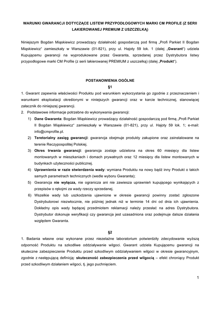 WARUNKI GWARANCJI DOTYCZĄCE LISTEW PRZYPODŁOGOWYCH MARKI CM PROFILE (Z SERII LAKIEROWANEJ PREMIUM Z USZCZELKĄ) Niniejszym Bogdan Miąskiewicz prowadzący działalność gospodarczą pod firmą „Profi Parkiet II Bogdan Miąskiewicz“ zamieszkały w Warszawie (01-821), przy ul. Hajoty 59 lok. 1 (dalej „Gwarant“) udziela Kupującemu gwarancji na wyprodukowane przez Gwaranta, sprzedanej przez Dystrybutora listwy przypodłogowe marki CM Profile (z serii lakierowanej PREMIUM z uszczelką) (dalej „Produkt“). POSTANOWIENIA OGÓLNE §1 1. Gwarant zapewnia właściwości Produktu pod warunkiem wykorzystania go zgodnie z przeznaczeniem i warunkami eksploatacji określonymi w niniejszych gwarancji oraz w karcie technicznej, stanowiącej załacznik do niniejszej gwarancji. 2. Podstawowe informacje potrzebne do wykonywania gwarancji: 1) Dane Gwaranta: Bogdan Miąskiewicz prowadzący działalność gospodarczą pod firmą „Profi Parkiet II Bogdan Miąskiewicz“ zamieszkały w Warszawie (01-821), przy ul. Hajoty 59 lok. 1; e-mail: [email protected]. 2) Teretorialny zasięg gwarancji: gwarancja obejmuje produkty zakupione oraz zainstalowane na terenie Reczypospolitej Polskiej. 3) Okres trwania gwarancji: gwarancja zostaje udzielona na okres 60 miesięcy dla listew montowanych w mieszkaniach i domach prywatnych oraz 12 miesięcy dla listew montowanych w budynkach użyteczności publicznej. 4) Uprawnienia w razie stwierdzenia wady: wymiana Produktu na nowy bądź inny Produkt o takich samych parametrach technicznych (wedle wyboru Gwaranta); 5) Gwarancja nie wyłącza, nie ogranicza ani nie zawiesza uprawnień kupującego wynikających z przepisów o rękojmi za wady rzeczy sprzedanej. 6) Wszelkie wady lub uszkodzenia ujawnione w okresie gwarancji powinny zostać zgłoszone Dystrybutorowi niezwłocznie, nie później jednak niż w terminie 14 dni od dnia ich ujawnienia. Dokładny opis wady będącej przedmiotem reklamacji należy przesłać na adres Dystrybutora. Dystrybutor dokonuje weryfikacji czy gwarancja jest uzasadniona oraz podejmuje dalsze działania względem Gwaranta. §2 1. Badania własne oraz wykonane przez niezelażne laboratorium potwierdziły zdecydowanie wyższą odporność Produktu na szkodliwe oddziaływanie wilgoci. Gwarant udziela Kupującemu gwarancji na skuteczne zabezpieczenie Produktu przed szkodliwym oddziaływaniem wilgoci w okresie gwarancyjnym, zgodnie z następującą definicją: skuteczność zabezpieczenia przed wilgocią – efekt chroniący Produkt przed szkodliwym działaniem wilgoci, tj. jego puchnięciem. 1 §3 1. Gwarant odpowiada przed Kupującym wyłącznie za wady fizyczne powstałe z przyczyn tkwiących w sprzedanym Produkcie. Gwarancją nie są objęte: 1) wady powstałe w wyniku nieprawidłowego montażu lub konserwacji Produktu (tj. w sposób niezgodny z dokumentem “Zalecenia Producenta Dotyczące Montażu i Konserwacji Lakierowanych Listew Przypodłogowych” dostępnym na stronie www.cmprofile.pl/gwarancja), 2) przypadki odklejenia się produktu od ściany, 3) uszkodzenia produktu wynikające z wad konstrukcyjnych pomieszczeń, tj.: złej izolacji ścian i/lub nieszczelnych okien i drzwi, 4) uszkodzenia mechaniczne oraz wady powstałe w ich skutek, 5) uszkodzenia produktu powstałe w wyniku zalania go wodą, 6) przypadki kurczenia bądź wydłużenia się listwy do 1% jej długości. 2. Gwarancja obejmuje wyłącznie listwy lakierowane z serii Premium, które zostały zakupione wraz z uszczelką ABS lub silikonową oraz zamontowane nowym sposobem montażu CM Profile (tzw. „montaż na krążki“ dokładnie opisany na filmie montażowym https://www.youtube.com/watch?v=NCT05doWpS8). WYŁĄCZENIA §4 Z zakresu niniejszej gwarancji wyłączone są przypadki stosowania Produktu na skalę przemysłową i metodami przemysłowymi. Za takie przypadki uznaje się użycie Produktu związane z działalnością gospodarczą z wyłączeniem zastosowania Produktu na własny użytek. W takich wypadkach gwarancja może zostać udzielona na podstawie indywidualnych warunków ustalonych każdorazowo z Gwarantem. ZASADY ZGŁASZANIA REKLAMACJI §5 1. Podstawą przyjęcia reklamacji do rozpatrzenia jest spełnienie łącznie następujących warunków: 1) zgłoszenie reklamacji przez Kupującego nastąpi pisemnie na formularzu "Zgłoszenie reklamacyjne" zamieszczonym na stronie www.cmprofile.pl, 2) zgłoszenie reklamacji powinno zawierać nazwę towaru, numer katalogowy, datę zakupu, szczegółowy opis uszkodzenia wraz z dodatkowymi informacjami dotyczącymi powstania wad Produktu oraz zdjęcia wadliwego Produktu 3) okazania oryginału faktury lub paragonu reklamowanego Produktu, 4) dostarczenia osobistego lub za pośrednictwem przewoźnika (spedytora) reklamowanego Produktu do siedziby Dystrybutora, po uprzednim uzgodnieniu z Dystrybutorem. §6 1. Jako dzień zgłoszenia reklamacji przyjmuje się dzień, w którym dotarło ono do Dystrybutora w formie pisemnej. 2. W terminie 21 dni licząc od daty zgłoszenia, Dystrybutor udzieli Kupującemu pisemnej odpowiedzi odnośnie przyjęcia reklamacji. 2 Jeżeli zgłoszenie reklamacyjne zawiera braki, które można usunąć (np. nie zawiera wszystkich niezbędnych informacji, do reklamacji nie dołączono dowodu zakupu), a Kupujący podał dane umożliwiające kontakt, Dystrybutor wezwie go do uzupełnienia braków zgłoszenia. W przypadku braku uzupełnienia zgłoszenia w terminie 14 dni, zgłoszenie reklamacyjne nie zostanie rozpoznane. Gwarant zastrzega sobie prawo do wizji lokalnej w miejscu zamonotowania reklamowanego Produktu. Kupujący zapewni każdorazowo osobom upoważnionym przez Gwaranta w uzgodnionym terminie dostęp do Produktu będącego przedmiotem reklamacji w celu dokonania oględzin. Uniemożliwienie przez Kupującego dokonania oględzin traktuje się jako rezygnację z reklamacji. OBOWIĄZKI GWARANTA §7 1. Obowiązku Gwarnata ograniczają się do bezpłatnej naprawy Produktu, wymiany na nowy bądź 