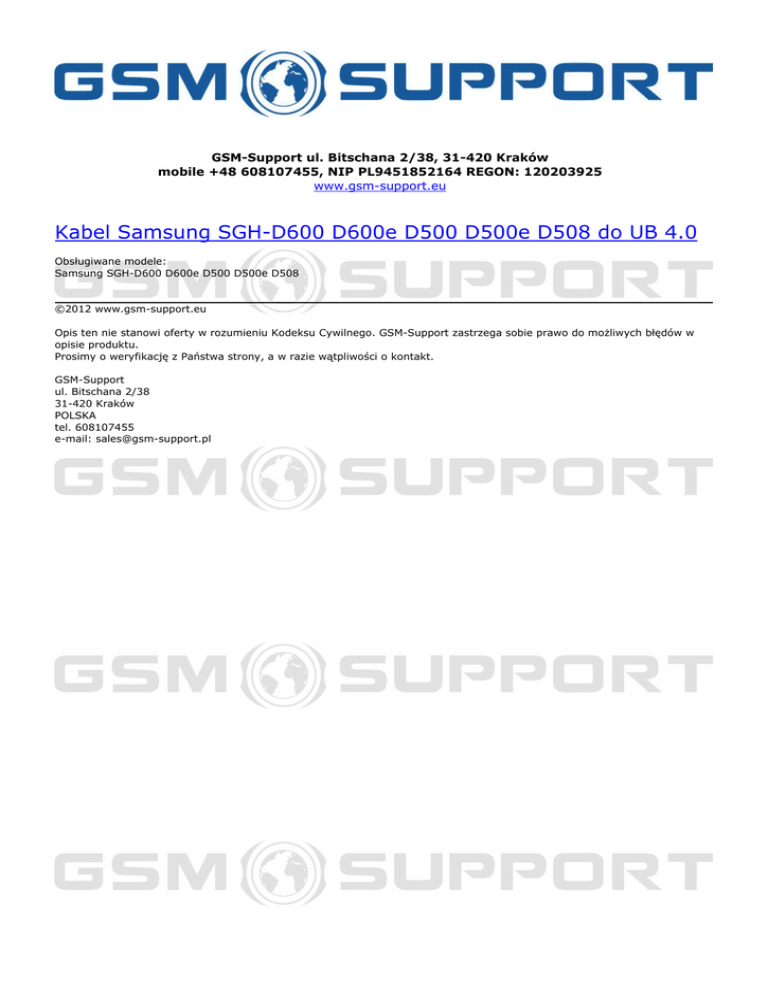 GSM-Support ul. Bitschana 2/38, 31-420 Kraków mobile +48 608107455, NIP PL9451852164 REGON: 120203925 www.gsm-support.eu Kabel Samsung SGH-D600 D600e D500 D500e D508 do UB 4.0 Obsługiwane modele: Samsung SGH-D600 D600e D500 D500e D508 ©2012 www.gsm-support.eu Opis ten nie stanowi oferty w rozumieniu Kodeksu Cywilnego. GSM-Support zastrzega sobie prawo do możliwych błędów w opisie produktu. Prosimy o weryfikację z Państwa strony, a w razie wątpliwości o kontakt. GSM-Support ul. Bitschana 2/38 31-420 Kraków POLSKA tel. 608107455 e-mail: [email protected] Powered by TCPDF (www.tcpdf.org)