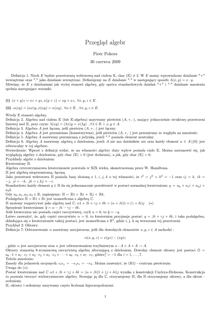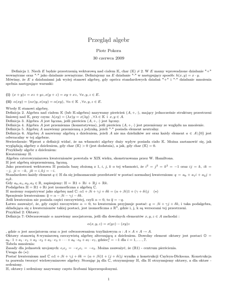 Definicja 2. Algebra nad ciałem K (lub K-algebra) nazywamy pierścień (A, +, ·), mający jednocześnie strukturę przestrzeni