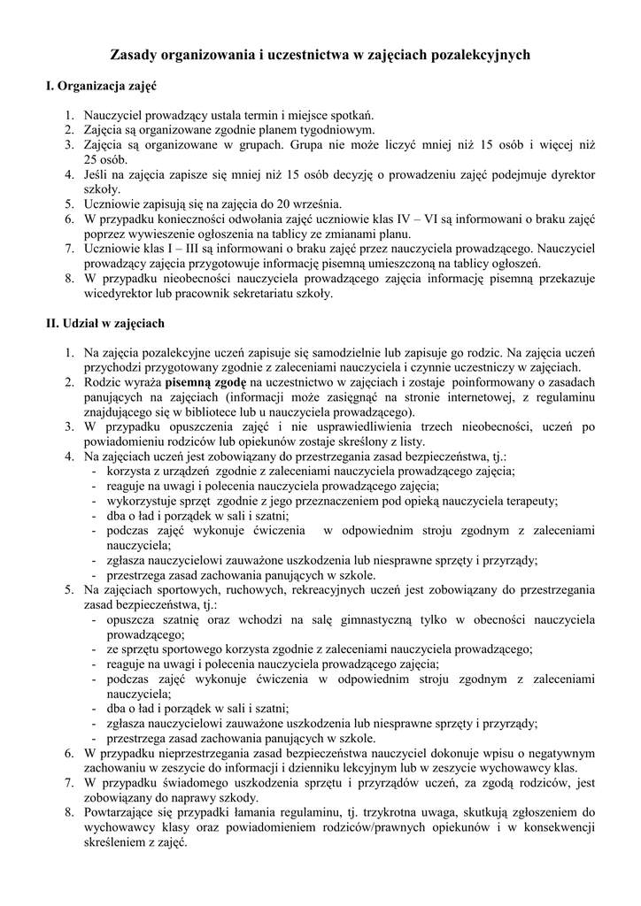 Zasady organizowania i uczestnictwa w zajęciach pozalekcyjnych I. Organizacja zajęć 1. Nauczyciel prowadzący ustala termin i miejsce spotkań. 2. Zajęcia są organizowane zgodnie planem tygodniowym. 3. Zajęcia są organizowane w grupach. Grupa nie moŜe liczyć mniej niŜ 15 osób i więcej niŜ 25 osób. 4. Jeśli na zajęcia zapisze się mniej niŜ 15 osób decyzję o prowadzeniu zajęć podejmuje dyrektor szkoły. 5. Uczniowie zapisują się na zajęcia do 20 września. 6. W przypadku konieczności odwołania zajęć uczniowie klas IV – VI są informowani o braku zajęć poprzez wywieszenie ogłoszenia na tablicy ze zmianami planu. 7. Uczniowie klas I – III są informowani o braku zajęć przez nauczyciela prowadzącego. Nauczyciel prowadzący zajęcia przygotowuje informację pisemną umieszczoną na tablicy ogłoszeń. 8. W przypadku nieobecności nauczyciela prowadzącego zajęcia informację pisemną przekazuje wicedyrektor lub pracownik sekretariatu szkoły. II. Udział w zajęciach 1. Na zajęcia pozalekcyjne uczeń zapisuje się samodzielnie lub zapisuje go rodzic. Na zajęcia uczeń przychodzi przygotowany zgodnie z zaleceniami nauczyciela i czynnie uczestniczy w zajęciach. 2. Rodzic wyraŜa pisemną zgodę na uczestnictwo w zajęciach i zostaje poinformowany o zasadach panujących na zajęciach (informacji moŜe zasięgnąć na stronie internetowej, z regulaminu znajdującego się w bibliotece lub u nauczyciela prowadzącego). 3. W przypadku opuszczenia zajęć i nie usprawiedliwienia trzech nieobecności, uczeń po powiadomieniu rodziców lub opiekunów zostaje skreślony z listy. 4. Na zajęciach uczeń jest zobowiązany do przestrzegania zasad bezpieczeństwa, tj.: - korzysta z urządzeń zgodnie z zaleceniami nauczyciela prowadzącego zajęcia; - reaguje na uwagi i polecenia nauczyciela prowadzącego zajęcia; - wykorzystuje sprzęt zgodnie z jego przeznaczeniem pod opieką nauczyciela terapeuty; - dba o ład i porządek w sali i szatni; - podczas zajęć wykonuje ćwiczenia w odpowiednim stroju zgodnym z zaleceniami nauczyciela; - zgłasza nauczycielowi zauwaŜone uszkodzenia lub niesprawne sprzęty i przyrządy; - przestrzega zasad zachowania panujących w szkole. 5. Na zajęciach sportowych, ruchowych, rekreacyjnych uczeń jest zobowiązany do przestrzegania zasad bezpieczeństwa, tj.: - opuszcza szatnię oraz wchodzi na salę gimnastyczną tylko w obecności nauczyciela prowadzącego; - ze sprzętu sportowego korzysta zgodnie z zaleceniami nauczyciela prowadzącego; - reaguje na uwagi i polecenia nauczyciela prowadzącego zajęcia; - podczas zajęć wykonuje ćwiczenia w odpowiednim stroju zgodnym z zaleceniami nauczyciela; - dba o ład i porządek w sali i szatni; - zgłasza nauczycielowi zauwaŜone uszkodzenia lub niesprawne sprzęty i przyrządy; - przestrzega zasad zachowania panujących w szkole. 6. W przypadku nieprzestrzegania zasad bezpieczeństwa nauczyciel dokonuje wpisu o negatywnym zachowaniu w zeszycie do informacji i dzienniku lekcyjnym lub w zeszycie wychowawcy klas. 7. W przypadku świadomego uszkodzenia sprzętu i przyrządów uczeń, za zgodą rodziców, jest zobowiązany do naprawy szkody. 8. Powtarzające się przypadki łamania regulaminu, tj. trzykrotna uwaga, skutkują zgłoszeniem do wychowawcy klasy oraz powiadomieniem rodziców/prawnych opiekunów i w konsekwencji skreśleniem z zajęć.