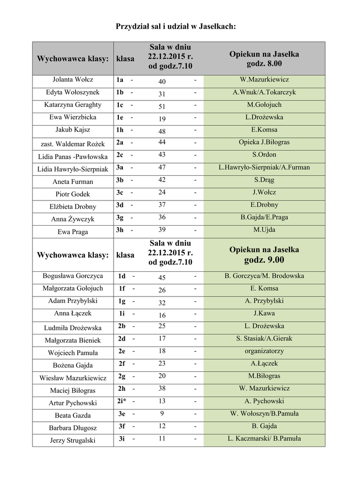 Przydział sal i udział w Jasełkach: Wychowawca klasy: klasa Jolanta Wołcz Sala w dniu 22.12.2015 r. od godz.7.10 Opiekun na Jasełka godz. 8.00 - 40 - W.Mazurkiewicz Edyta Wołoszynek 1b - 31 - A.Wnuk/A.Tokarczyk Katarzyna Geraghty 1c - 51 - M.Gołojuch Ewa Wierzbicka 1e - 19 - L.Drożewska 1h - - E.Komsa - Opieka J.Biłogras Jakub Kajsz 1a zast. Waldemar Rożek 2a - 48 44 Lidia Panas -Pawłowska 2c - 43 - S.Ordon Lidia Hawryło-Sierpniak 3a - 47 - L.Hawryło-Sierpniak/A.Furman 3b - 42 - S.Drąg - 24 - J.Wołcz Elżbieta Drobny 3d - 37 - E.Drobny Anna Żywczyk 3g - 36 - B.Gajda/E.Praga 3h - 39 - M.Ujda Aneta Furman Piotr Godek Ewa Praga 3c Wychowawca klasy: klasa Sala w dniu 22.12.2015 r. od godz.7.10 Opiekun na Jasełka godz. 9.00 Bogusława Gorczyca 1d - 45 - B. Gorczyca/M. Brodowska Małgorzata Gołojuch 1f - 26 - E. Komsa Adam Przybylski 1g - 32 - A. Przybylski Anna Łączek 1i - - J.Kawa - L. Drożewska Ludmiła Drożewska 2b - 16 25 Małgorzata Bieniek 2d - 17 - S. Stasiak/A.Gierak Wojciech Pamuła 2e - 18 - organizatorzy Bożena Gajda 2f - 23 - A.Łączek Wiesław Mazurkiewicz 2g - 20 - M.Biłogras Maciej Biłogras 2h - 38 - W. Mazurkiewicz Artur Pychowski 2i* - 13 - A. Pychowski Beata Gazda 3e - 9 - W. Wołoszyn/B.Pamuła Barbara Długosz 3f - 12 - B. Gajda Jerzy Strugalski 3i - 11 - L. Kaczmarski/ B.Pamuła