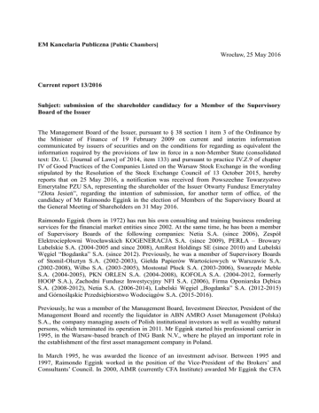 EM Kancelaria Publiczna [Public Chambers] Wrocław, 25 May 2016 Current report 13/2016 Subject: submission of the shareholder candidacy for a Member of the Supervisory Board of the Issuer The Management Board of the Issuer, pursuant to § 38 section 1 item 3 of the Ordinance by the Minister of Finance of 19 February 2009 on current and interim information communicated by issuers of securities and on the conditions for regarding as equivalent the information required by the provisions of law in force in a non-Member State (consolidated text: Dz. U. [Journal of Laws] of 2014, item 133) and pursuant to practice IV.Z.9 of chapter IV of Good Practices of the Companies Listed on the Warsaw Stock Exchange in the wording stipulated by the Resolution of the Stock Exchange Council of 13 October 2015, hereby reports that on 25 May 2016, a notification was received from Powszechne Towarzystwo Emerytalne PZU SA, representing the shareholder of the Issuer Otwarty Fundusz Emerytalny “Złota Jesień”, regarding the intention of submission, for another term of office, of the candidacy of Mr Raimondo Eggink in the election of Members of the Supervisory Board at the General Meeting of Shareholders on 31 May 2016. Raimondo Eggink (born in 1972) has run his own consulting and training business rendering services for the financial market entities since 2002. At the same time, he has been a member of Supervisory Boards of the following companies: Netia S.A. (since 2006), Zespół Elektrociepłowni Wrocławskich KOGENERACJA S.A. (since 2009), PERŁA – Browary Lubelskie S.A. (2004-2005 and since 2008), AmRest Holdings SE (since 2010) and Lubelski Węgiel “Bogdanka” S.A. (since 2012). Previously, he was a member of Supervisory Boards of Stomil-Olsztyn S.A. (2002-2003), Giełda Papierów Wartościowych w Warszawie S.A. (2002-2008), Wilbo S.A. (2003-2005), Mostostal Płock S.A. (2003-2006), Swarzędz Meble S.A. (2004-2005), PKN ORLEN S.A. (2004-2008), KOFOLA S.A. (2004-2012, formerly HOOP S.A.), Zachodni Fundusz Inwestycyjny NFI S.A. (2006), Firma Oponiarska Dębica S.A. (2008-2012), Netia S.A. (2006-2014), Lubelski Węgiel „Bogdanka” S.A. (2012-2015) and Górnośląskie Przedsiębiorstwo Wodociągów S.A. (2015-2016). Previously, he was a member of the Management Board, Investment Director, President of the Management Board and recently the liquidator in ABN AMRO Asset Management (Polska) S.A., the company managing assets of Polish institutional investors as well as wealthy natural persons, which terminated its operation in 2011. Mr Eggink started his professional carrier in 1995, in the Warsaw-based branch of ING Bank N.V., where he played an important role in the establishment of the first asset management company in Poland. In March 1995, he was awarded the licence of an investment advisor. Between 1995 and 1997, Raimondo Eggink worked in the position of the Vice-President of the Brokers’ and Consultants’ Council. In 2000, AIMR (currently CFA Institute) awarded Mr Eggink the CFA (Chartered Financial Analyst) title. Since 2004, Raimondo Eggink has been a member of the Management Board of CFA Society of Poland. He has published numerous articles on development of the Polish capital market, particularly on protection of minority shareholders. In 1994, he graduated from the Jagiellonian University at the Faculty of Theoretical Mathematics, where in 2010 he earned his PhD. Raimondo Eggink is a Dutch citizen residing permanently in Poland. Mr Raimondo Eggink has agreed to be the candidate and approved his appointment as a Member of the Supervisory Board of the Issuer. In line with the statement submitted by Mr Raimondo Eggink to the Company, there are no legal obstacles which would prevent him from performing the function of the Member of the Supervisory Board, particularly obstacles referred to in article 18 § 1 and § 2 or article 387 of the Polish Code of Commercial Partnerships and Companies. Furthermore, Mr Raimondo EGGINK: – is not and does not intend to be involved in any activities competitive against KOGENERACJA S.A. in any form whatsoever; – has not been sentenced pursuant to a final binding sentence for acting to the detriment of the company and there is no pending legal proceeding related to acting to the detriment of the company while holding the position of a member of the company’s governing bodies; – is not registered in the Register of Insolvent Debtors maintained pursuant to the Act on the National Court Register. Legal basis: Article 56 section 1 item 2 of the Public Offering Act – current and interim information