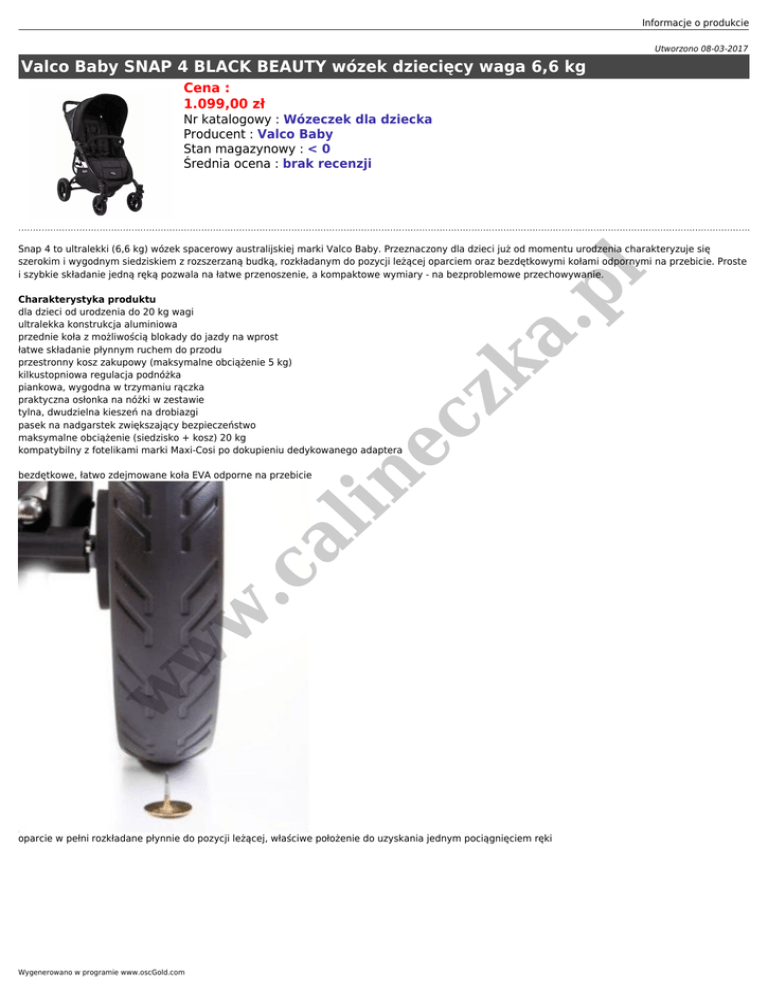 Informacje o produkcie Utworzono 08-03-2017 Valco Baby SNAP 4 BLACK BEAUTY wózek dziecięcy waga 6,6 kg Cena : 1.099,00 zł Nr katalogowy : Wózeczek dla dziecka Producent : Valco Baby Stan magazynowy : < 0 Średnia ocena : brak recenzji zk a. w w w .c al in bezdętkowe, łatwo zdejmowane koła EVA odporne na przebicie ec Charakterystyka produktu dla dzieci od urodzenia do 20 kg wagi ultralekka konstrukcja aluminiowa przednie koła z możliwością blokady do jazdy na wprost łatwe składanie płynnym ruchem do przodu przestronny kosz zakupowy (maksymalne obciążenie 5 kg) kilkustopniowa regulacja podnóżka piankowa, wygodna w trzymaniu rączka praktyczna osłonka na nóżki w zestawie tylna, dwudzielna kieszeń na drobiazgi pasek na nadgarstek zwiększający bezpieczeństwo maksymalne obciążenie (siedzisko + kosz) 20 kg kompatybilny z fotelikami marki Maxi-Cosi po dokupieniu dedykowanego adaptera pl Snap 4 to ultralekki (6,6 kg) wózek spacerowy australijskiej marki Valco Baby. Przeznaczony dla dzieci już od momentu urodzenia charakteryzuje się szerokim i wygodnym siedziskiem z rozszerzaną budką, rozkładanym do pozycji leżącej oparciem oraz bezdętkowymi kołami odpornymi na przebicie. Proste i szybkie składanie jedną ręką pozwala na łatwe przenoszenie, a kompaktowe wymiary - na bezproblemowe przechowywanie. oparcie w pełni rozkładane płynnie do pozycji leżącej, właściwe położenie do uzyskania jednym pociągnięciem ręki Wygenerowano w programie www.oscGold.com pl zk a. w w .c al in ec budka z siateczkowym okienkiem zamykanym na rzep umożliwia podgląd dziecka i zapewnia lepszą wentylację możliwość rozszerzenia budki o 20 cm za pomocą zamka zastosowany filtr UV zapewnia ochronę kolorów w zdejmowana barierka zabezpieczająca, możliwość jednostronnego wypięcia zk a. pl Informacje o produkcie w w w .c al in ec szerokie, komfortowe siedzisko z 5-punktowymi pasami panel wentylacyjny na przedłużeniu tyłu budki zapewnia dodatkową cyrkulację powietrza przy rozłożonym oparciu łatwo dostępny system hamulcowy (hamulec postojowy) obsługiwany za pomocą stopy nawet w letnim obuwiu Wygenerowano w programie www.oscGold.com w w .c al in ec zk a. pl kompaktowe składanie do wewnątrz pozwala utrzymać tapicerkę w czystości do składania/rozkładania wózka wystarczy użycie jednej ręki automatyczna blokada zabezpiecza przed otwarciem zintegrowany pasek do przenoszenia na ramieniu zintegrowany uchwyt do przenoszenia w ręce sam stoi po złożeniu w Dane techniczne (wymiary) rozłożony (dxsxw): 77 x 52 x 103 cm po złożeniu (dxsxw): 77 x 52 x 36 cm siedzisko (bez podnóżka): 33 x 21 cm siedzisko (wraz z podnóżkiem): 33 x 42 cm wysokość oparcia: 47,5 cm średnica koła tylnego: 23,5 cm średnica koła przedniego: 17 cm waga wózka z kółkami 6,6 kg