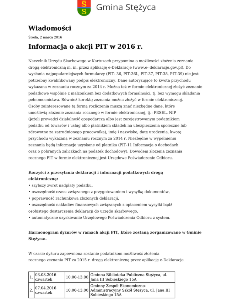Wiadomości Środa, 2 marca 2016 Informacja o akcji PIT w 2016 r. Naczelnik Urzędu Skarbowego w Kartuzach przypomina o możliwości złożenia zeznania drogą elektroniczną m. in. przez aplikację e-Deklaracje (www.e- deklaracje.gov.pl). Do wysłania najpopularniejszych formularzy (PIT- 36, PIT-36L, PIT-37, PIT-38, PIT-39) nie jest potrzebny kwalifikowany podpis elektroniczny. Dane autoryzujące to kwota przychodu wykazana w zeznaniu rocznym za 2014 r. Można też w formie elektronicznej złożyć zeznanie podatkowe wspólnie z małżonkiem bez dodatkowych formalności, tj. bez wymogu składania pełnomocnictwa. Również korektę zeznania można złożyć w formie elektronicznej. Osoby zainteresowane tą formą rozliczenia muszą znać niezbędne dane, które umożliwią złożenie zeznania rocznego w formie elektronicznej, tj.: PESEL, NIP (jeżeli prowadzi działalność gospodarczą albo jest zarejestrowanym podatnikiem podatku od towarów i usług albo płatnikiem składek na ubezpieczenia społeczne lub zdrowotne za zatrudnionego pracownika), imię i nazwisko, datę urodzenia, kwotę przychodu wykazaną w zeznaniu rocznym za 2014 r. Niezbędne w wypełnieniu zeznania będą informacje uzyskane od płatnika (PIT-11 Informacja o dochodach oraz o pobranych zaliczkach na podatek dochodowy). Dowodem złożenia zeznania rocznego PIT w formie elektronicznej jest Urzędowe Poświadczenie Odbioru. Korzyści z przesyłania deklaracji i informacji podatkowych drogą elektroniczną: • szybszy zwrot nadpłaty podatku, • oszczędność czasu związanego z przygotowaniem i wysyłką dokumentów, • poprawność rachunkowa złożonych deklaracji, • oszczędność nakładów finansowych związanych z opłaceniem wysyłki bądź osobistego dostarczenia deklaracji do urzędu skarbowego, • automatyczne uzyskiwanie Urzędowego Poświadczenia Odbioru z system. Harmonogram dyżurów w ramach akcji PIT, które zostaną zorganizowane w Gminie Stężyca:. W czasie dyżuru zapewniona zostanie podatnikom możliwość złożenia rocznego zeznania PIT za 2015 r. drogą elektroniczną przez aplikację e-Deklaracje. 1. 03.03.2016 czwartek 10:00-13:00 Gminna Biblioteka Publiczna Stężyca, ul. Jana III Sobieskiego 15A 2. 07.04.2016 czwartek Gminny Zespół Ekonomiczno10:00-13:00 Administracyjny Szkół Stężyca, ul. Jana III Sobieskiego 15A