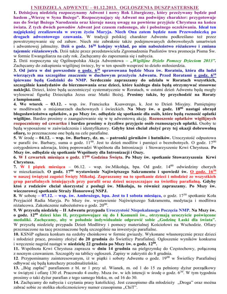I NIEDZIELA ADWENTU – 01.12.2013. OGŁOSZENIA DUSZPASTERSKIE 1. Dzisiejszą niedzielą rozpoczynamy Adwent i nowy Rok Liturgiczny, który przeżywany będzie pod hasłem „Wierzę w Syna Bożego”. Rozpoczynający się Adwent ma podwójny charakter: przygotowuje nas do Świąt Bożego Narodzenia oraz kieruje naszą uwagę na powtórne przyjście Chrystusa na końcu świata. Z tych dwóch powodów Adwent jest czasem radosnego, ale i pobożnego oczekiwania. Ideał ten najpiękniej zrealizowała w swym życiu Maryja. Niech Ona zatem będzie nam Przewodniczką po drogach adwentowego czuwania. W tradycji polskiej charakter Adwentu podkreślano też przez powstrzymywanie się od zabaw. Niech nie zabraknie także podejmowanych dobrowolnych umartwień i adwentowej jałmużny. Dziś o godz. 1650 kolejny wykład, po nim nabożeństwo różańcowe i zmiana tajemnic różańcowych. Dziś także przez przedstawiciela Zgromadzenia Paulistów trwa promocja Pisma Św. w formie Ewangeliarza na cały rok. Zachęcamy do zapoznania się i nabycia. 2. Dziś rozpoczyna się Ogólnopolska Akcja Adwentowa – „Wigilijne Dzieło Pomocy Dzieciom 2013”. Zachęcamy do zakupienia wigilijnej świecy, by w ten sposób wesprzeć to dzieło miłosierdzia. 3. Od jutra w dni powszednie o godz. 630 sprawowana będzie Msza św. Roratnia, która dla ludzi wierzących ma szczególne znaczenie w duchowym przeżyciu Adwentu. Przed Roratami o godz. 610 śpiewane będą Godzinki do NMP. Serdecznie zapraszamy do udziału w Roratach wszystkich, szczególnie kandydatów do bierzmowania oraz dzieci, które każdego dnia będą otrzymywać stosowne naklejki. Dzieci, które będą uczestniczyć systematycznie w Roratach, w ostatni dzień Adwentu będą mogły wylosować figurkę Dzieciątka Jezus oraz Matki Bożej. Prosimy także, by przychodzić na Roraty z lampionami. 4. We wtorek – 03.12. - wsp. św. Franciszka Ksawerego, k. Jest to Dzień Misyjny. Pamiętajmy w modlitwach o misjonarzach duchownych i świeckich. Na Mszy św. o godz. 1800 nastąpi obrzęd błogosławieństwa opłatków, a po Mszy św. odbędzie się spotkanie dla osób, które będą roznosić opłatki wigilijne. Bardzo prosimy o zaangażowanie się w tę adwentową akcję. Roznoszenie opłatków wigilijnych rozpoczniemy od czwartku i bardzo prosimy o życzliwe przyjęcie osób roznoszących opłatki. Osoby te będą wyposażone w zaświadczenia i identyfikatory. Gdyby ktoś chciał złożyć przy tej okazji dobrowolną ofiarę, to przeznaczone one będą na cele parafialne. 5. W środę – 04.12. – wsp. św. Barbary, dz. m. – patronki górników i hutników. Uroczystość odpustowa w parafii św. Barbary, suma o godz. 1100. Jest to dzień modlitw i pamięci o bezrobotnych. O godz. 1700 cotygodniowa adoracja, którą poprowadzi Wspólnota dla Intronizacji i Stowarzyszenie Krwi Chrystusa. Po Mszy św. odbędzie się spotkanie Wspólnoty dla Intronizacji i Oazy. 6. W I czwartek miesiąca o godz. 1700 Godzina Święta. Po Mszy św. spotkanie Stowarzyszenia Krwi Chrystusa. 7. W I piątek miesiąca – 06.12. - wsp. św.Mikołaja, bpa. Od godz. 1400 odwiedziny chorych w mieszkaniach. O godz. 1700 wystawienie Najświętszego Sakramentu i spowiedź św. O godz. 1630 w naszej świątyni zagości Święty Mikołaj. Zapraszamy na to spotkanie dzieci i młodzież ze wszystkich grup parafialnych istniejących przy parafii oraz dzieci uczęszczające na świetlicę parafialną. Gdyby ktoś z rodziców chciał skorzystać z posługi św. Mikołaja, to również zapraszamy. Po Mszy św. wieczorowej spotkanie Straży Honorowej NSPJ. 8. W sobotę – 07.12. – wsp. św. Ambrożego, bpa. Jest to I sobota miesiąca, o godz. 1730 spotkanie Koła Przyjaciół Radia Maryja. Po Mszy św. wystawienie Najświętszego Sakramentu, medytacja i modlitwa różańcowa. Zakończenie nabożeństwa o godz. 2000. 9. W przyszłą niedzielę – II Adwentu przypada Uroczystość Niepokalanego Poczęcia NMP. Na Mszy św. o godz. 1200 dzieci klas II, przygotowujące się do I Komunii św., otrzymają uroczyście poświęcone medaliki. Zachęcamy, aby w południe indywidualnie odprawić sobie „Godzinę Łaski dla świata”. W przyszłą niedzielę przypada Dzień Modlitwy i pomocy materialnej Kościołowi na Wschodzie. Ofiary przeznaczone na tacę przeznaczone będą szczególnie na inwestycje parafialne. 10. KSNiP ogłasza konkurs na ozdoby choinkowe w formie gwiazdy. Wykonane własnoręcznie przez dzieci i młodzież prace, prosimy złożyć do 20 grudnia do Świetlicy Parafialnej. Ogłoszenie wyników konkursu i wręczenie nagród nastąpi w niedzielę 22 grudnia po Mszy św. o godz. 1200. 11. Wspólnota Krwi Chrystusa zaprasza w dniu 14 grudnia na pielgrzymkę do Częstochowy, połączoną z nocnym czuwaniem. Szczegóły na tablicy ogłoszeń. Zapisy w zakrystii do 8 grudnia. 12. Przypominamy zainteresowanym, iż w piątki i soboty Adwentu o godz. 19 00 w Świetlicy Parafialnej odbywać się będą katechezy przedmałżeńskie. 13. „Bóg zapłać” parafianom z bl. nr 1 przy ul. Wianek, m. od 1 do 15 za pełniony dyżur porządkowy w świątyni i ofiarę 130 zł. Pracowało 4 osoby. Msza św. w ich intencji w środę o godz. 6 30. W tym tygodniu prosimy o taki dyżur parafian z tego samego bloku, m. od 16 do 30. 14. Zachęcamy do nabycia i czytania prasy katolickiej. Jest czasopismo dla młodzieży „Droga” oraz można zabrać sobie ze stolika okolicznościowy numer czasopisma „ChiT”.