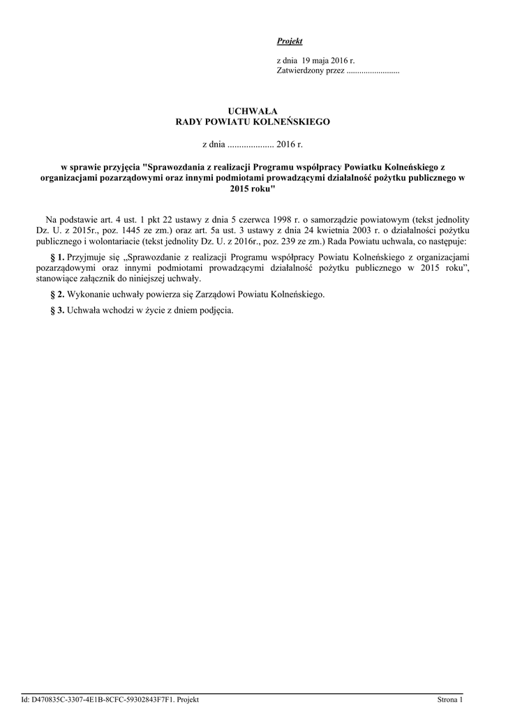 Projekt z dnia 19 maja 2016 r. Zatwierdzony przez ......................... UCHWAŁA RADY POWIATU KOLNEŃSKIEGO z dnia .................... 2016 r. w sprawie przyjęcia "Sprawozdania z realizacji Programu współpracy Powiatku Kolneńskiego z organizacjami pozarządowymi oraz innymi podmiotami prowadzącymi działalność pożytku publicznego w 2015 roku" Na podstawie art. 4 ust. 1 pkt 22 ustawy z dnia 5 czerwca 1998 r. o samorządzie powiatowym (tekst jednolity Dz. U. z 2015r., poz. 1445 ze zm.) oraz art. 5a ust. 3 ustawy z dnia 24 kwietnia 2003 r. o działalności pożytku publicznego i wolontariacie (tekst jednolity Dz. U. z 2016r., poz. 239 ze zm.) Rada Powiatu uchwala, co następuje: § 1. Przyjmuje się „Sprawozdanie z realizacji Programu współpracy Powiatu Kolneńskiego z organizacjami pozarządowymi oraz innymi podmiotami prowadzącymi działalność pożytku publicznego w 2015 roku”, stanowiące załącznik do niniejszej uchwały. § 2. Wykonanie uchwały powierza się Zarządowi Powiatu Kolneńskiego. § 3. Uchwała wchodzi w życie z dniem podjęcia. Id: D470835C-3307-4E1B-8CFC-59302843F7F1. Projekt Strona 1 Załącznik do Uchwały ....... Rady Powiatu Kolneńskiego z dnia ............... 2016r. Starostwo Powiatowe w Kolnie SPRAWOZDANIE Z REALIZACJI PROGRAMU WSPÓŁPRACY POWIATU KOLNEŃSKIEGO Z ORGANIZACJAMI POZARZĄDOWYMI ORAZ PODMIOTAMI PROWADZĄCYMI DZIAŁALNOŚĆ POŻYTKU PUBLICZNEGO ZA ROK 2015. Kolno, kwiecień 2016r. Sprawozdanie z realizacji Programu Współpracy Powiatu Kolneńskiego z organizacjami pozarządowymi oraz podmiotami prowadzącymi działalność pożytku publicznego za rok 2015 I. WPROWADZENIE Roczny program współpracy powiatu kolneńskiego z organizacjami pozarządowymi oraz podmiotami prowadzącymi działalność pożytku publicznego na rok 2015 został uchwalony 24 października 2014 roku Uchwałą Rady Powiatu Kolneńskiego Nr XXXV/234/14. Podjęcie inicjatywy uchwałodawczej wynikało z art. 5a ust. 1 ustawy z dnia 24 kwietnia 2003 roku o działalności pożytku publicznego i o wolontariacie (tekst jednolity Dz. U. z 2016r., poz. 1118. ze zm.). Celem programu było wyzwolenie potencjału aktywności obywatelskiej, wrażliwości społecznej oraz umacnianie, poprzez wspólne działania lokalnych więzi, wzmocnienie rozwoju społeczeństwa obywatelskiego, budowanie partnerstwa oraz wspieranie organizacji pozarządowych w realizacji ważnych celów społecznych. Rolą programu było także urzeczywistnienie zasady pomocniczości oraz umacnianie uprawnień obywateli i ich wspólnot; kształtowanie demokratycznego ładu społecznego w środowisku lokalnym, poprzez budowanie partnerstwa pomiędzy administracją publiczną a organizacjami pozarządowymi; podniesienie jakości życia i pełniejsze zaspokojenie potrzeb mieszkańców Powiatu poprzez zwiększenie aktywności organizacji; stworzenie warunków do powstania inicjatyw i struktur funkcjonujących na rzecz społeczności lokalnej; wykorzystanie potencjału i możliwości organizacji pozarządowych; otwarcie na innowacyjność i konkurencyjność w wykonaniu zadań publicznych; integracja organizacji realizujących zadania publiczne; promowanie i wzmacnianie postaw obywatelskich; racjonalne wykorzystanie publicznych Id: D470835C-3307-4E1B-8CFC-59302843F7F1. Projekt Strona 1 środków finansowych; udzielanie pomocy w pozyskiwaniu środków pochodzących z innych źródeł zewnętrznych, na realizację zadań własnych Powiatu. Program powstał w oparciu o wiedzę i doświadczenie zarówno pracowników Starostwa Powiatowego w Kolnie oraz powiatowych jednostek organizacyjnych, jak również organizacji pozarządowych. II. FORMY WSPÓŁPRACY Podstawowe formy współpracy Powiatu Kolneńskiego z organizacjami w 2015 roku miały charakter zarówno finansowy, jak też pozafinansowy. Współpraca o charakterze finansowym: Zarząd Powiatu Kolneńskiego Uchwałą Nr 10/41/15 z dnia 5 marca 2015 r. udzielił wsparcia w realizacji zadań publicznych w zakresie: Upowszechniania kultury fizycznej i sportu w 2015r. Lp. Nazwa organizacji składającej wniosek 1. „Towarzystwo Przyjaciół Borkowa” 3. KOLNEŃSKI KLUB SPORTOWY "ORZEŁ" 4. KOLNEŃSKI KLUB SPORTOWY "ORZEŁ" 5. STOWARZYSZENIE RATOWNIKÓW WOPR KOLNO 6. Uczniowski Klub Sportowy „Rekord” 7. Uczniowski Klub Sportowy "OLIMPIA" 8. Stowarzyszenie KOLNO 4X4 9. Parafia Rzymsko-Katolicka pw. Św. Anny w Kolnie 10 Towarzystwo „Jan z Kolna” 11 Towarzystwo „Jan z Kolna” 12 Stowarzyszenie Klub Seniora w Samulach 13 Stowarzyszenie Przyjaciół Jurca 14. Stowarzyszenie Integracyjno-sportowe w Stawiskach Id: D470835C-3307-4E1B-8CFC-59302843F7F1. Projekt Nazwa planowanego do realizacji wniosku Jazda na rowerze to przepustka do zdrowia Organizacja turnieju rozgrywek meczy piłki nożnej , grup młodzików, orlików i żaków ORGANIZACJA IMPREZ SPORTOWYCH (mecze, turnieje) szkolenie drużyn seniorów, grup młodzieżowych w rozgrywkach pod patronatem PZPN Przeprowadzenie Triathlonu dla młodzieży ze szkół Powiatu Kolneńskiego oraz osób dorosłych w celu zwiększenia wydolności i poprawy kondycji fizycznej XI Otwarte Mistrzostwa Kolna w Tenisie Stołowym Udział juniorek młodszych i młodziczek UKS „Olimpia” Kolno w Mistrzostwach Ligi Okręgowej Podlaskiego Wojewódzkiego Związku Piłki Ręcznej w Białymstoku i w Klubowych Mistrzostwach Polski …...w sezonie III-XII 2015 Wyczynowy raj offradowy im. Jana z Kolna Cykl spotkań aktywizujących dla osób niepełnosprawnych VII Szachowe Mistrzostwa Kolna Dzieci i Młodzieży Szkolnej im. Akiby Rubinsteina XXVI Kolneńskie Biegi Jesieni Cykl spotkań integracyjno -sportowych Zajęcia sportoworekreacyjne dla mieszkańców Gminy Stawiski V Międzynarodowy Przyznana dotacja 500 1 300 4 000 1 200 1 800 1 000 2 000 1 200 500 2 000 500 1 500 2 500 Strona 2 Turniej Oldbojów SUMA 20 000,00 Kultury i sztuki, ochrony dziedzictwa kulturowego w 2015r. Lp. Nazwa organizacji składającej wniosek Stowarzyszen