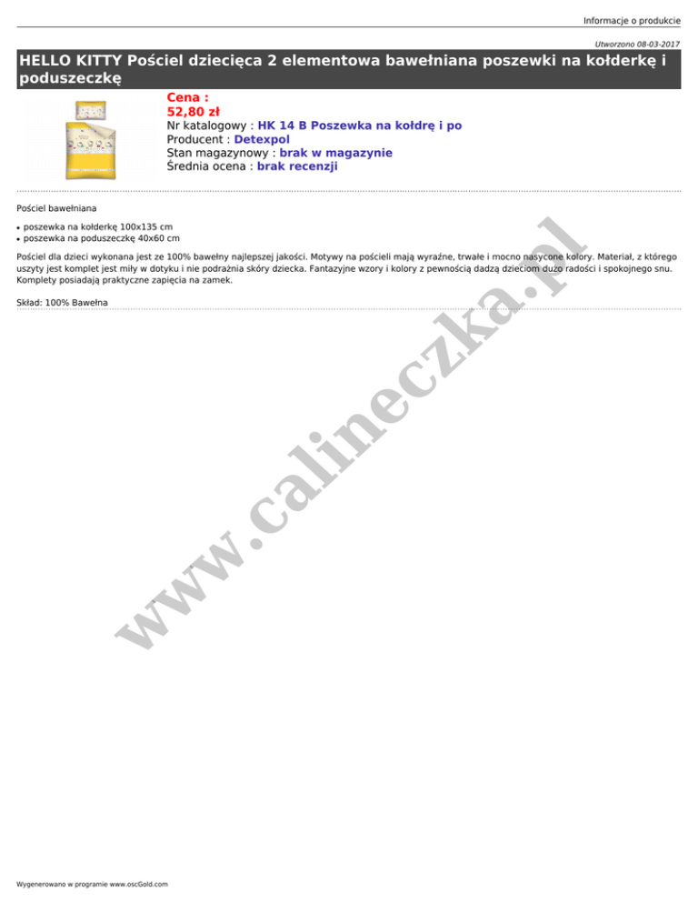 Informacje o produkcie Utworzono 08-03-2017 HELLO KITTY Pościel dziecięca 2 elementowa bawełniana poszewki na kołderkę i poduszeczkę Cena : 52,80 zł Nr katalogowy : HK 14 B Poszewka na kołdrę i po Producent : Detexpol Stan magazynowy : brak w magazynie Średnia ocena : brak recenzji Pościel bawełniana ● poszewka na kołderkę 100x135 cm poszewka na poduszeczkę 40x60 cm pl ● zk a. Pościel dla dzieci wykonana jest ze 100% bawełny najlepszej jakości. Motywy na pościeli mają wyraźne, trwałe i mocno nasycone kolory. Materiał, z którego uszyty jest komplet jest miły w dotyku i nie podrażnia skóry dziecka. Fantazyjne wzory i kolory z pewnością dadzą dzieciom dużo radości i spokojnego snu. Komplety posiadają praktyczne zapięcia na zamek. w w w .c al in ec Skład: 100% Bawełna Wygenerowano w programie www.oscGold.com