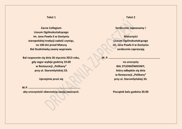 Tekst 1 Tekst 2 Zacne Collegium Liceum Ogólnokształcącego im. Jana Pawła II w Gostyniu staropolskiej tradycji zadość czyniąc, na 100 dni przed Maturą Bal Studniówką zwany wyprawia. Serdecznie zapraszamy ! Bal rozpocznie się dnia 26 stycznia 2013 roku, gdy zegar wybije godzinę 19.00 w Restauracji „Pelikany” przy ul. Staromłyńskiej 33. Maturzyści Liceum Ogólnokształcącego im. Jana Pawła II w Gostyniu serdecznie zapraszają Uprzejmie prosi się W. P. ............................................................... na uroczysty BAL STUDNIÓWKOWY, który odbędzie się dnia w Restauracji „Pelikany” przy ul. Staromłyńskiej 33. W.P. ................................................................ aby uroczystość obecnością swoją zaszczycić. Początek balu godzina 20.00 Tekst 3 Tekst 4 Z radością zawiadamiamy Jeszcze niedojrzali, ale już świadomi tego, co nas czeka za 100 dni W. P. .................................................................. iż wobec faktu nieuchronnie zbliżającej się matury, nawiązując do wieloletniej tradycji, nasza brać uczniowska dnia 26 stycznia 2013 roku, o godzinie 20.00 bal studniówkowy wyprawić postanawia. Maturzyści Liceum Ogólnokształcącego im. Jana Pawła II w Gostyniu mają przyjemność zaprosić Bal odbędzie się w budynku szkoły. W.P. …………………………………………………… na ostatni bal przed maturą, czyli Studniówkę 2013. Uprzejmie zatem prosimy WP, aby poddając nasze zaproszenie łaskawej atencji uświetnili uroczystość swą obecnością. Maturzyści, AD 2013 Uroczyste rozpoczęcie balu odbędzie się o godzinie 20.00 dnia 26 stycznia 2013 roku w Restauracji „Pelikany” przy ul. Staromłyńskiej 33. Tekst 5 My najstarsi Żakowie Collegium z radością zawiadamiamy W.P. ................................................................... iż na 100 dni przed Maturą Bal Studniówkowy odprawiać postanawiamy. Bal ów dnia 26 stycznia AD 2013 o godzinie 19.00 w Restauracji „Pelikany” przy ul. Staromłyńskiej 33 odprawion zostanie. Przeto prosim Wielmożnych Państwa, by swym przybyciem uciechą niezmierną gawiedź naszą uraczyli. Tekst 6 Jako to zawżdy bywało takoż i tego Roku Pańskiego najprzedniejsi Żakowie Liceum Ogólnokształcącego im. Jana Pawła II w Gostyniu Bal Studniówkowy w Restauracji „Pelikany” przy ul. Staromłyńskiej 33 wyprawiać zamiarują, snadź W.P. ................................................................... pokornie o przybycie dnia onego proszą. A mając to na pieczy, iże wesołe pląsy takoż i smakowite jadła Was tu uradują, zaszczyćcież nas Zacni Państwo swą obecnością.