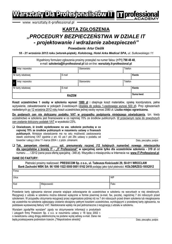 KARTA ZGŁOSZENIA „PROCEDURY BEZPIECZEŃSTWA W DZIALE IT - projektowanie i wdrażanie zabezpieczeń” Prowadzenie: Artur Cieślik 18 - 21 września 2012 roku (wtorek-piątek), Kołobrzeg, Hotel Arka Medical SPA, ul. Sułkowskiego 11 Wypełniony formularz zgłoszenia prosimy przesyłać na numer faksu: (+71) 798 48 48, e-mail: [email protected] lub on-line: warsztaty.it-professional.pl 1. Imię i nazwisko Stanowisko Nr karty rabatowej 2. Telefon E-mail Imię i nazwisko Kwota Stanowisko Nr karty rabatowej Telefon E-mail Kwota Suma kwot RAZEM Koszt uczestnictwa 1 osoby w szkoleniu wynosi 1880 zł i obejmuje koszt materiałów, opiekę koordynatora, pełne wyżywienie, zakwaterowanie w pokojach 2-osobowych (dopłata do pokoju 1-osobowego wynosi 500 zł). Przy zgłoszeniach nadesłanych po 12 września 2012 roku koszt uczestnictwa jednej osoby wynosi 2080 zł. Liczba miejsc ograniczona. Do podanych cen nie doliczamy podatku VAT w przypadku podpisania niniejszego oświadczenia, tzn. kiedy uczestnictwo w szkoleniu jest finansowane w co najmniej 70% ze środków publicznych. W przeciwnym razie do powyższych cen zostanie doliczony podatek VAT w wysokości 23%. Oświadczam, iż środki wydatkowane na ww. szkolenie pochodzą w co najmniej 70% ze środków publicznych w rozumieniu ustawy o finansach publicznych. Niniejsze oświadczenie ma na celu możliwość zastosowania stawki zwolnionej VAT zgodnie z art. 43 ust.1 pkt 29c ustawy o podatku od towarów i usług z dnia 11 marca 2004 r. z późn. zmianami. __________________________________________ Data, pieczątka, podpis Tak, zamawiam również ……. szt. prenumeraty rocznej (12 kolejnych numerów) nowego miesięcznika dla specjalistów z branży IT - „IT Professional” w specjalnej cenie tylko dla uczestników szkolenia - 319 zł od numeru …. / 2012 (cena poza ofertą specjalną - 348 zł). Wszystko o miesięczniku w Internecie na: www.IT-Professional.pl DANE DO FAKTURY: Płatności prosimy realizować: PRESSCOM Sp. z o.o., ul. Tadeusza Kościuszki 29, 50-011 WROCŁAW Bank Zachodni WBK SA: 96 1090 1522 0000 0001 0162 2418 podając jako tytuł płatności: KOŁOBRZEG-18IX2012 Firma Ulica Kod NIP Miejscowość Faks Przesłanie karty zgłoszenia stanowi prawnie wiążące zobowiązanie do uczestnictwa w szkoleniu na warunkach w niej określonych. Rezygnacji z udziału w szkoleniu można dokonać wyłącznie w formie pisemnej (e-mail, fax, poczta), najpóźniej 7 dni roboczych przed szkoleniem. W przypadku otrzymania rezygnacji przez organizatora później niż na 7 dni roboczych przed dniem szkolenia lub niezgłoszenia się uczestnika na szkolenie zgłaszający zostanie obciążony pełnymi kosztami uczestnictwa, wynikającymi z przesłanej karty zgłoszenia, na podstawie wystawionej faktury VAT. Niedokonanie wpłaty nie jest jednoznaczne z rezygnacją z udziału w szkoleniu. Wyrażam zgodę/Nie wyrażam* zgody na otrzymywanie informacji o produktach i usługach firmy Presscom Sp. z o.o. w rozumieniu ustawy z 18 lipca 2002 r. o świadczeniu usług drogą elektroniczną na podane wyżej adresy e-mail. Dane nie będą przekazywane podmiotom trzecim. [*Niepotrzebne skreślić] __________________________________________ Data, pieczątka, podpis