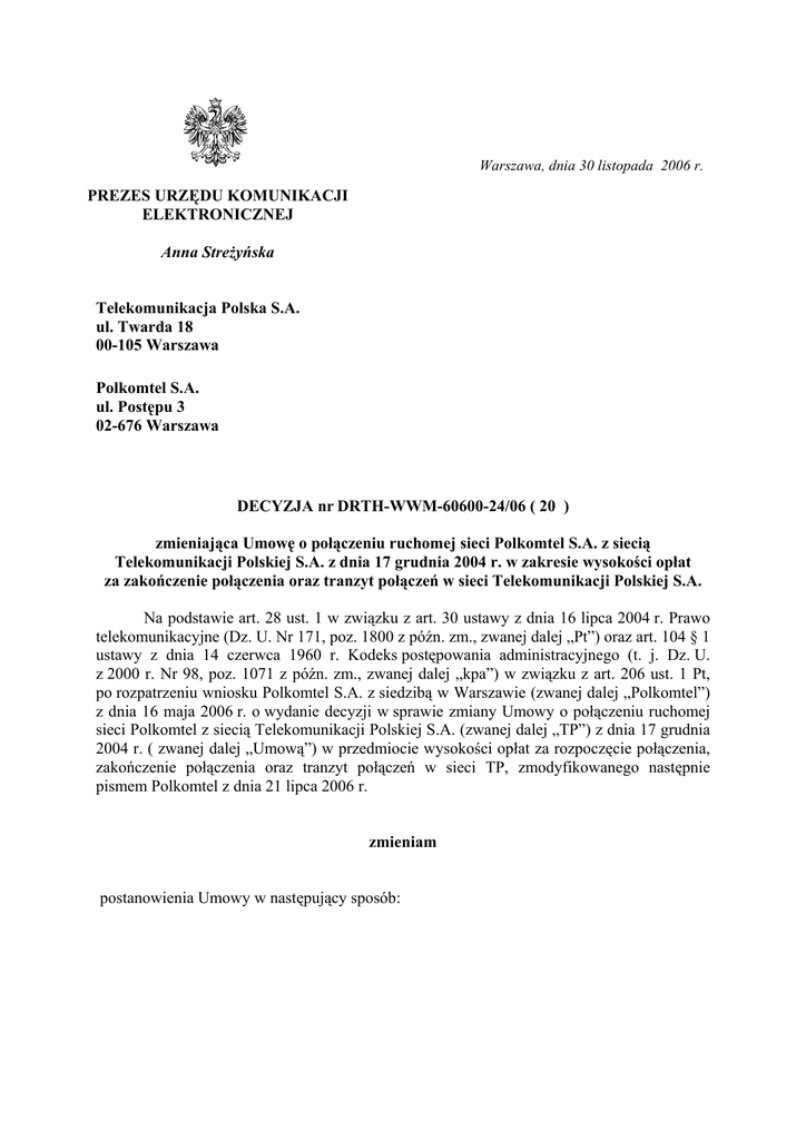 Warszawa, dnia 30 listopada 2006 r. PREZES URZĘDU KOMUNIKACJI ELEKTRONICZNEJ Anna Streżyńska Telekomunikacja Polska S.A. ul. Twarda 18 00-105 Warszawa Polkomtel S.A. ul. Postępu 3 02-676 Warszawa DECYZJA nr DRTH-WWM-60600-24/06 ( 20 ) zmieniająca Umowę o połączeniu ruchomej sieci Polkomtel S.A. z siecią Telekomunikacji Polskiej S.A. z dnia 17 grudnia 2004 r. w zakresie wysokości opłat za zakończenie połączenia oraz tranzyt połączeń w sieci Telekomunikacji Polskiej S.A. Na podstawie art. 28 ust. 1 w związku z art. 30 ustawy z dnia 16 lipca 2004 r. Prawo telekomunikacyjne (Dz. U. Nr 171, poz. 1800 z późn. zm., zwanej dalej „Pt”) oraz art. 104 § 1 ustawy z dnia 14 czerwca 1960 r. Kodeks postępowania administracyjnego (t. j. Dz. U. z 2000 r. Nr 98, poz. 1071 z późn. zm., zwanej dalej „kpa”) w związku z art. 206 ust. 1 Pt, po rozpatrzeniu wniosku Polkomtel S.A. z siedzibą w Warszawie (zwanej dalej „Polkomtel”) z dnia 16 maja 2006 r. o wydanie decyzji w sprawie zmiany Umowy o połączeniu ruchomej sieci Polkomtel z siecią Telekomunikacji Polskiej S.A. (zwanej dalej „TP”) z dnia 17 grudnia 2004 r. ( zwanej dalej „Umową”) w przedmiocie wysokości opłat za rozpoczęcie połączenia, zakończenie połączenia oraz tranzyt połączeń w sieci TP, zmodyfikowanego następnie pismem Polkomtel z dnia 21 lipca 2006 r. zmieniam postanowienia Umowy w następujący sposób: 1. W Umowie w I Części Ogólnej wprowadza się następujące zmiany: 1. W Artykule 1 Definicje: 1) pkt 1 zmienia się w ten sposób, że uchyla się jego dotychczasową treść i nadaje się mu następujące brzmienie: „Abonent – podmiot, który jest stroną umowy o świadczenie na jego rzecz usług telekomunikacyjnych.” 2) pkt 17 zmienia się w ten sposób, że uchyla się jego dotychczasową treść i nadaje się mu następujące brzmienie: „Logiczny Punkt Styku Sieci - miejsce, w którym między Siecią TP i Siecią Polkomtel jest wymieniany i rejestrowany ruch oraz wiadomości sygnalizacyjne.” 3) pkt 21 zmienia się w ten sposób, że uchyla się jego dotychczasową treść i nadaje się mu następujące brzmienie: „Obszar Tranzytowy (OTr) – obszar geograficzny składający się z określonych Stref Numeracyjnych, określonych w Załączniku Nr 15 do Umowy.” 4) pkt 22 zmienia się w ten sposób, że uchyla się dotychczasową jego treść i nadaje się mu następujące brzmienie: „Oferta TP – oferta ramowa TP o dostępie telekomunikacyjnym w zakresie połączenia sieci, zatwierdzona Decyzją Prezesa UKE nr DRT-WWM-60623/05 (147) z dnia 4 lipca 2006 r., częściowo zmieniona Decyzją Prezesa UKE nr DRT-WOR-6062-3/05 (161) z dnia 24 sierpnia 2006 r.” 5) pkt 26 zmienia się w ten sposób, że uchyla się jego dotychczasową treść i nadaje się mu następujące brzmienie: „Usługa Telefoniczna (UT) – usługa telekomunikacyjna, polegająca na bezpośredniej transmisji, za pomocą publicznej sieci telefonicznej, wykorzystującej technikę komutacji, sygnałów mowy, sygnałów właściwych dla transmisji faksowej w paśmie fonicznym oraz sygnałów właściwych dla transmisji danych w paśmie fonicznym za pomocą modemów, w czasie rzeczywistym.” 2. Artykuł 7 Połączenie Sieci Stron zmienia się w ten sposób, że uchyla się jego dotychczasową treść i nadaje się mu następujące brzmienie: 1. „TP może świadczyć usługi wymienione w II Części Usługowej Umowy na rzecz Polkomtel w sposób w niej określony, za pośrednictwem central telekomunikacyjnych TP, które przy realizacji danego połączenia realizują funkcje: - strefowe, - międzystrefowe, z wyłączeniem usługi polegającej na przesyłaniu telekomunikacyjnego ruchu międzynarodowego, która będzie świadczona w PSS w Centrali EMNA. 2. Wyboru punktu dostępu do Sieci TP, Polkomtel dokonuje w oparciu o listę LPSS, która stanowi Załącznik nr 1 do RIO 2006 wprowadzonej przez Prezesa UKE na mocy Decyzji z dnia 4 lipca 2006 r., zmienionej następnie częściowo Decyzją Prezesa UKE z dnia 24 sierpnia 2006 r. 3. Z zastrzeżeniem Artykułu 8 ust. 1, I Części Ogólnej Umowy w celu utworzenia LPSS, Polkomtel składa Zamówienie, zgodnie z procedurą opisaną w Artykule 8, I Części Ogólnej Umowy. 2 4. W ramach Zamówienia Polkomtel posiada swobodę wyboru LPSS w Sieci TP, w zależności od potrzeb oraz zakresu prowadzonej przez Polkomtel działalności telekomunikacyjnej w zakresie realizacji usług. 5. Polkomtel może świadczyć usługi wymienione w II Części Usługowej Umowy na rzecz TP, w sposób w niej określony.” 2. W Umowie w II Części Usługowej wprowadza się następujące zmiany: 1. W Artykule 1 Warunki Ogólne dodaje się ust. 7 o następującym brzmieniu: „Ustala się, że pod pojęciami realizacji lub braku realizacji funkcji międzystrefowych danej centrali TP rozumie się funkcje jakie ta centrala, niezależnie od jej typu i jej potencjalnych możliwości, realizuje przy realizacji danego połączenia, tj.: 1) dana centrala TP, niezależnie od jej typu i jej potencjalnych możliwości, nie realizuje funkcji międzystrefowych, jeżeli połączenie: a) jest zakańczane u Abonenta w tej samej SN, w której znajduje się centrala (w której utworzono LPSS, od którego kierowane jest połączenie) lub b) w ramach usługi tranzytu przesyłane jest do innego LPSS lub punktu styku sieci pomiędzy Siecią TP i siecią innego operatora, znajdującego się w tej samej SN, w której znajduje się centrala (w której utworzono LPSS, od którego kierowane jest połączenie), 2) dana centrala TP, niezależnie od jej typu i jej potencjalnych możliwości, realizuje funkcje międzystrefowe, jeżeli połączenie: a) jest zakańczane u Abonenta w innej SN niż SN w której znajduje się centrala (w której utworzono LPSS, od którego kierowane jest połączenie) lub b) w ramach usługi tranzytu przesyłane jest do innego LPSS lub do punktu styku sieci pomiędzy Siecią TP i siecią 