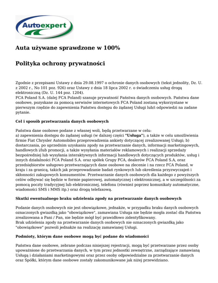 Auta używane sprawdzone w 100% Polityka ochrony prywatności Zgodnie z przepisami Ustawy z dnia 29.08.1997 o ochronie danych osobowych (tekst jednolity, Dz. U. z 2002 r., No 101 poz. 926) oraz Ustawy z dnia 18 lipca 2002 r. o świadczeniu usług drogą elektroniczną (Dz. U. 144 poz. 1204). FCA Poland S.A. (dalej FCA Poland) szanuje prywatność Państwa danych osobowych. Państwa dane osobowe, pozyskane za pomocą serwisów internetowych FCA Poland zostaną wykorzystane w pierwszym rzędzie do zapewnienia Państwu dostępu do żądanej Usługi lub/i odpowiedzi na zadane pytanie. Cel i sposób przetwarzania danych osobowych Państwa dane osobowe podane z własnej woli, będą przetwarzane w celu: a) zapewnienia dostępu do żądanej usługi (w dalszej części "Usługa"), a także w celu umożliwienia firmie Fiat Chrysler Automobiles przeprowadzenia ankiety dotyczącej zrealizowanej Usługi; b) dostarczania, po uprzednim uzyskaniu zgody na przetwarzanie danych, informacji marketingowych, handlowych i/lub promocji, a także wysyłania materiałów reklamowych i realizacji sprzedaży bezpośredniej lub wysyłania interaktywnych informacji handlowych dotyczących produktów, usług i innych działalności FCA Poland S.A. oraz spółek Grupy FCA, dealerów FCA Poland S.A, oraz przedsiębiorstw usługowo przetwarzających dane osobowe na zlecenie i na rzecz FCA Poland, w kraju i za granicą, takich jak przeprowadzanie badań rynkowych lub określenia przyzwyczajeń i skłonności zakupowych konsumentów. Przetwarzanie danych osobowych dla każdego z powyższych celów odbywać się będzie w formie papierowej, automatycznej i elektronicznej, a w szczególności za pomocą poczty tradycyjnej lub elektronicznej, telefonu (również poprzez komunikaty automatyczne, wiadomości SMS i MMS itp.) oraz drogą telefaxową. Skutki ewentualnego braku udzielenia zgody na przetwarzanie danych osobowych Podanie danych osobowych nie jest obowiązkowe, jednakże, w przypadku braku danych osobowych oznaczonych gwiazdką jako "obowiązkowe", zamawiana Usługa nie będzie mogła zostać dla Państwa zrealizowana a Pani / Pan, nie będzie mógł być prawidłowo zidentyfikowany. Brak udzielenia zgody na przetwarzanie danych osobowych nie oznaczonych gwiazdką jako "obowiązkowe" pozwoli jednakże na realizację zamawianej Usługi. Podmioty, którym dane osobowe mogą być podane do wiadomości Państwa dane osobowe, zebrane podczas niniejszej rejestracji, mogą być przetwarzane przez osoby upoważnione do przetwarzania danych, w tym przez jednostki zewnętrzne, zarządzające zamawianą Usługą i działaniami marketingowymi oraz przez osoby odpowiedzialne za przetwarzanie danych oraz Spółki, którym dane osobowe zostały zakomunikowane jak niżej przewidziano. Podmioty, którym dane osobowe mogą być udostępniane Państwa dane osobowe mogą być podane do wiadomości osobom trzecim w przypadku, gdy będą tego wymagały przepisy prawa, aby spełnić żądania pochodzące od władz publicznych, które mają prawo zażądać takich informacji. Poza tym, po uprzednim uzyskaniu zgody na przetwarzanie danych osobowych, dane osobowe mogą zostać przekazane również do Sieci sprzedaży FCA Poland S.A. oraz do innych Spółek należących do Grupy FCA, które będą przetwarzać dane w celach związanych z promocjami odnośnych produktów i usług. Podmiot posiadający prawa do przetwarzania danych oraz osoby odpowiedzialne za przetwarzanie danych Prawo do przetwarzania Państwa danych osobowych posiada FCA Poland S.A. z siedzibą w Bielsku-Białej, ul. Grażyńskiego 141. Twoje prawa Zgodnie z przepisami Ustawy z dnia 29.08.1997 o ochronie danych osobowych (tekst jednolity, Dz. U. z 2002 r., No 101 poz. 926) oraz Ustawy z dnia 18 lipca 2002 r. o świadczeniu usług drogą elektroniczną (Dz. U. 144 poz. 1204). Zapewniamy Pani /Panu prawo wglądu do Państwa danych osobowych, natychmiastowej aktualizacji lub usunięcia danych osobowych, wnoszenia sprzeciwu dotyczącego przetwarzania danych osobowych do celów marketingowych, handlowych lub reklamowych zwracając się do: FCA Poland S.A. Dyrekcja Handlowa, Al. Wyścigowa 6, 02–681 Warszawa.